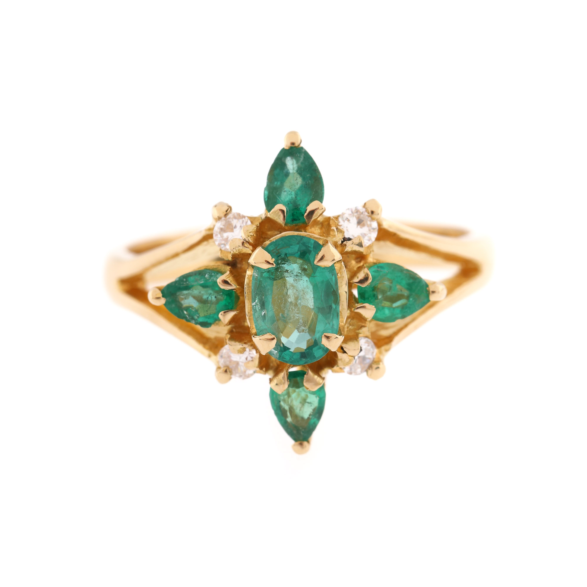 5 smaralde (1 oval fațetat, 4 pară fațetate), culoare verde, claritate SI-moderately included, cca. 1,00 ct. și 4 diamante rotunde briliant, culoare K-L, claritate SI, cca. 0,12 ct.