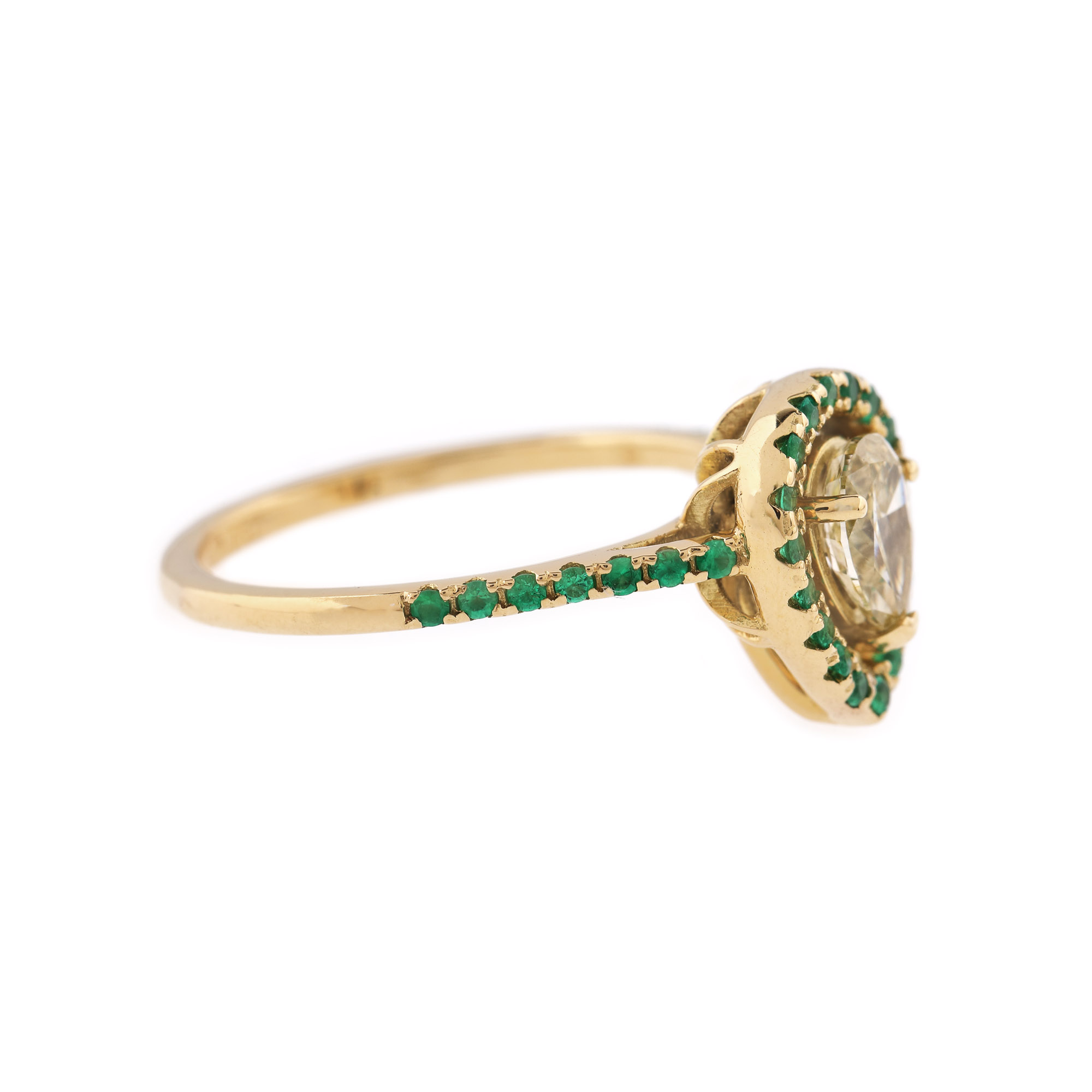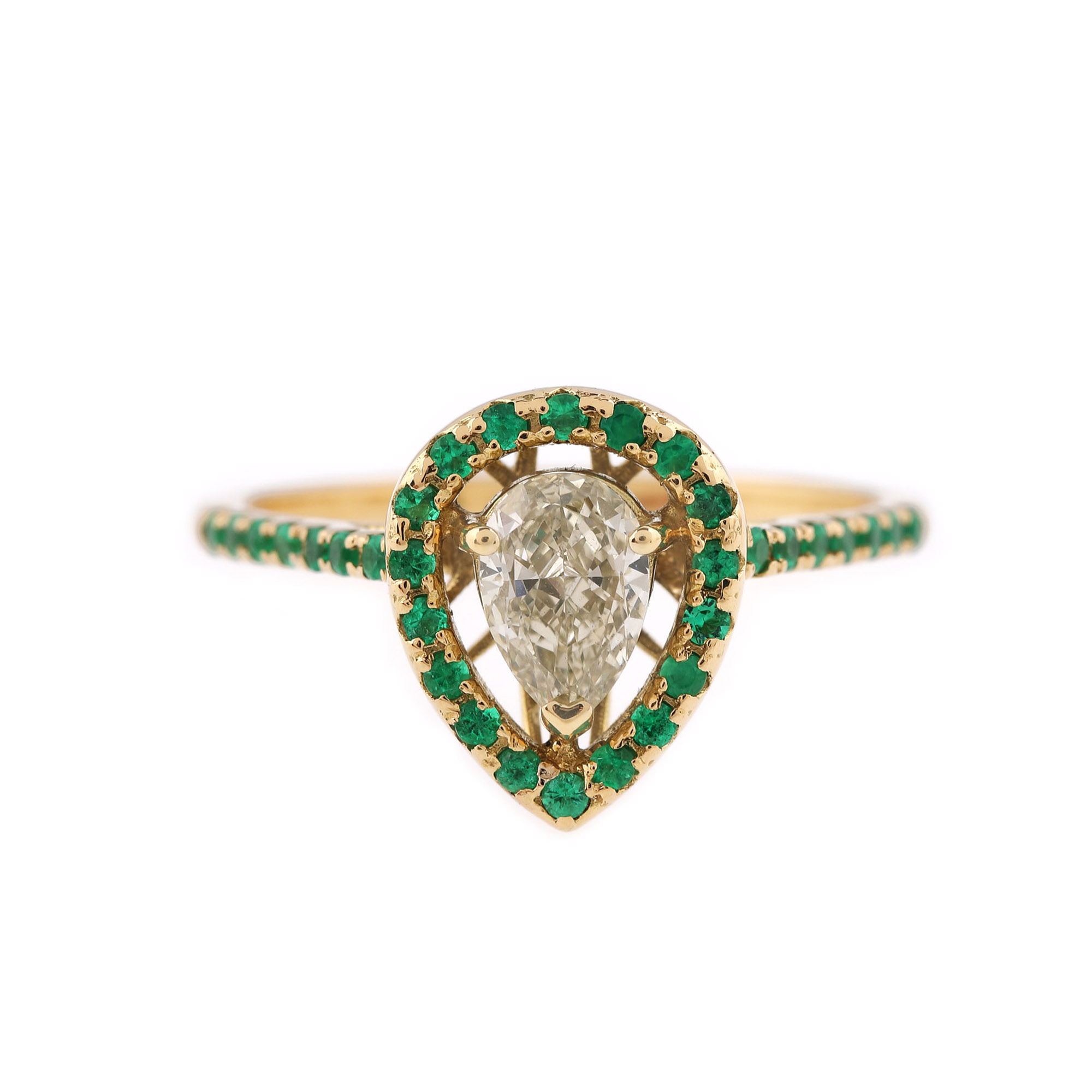 1 diamant pară fațetat, culoare fancy yellow, claritate VS1, cca. 0,57 ct. și 32 smaralde rotund fațetate, culoare verde, claritate SI-moderately included, cca. 0,20 ct.