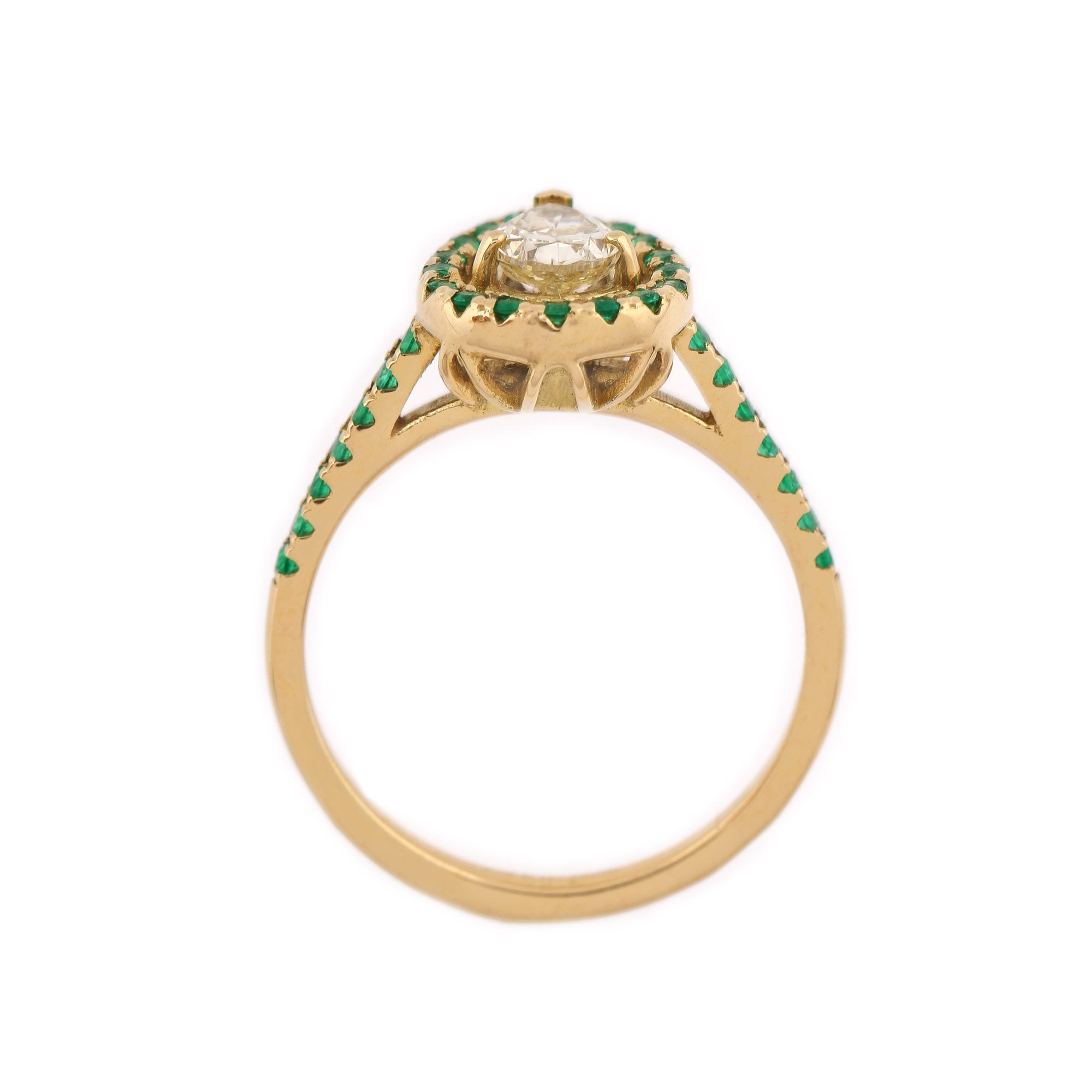 112. Inel din aur, ornat central cu un diamant yellow, anturat de smaralde