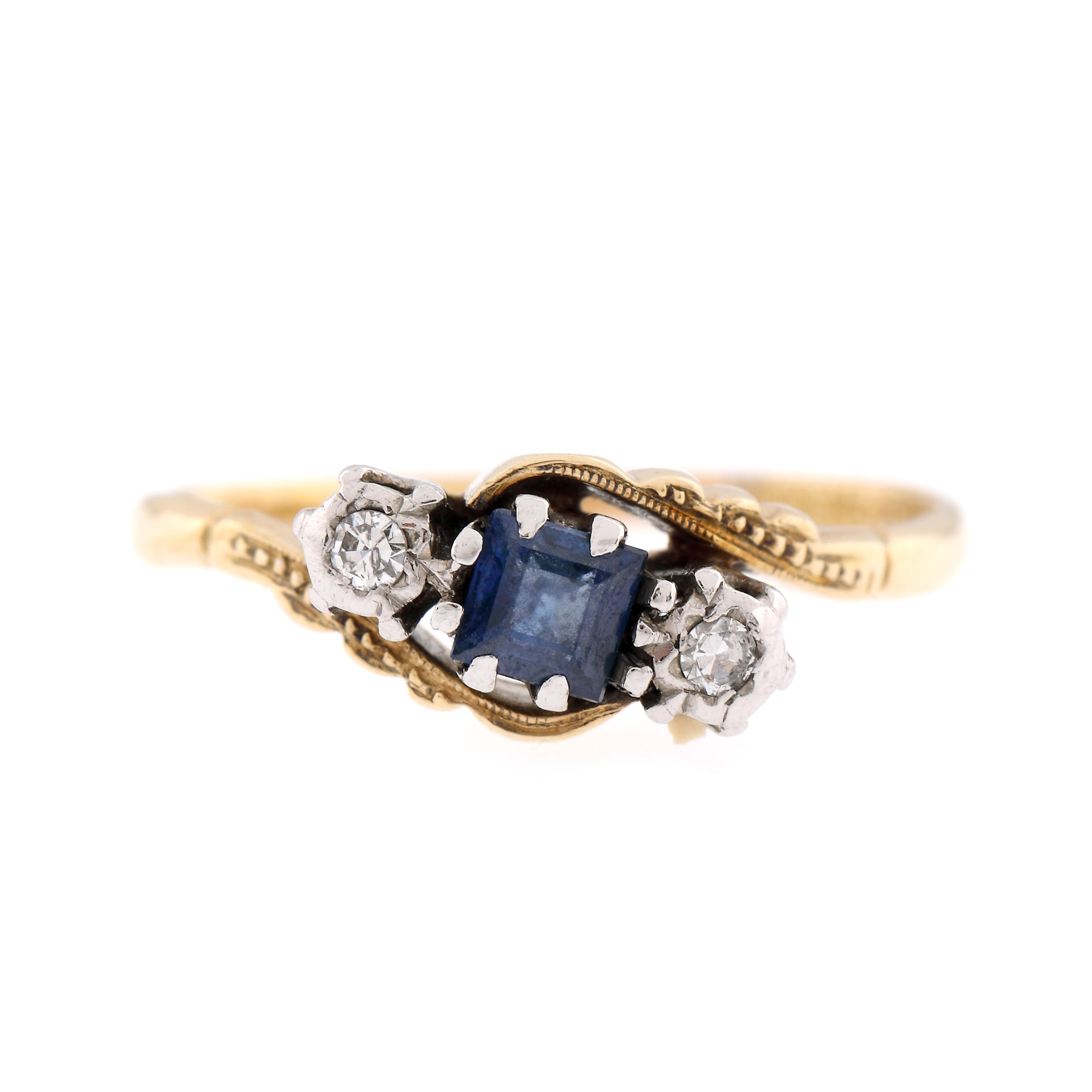 1 safir pătrat step cut, culoare albastru, claritate eye-clean, cca. 0,26 ct. și 2 diamante single cut, culoare H-I, claritate I1, cca. 0,04 ct.