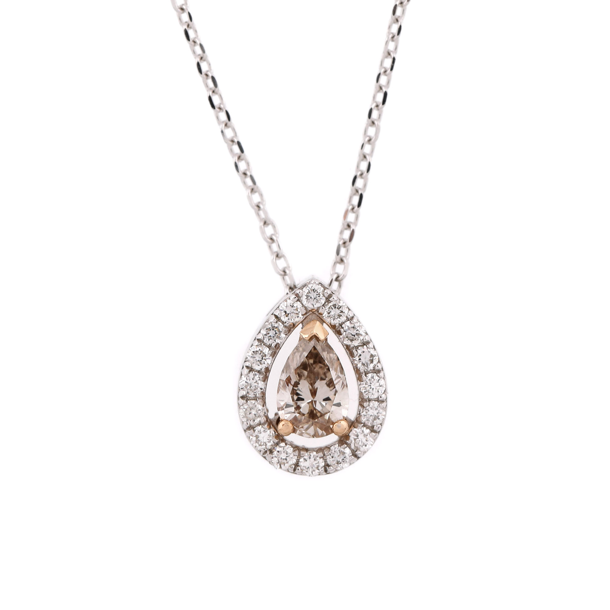 100. Lanț cu pandantiv din aur alb, decorat cu diamant brownish-champagne pară
