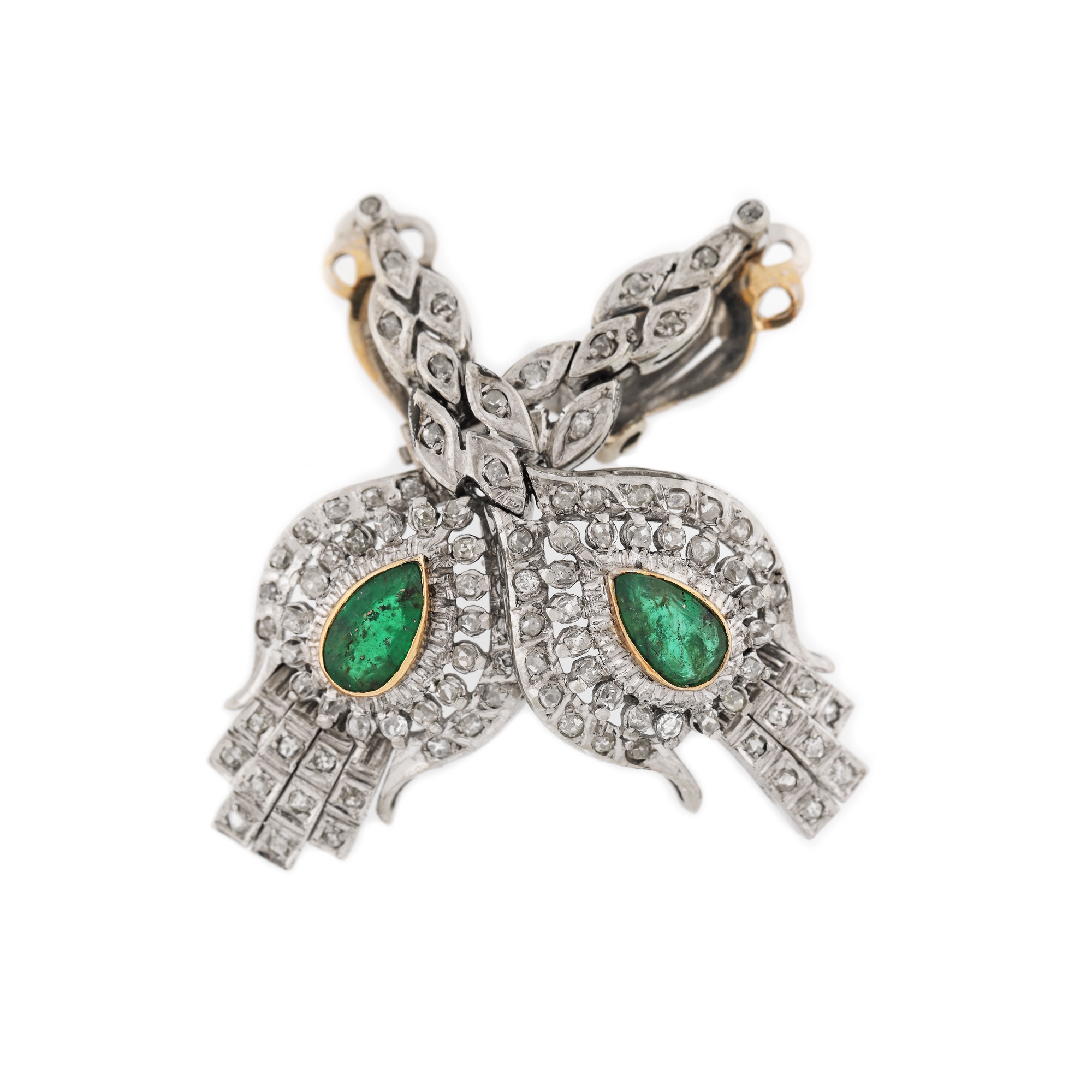 102 diamante (rose cut, single cut, old mine cut), culoare H-L, claritate VS-I1, cca. 1,10 ct. și 2 smaralde pară fațetate, culoare verde, claritate moderately included, cca. 1,00 ct.