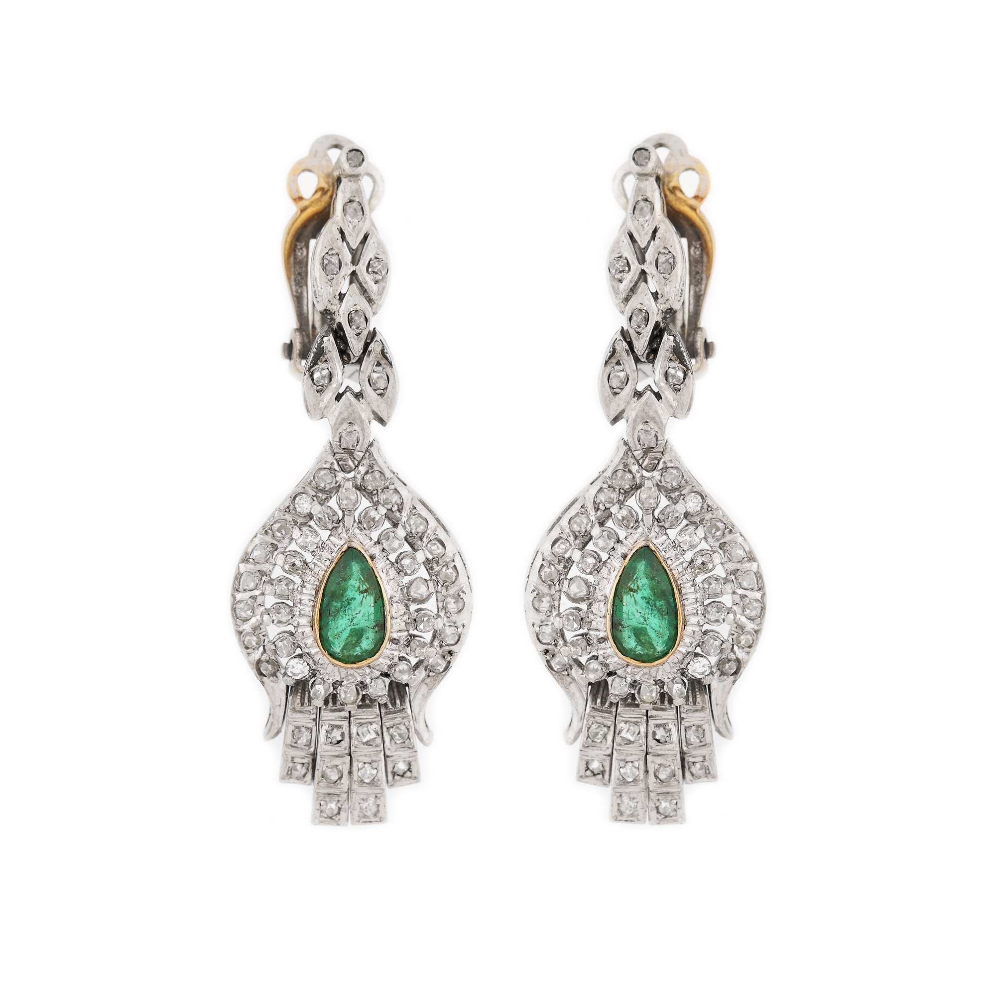 92. Pereche de cercei clips, din aur în două culori, decorată cu smaralde anturate de diamante