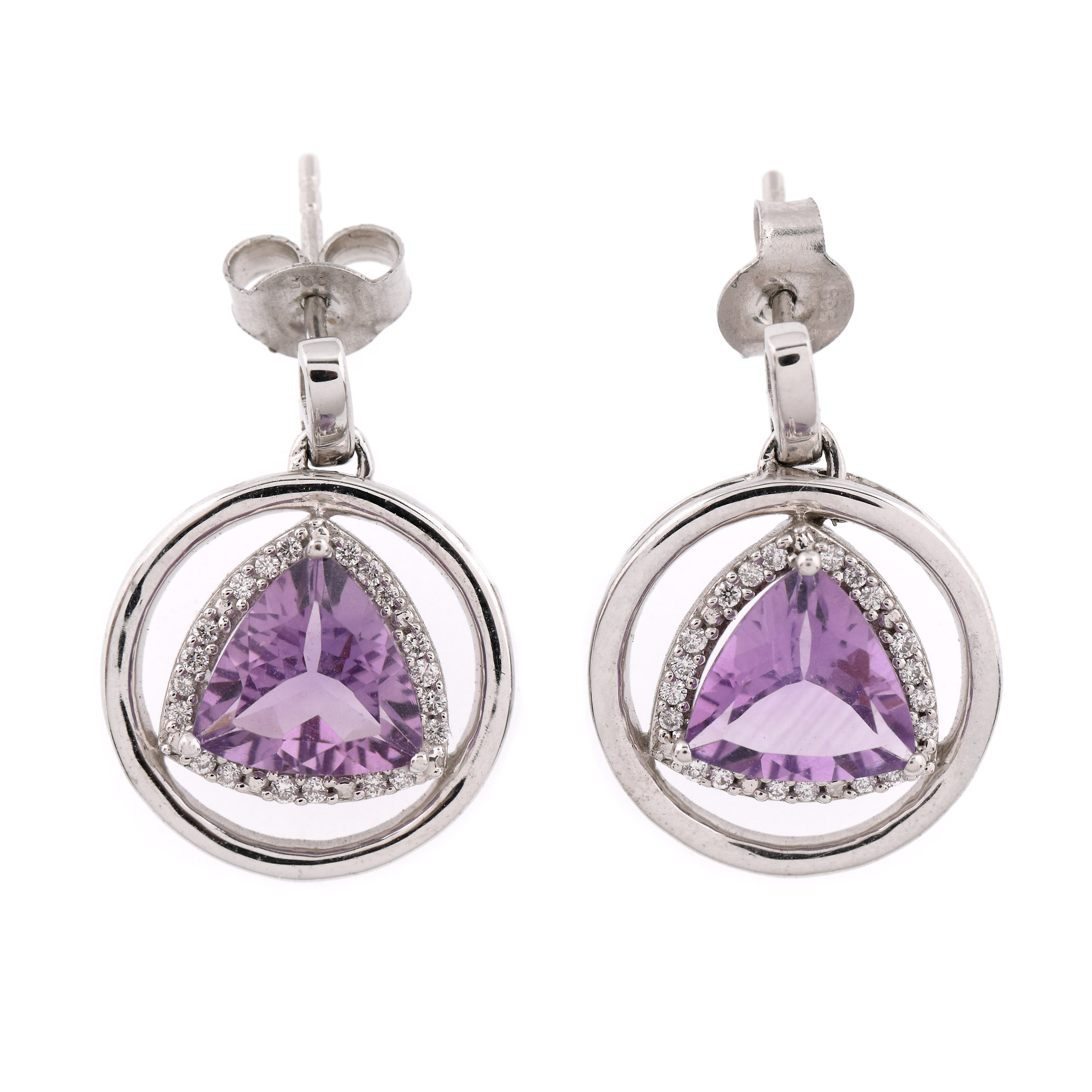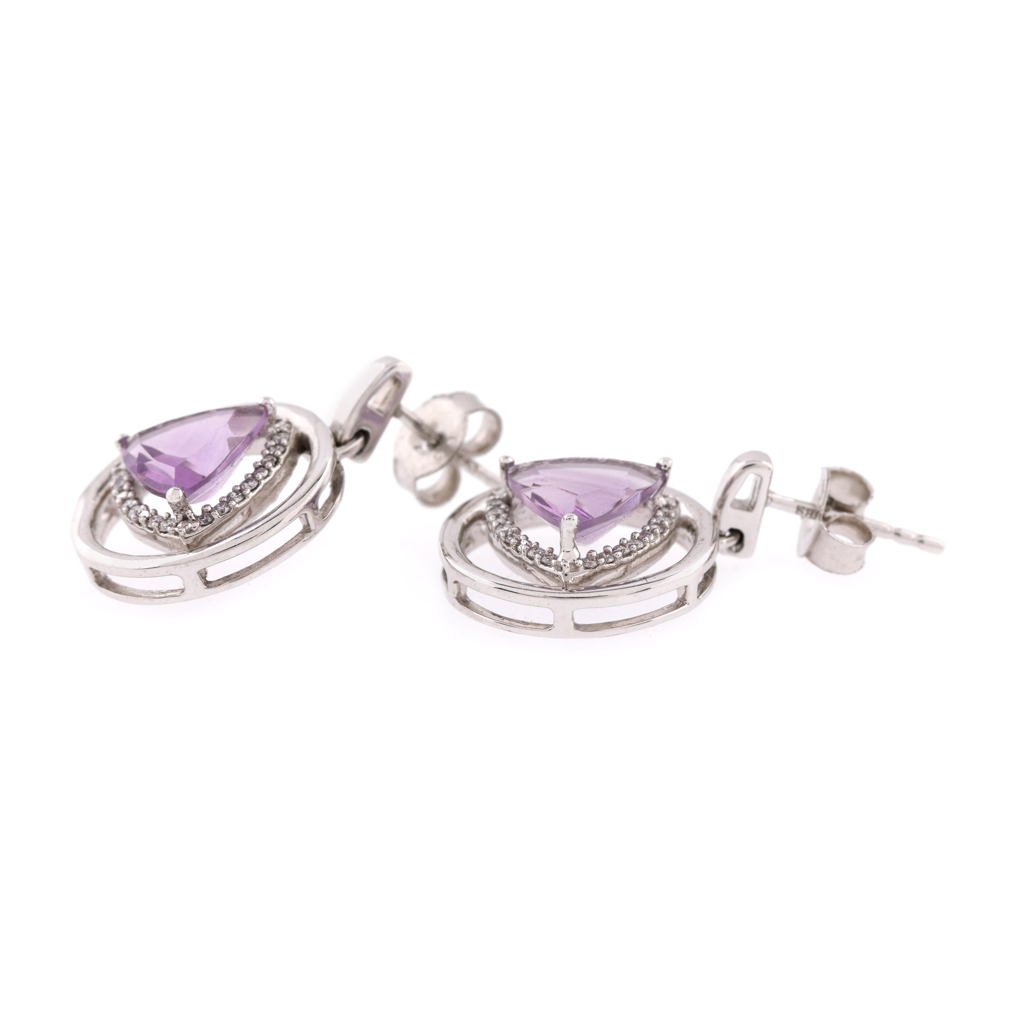 121. Pereche de cercei din aur alb, decorată central cu ametiste anturate de diamante