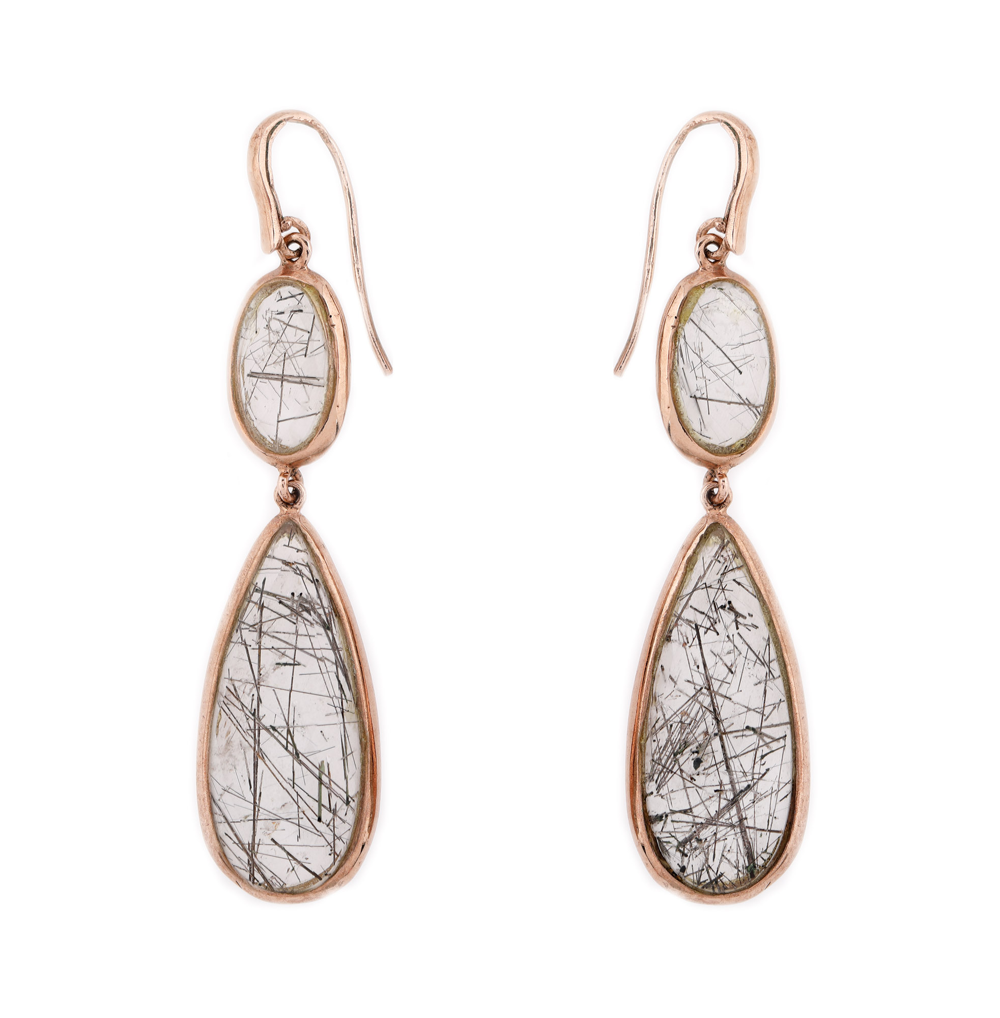 143. Pereche de cercei din aur roz, decorată cu cuarțuri cu incluziuni negre de turmalină