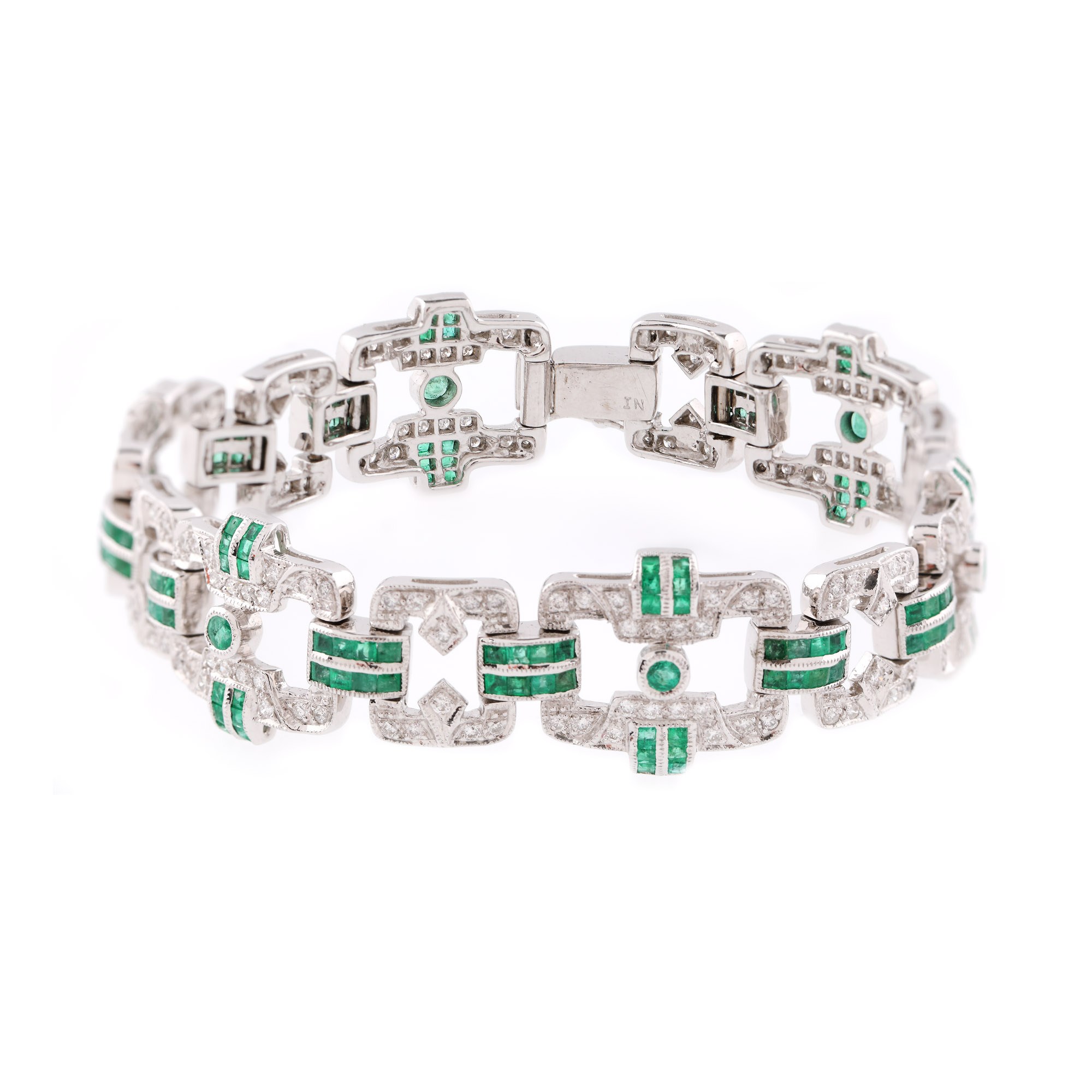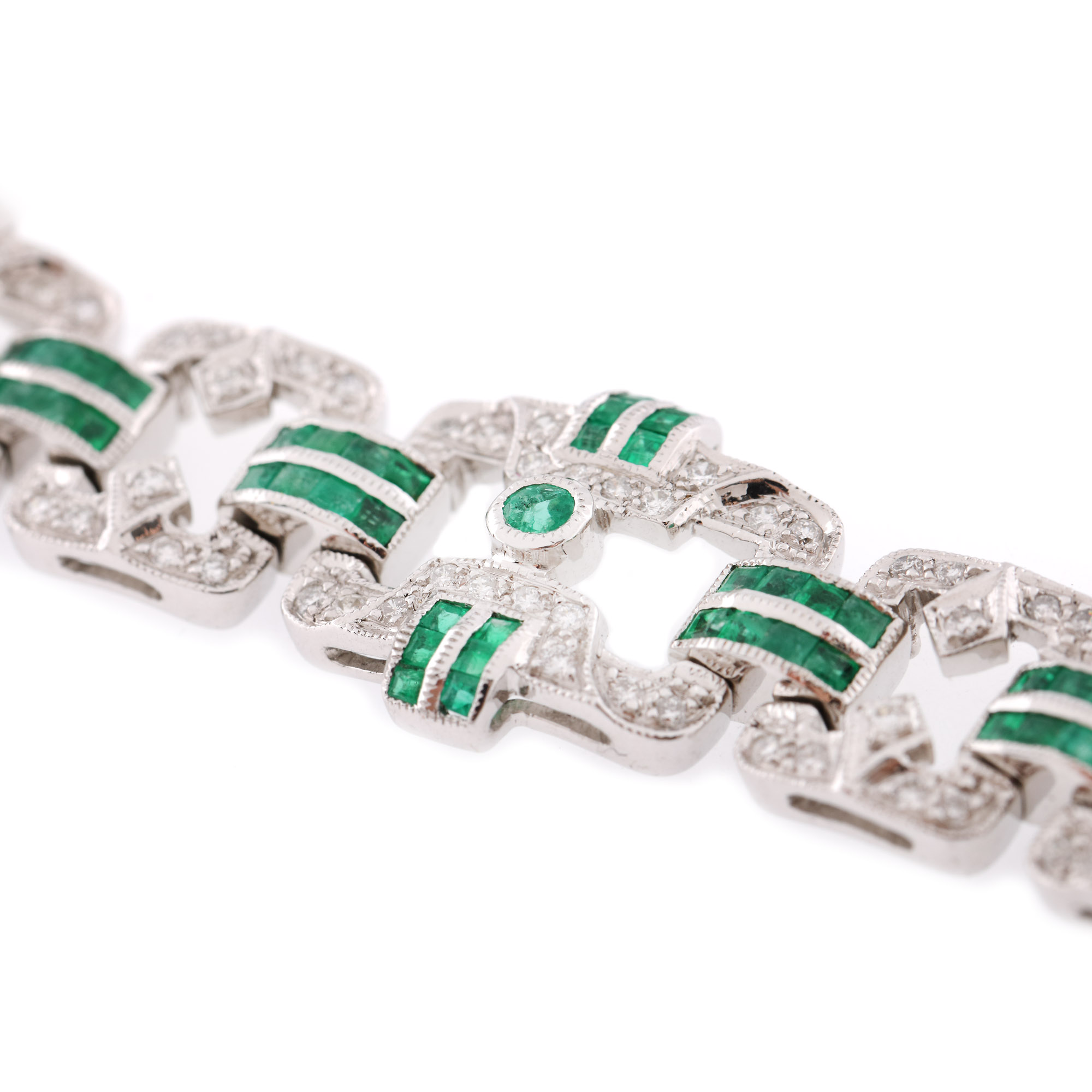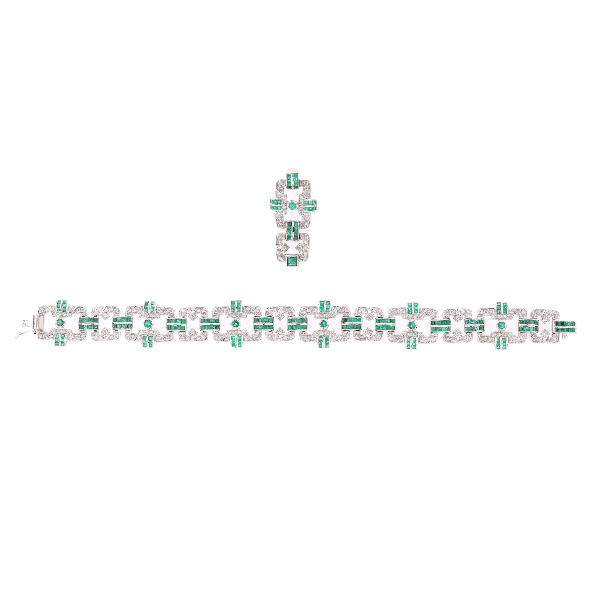 131. Set din aur alb, format din brățară și pandantiv, în manieră Art Deco, ornat cu smaralde și diamante