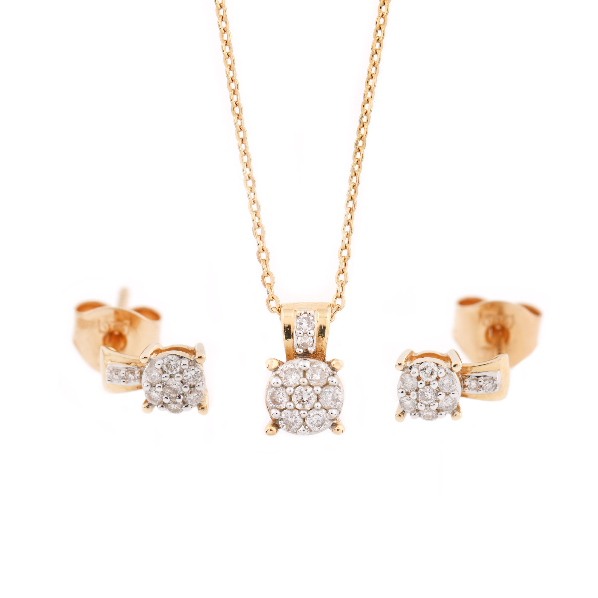 55. Set din aur, compus din pereche de cercei și lanț cu pandantiv, decorat cu diamante