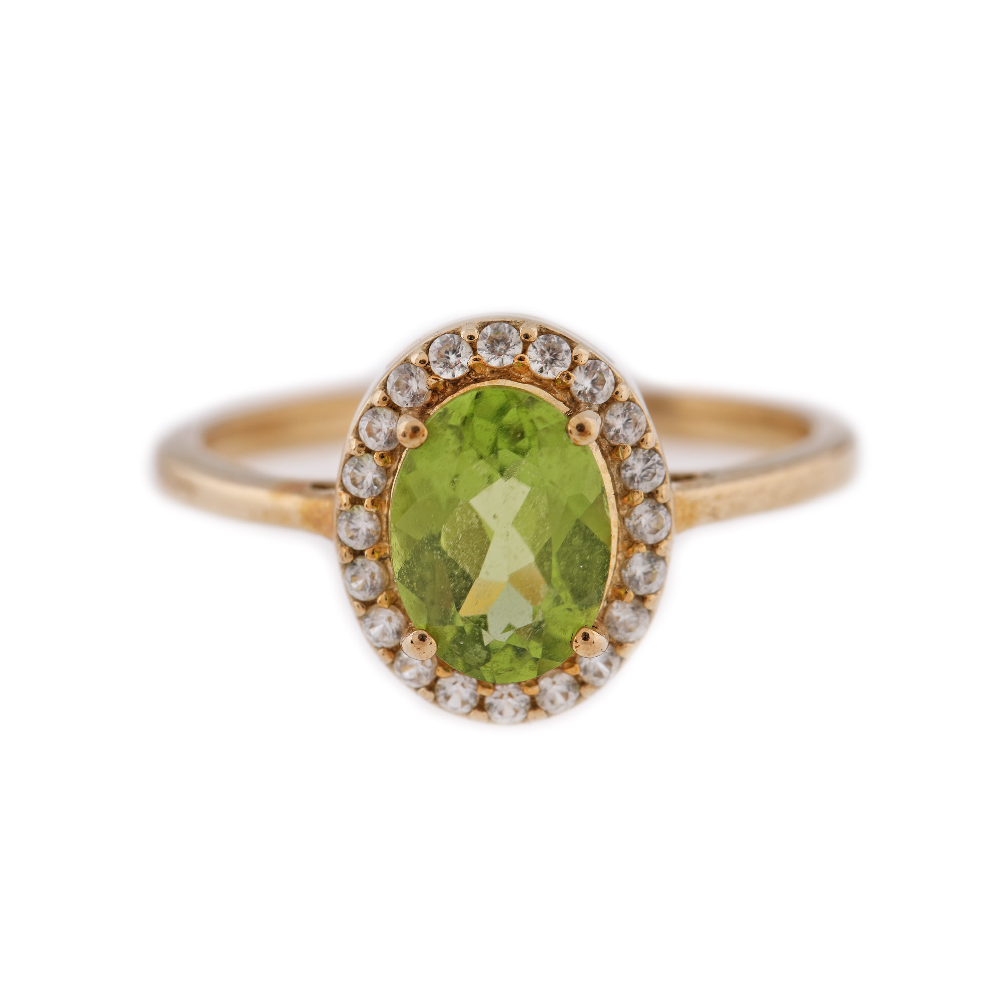2 peridote oval fațetate, culoare verde-gălbui, claritate eye-clean, cca. 2,8 ct. și 40 topaze rotund fațetate, albe, claritate eye-clean, cca. 0,32 ct.