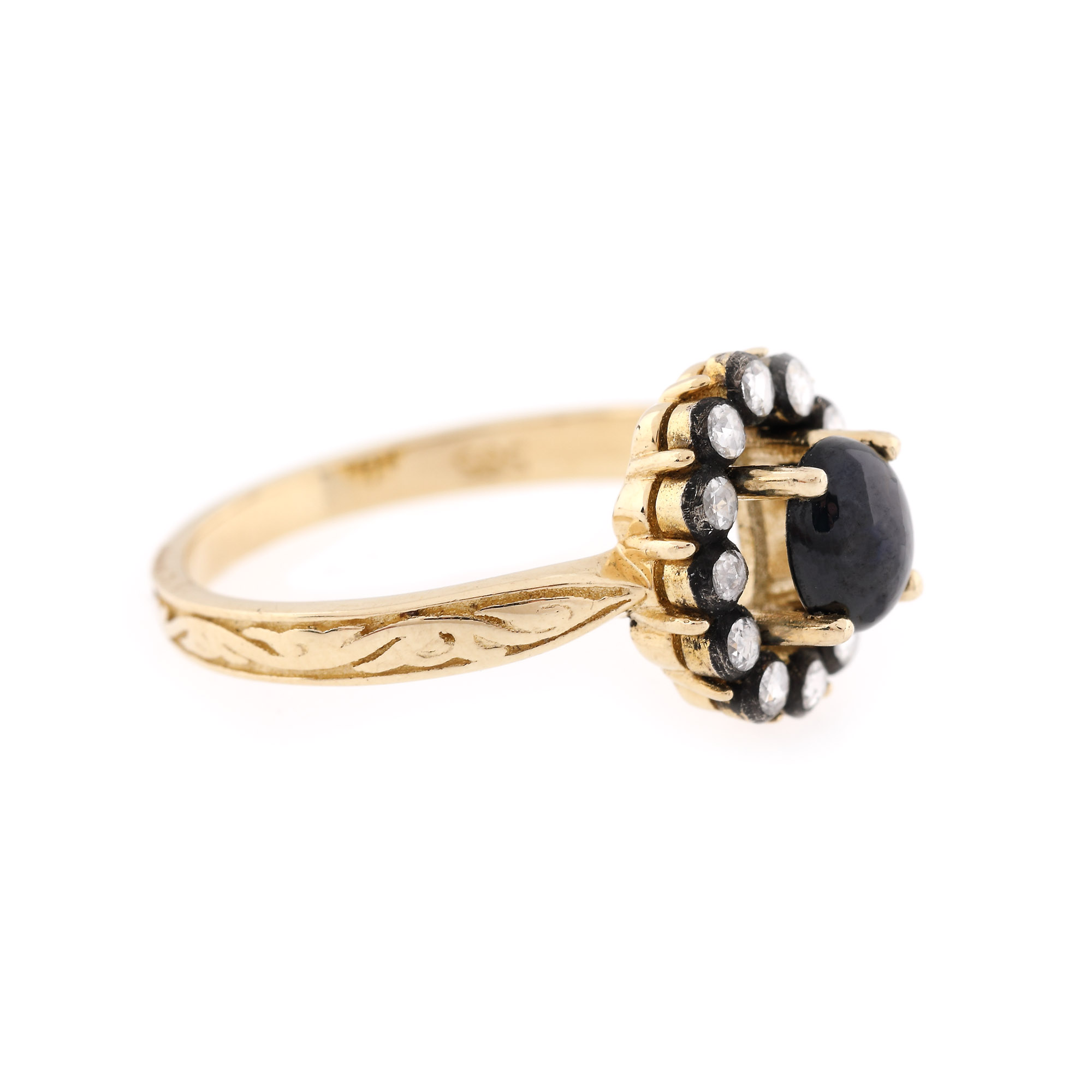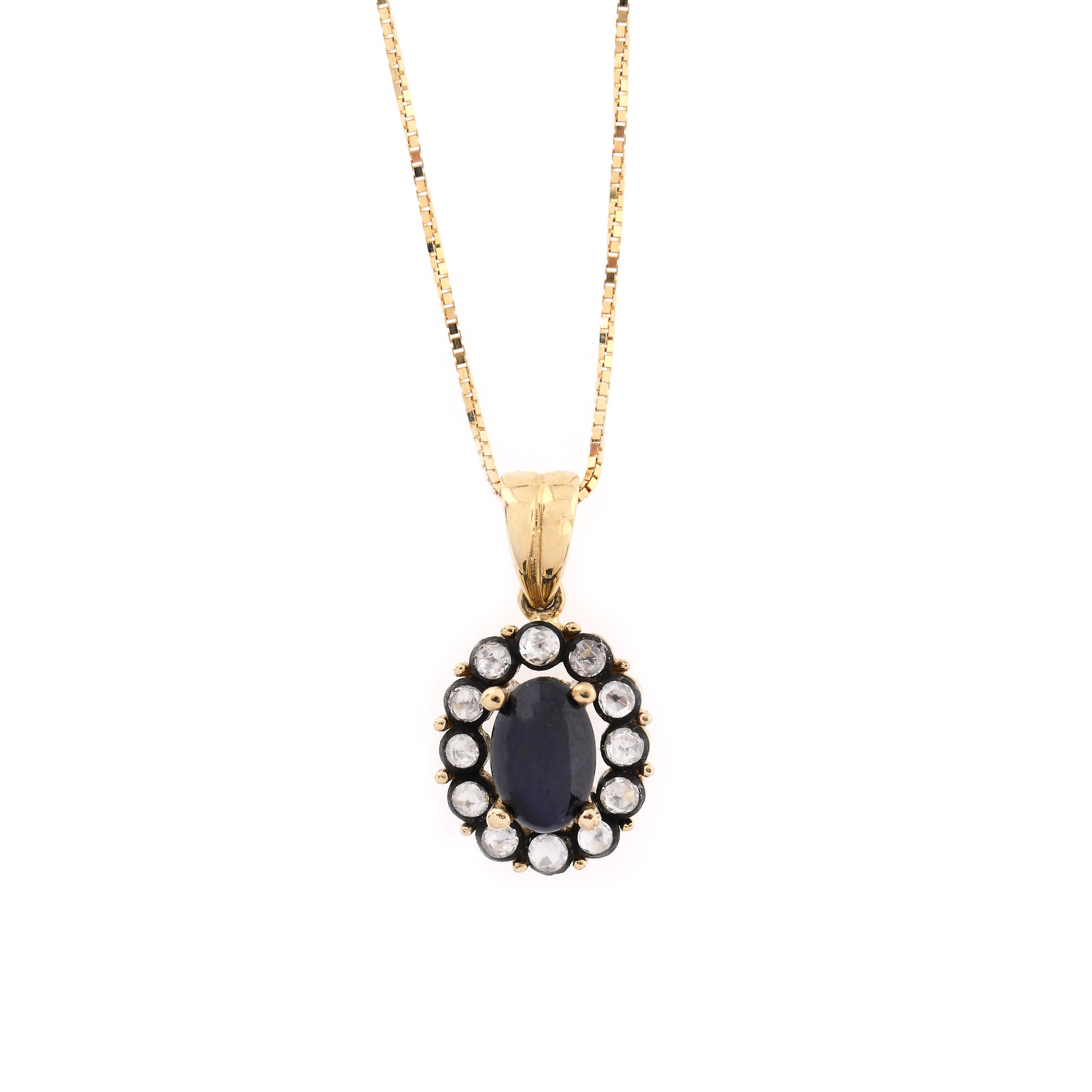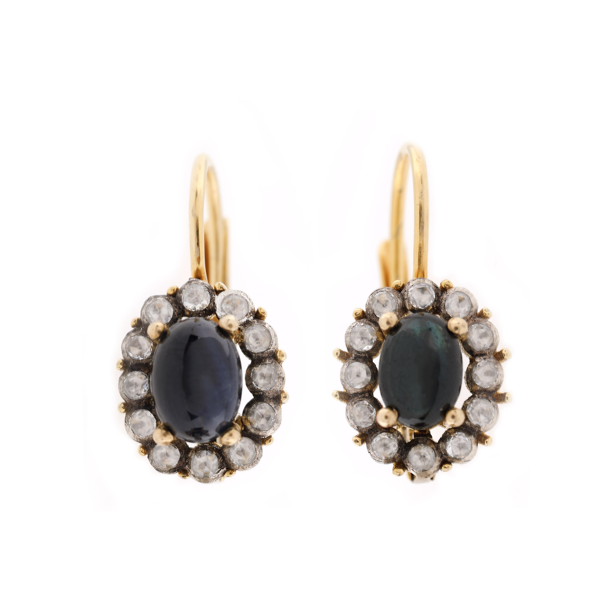 4 safire oval caboșon, culoare albastru, claritate SI-moderately included, cca. 2,8 ct. și 48 diamante rose cut, culoare L-M, claritate VS-SI, cca. 0,58 ct.