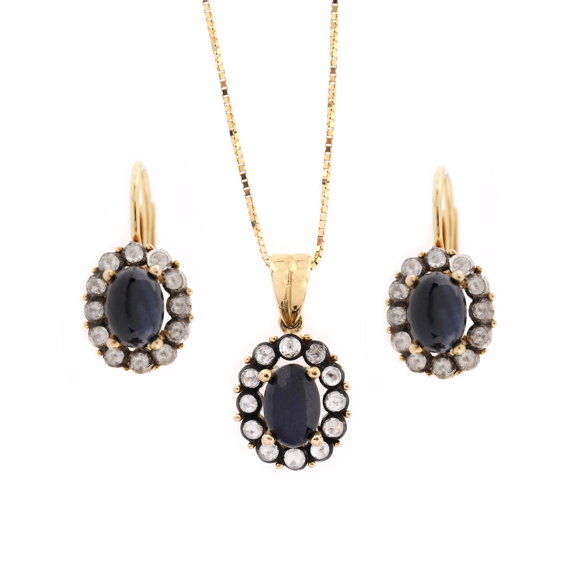 69. Set din aur, format din pereche de cercei, lanț cu pandantiv și inel, decorat cu safire și diamante