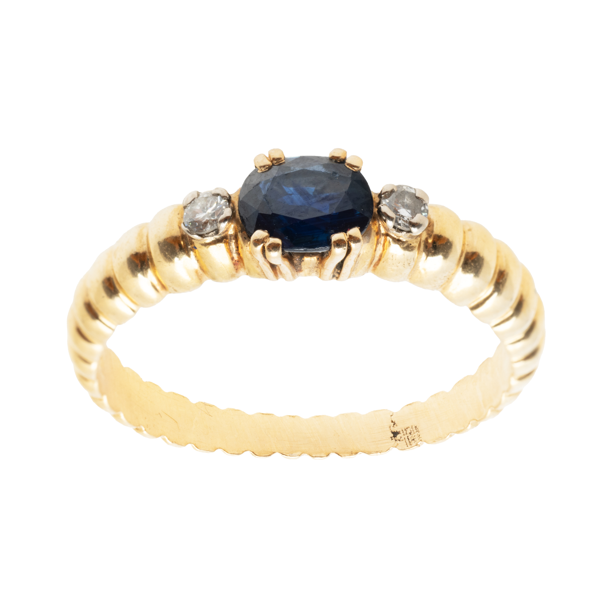 1 safir oval fațetat, culoare albastru, claritate SI, cca. 0,5 ct. și 2 diamante rotunde briliant, culoare H-I, claritate I1, cca. 0,07 ct.