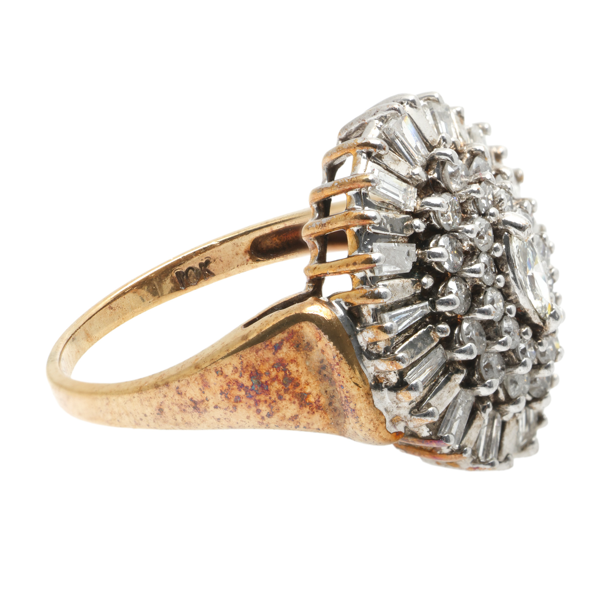 41 diamante (1 marchiz, 14 baghete și 26 rotunde briliant); culoare H-K, claritate SI1-I3, cca. 1,00 ct.