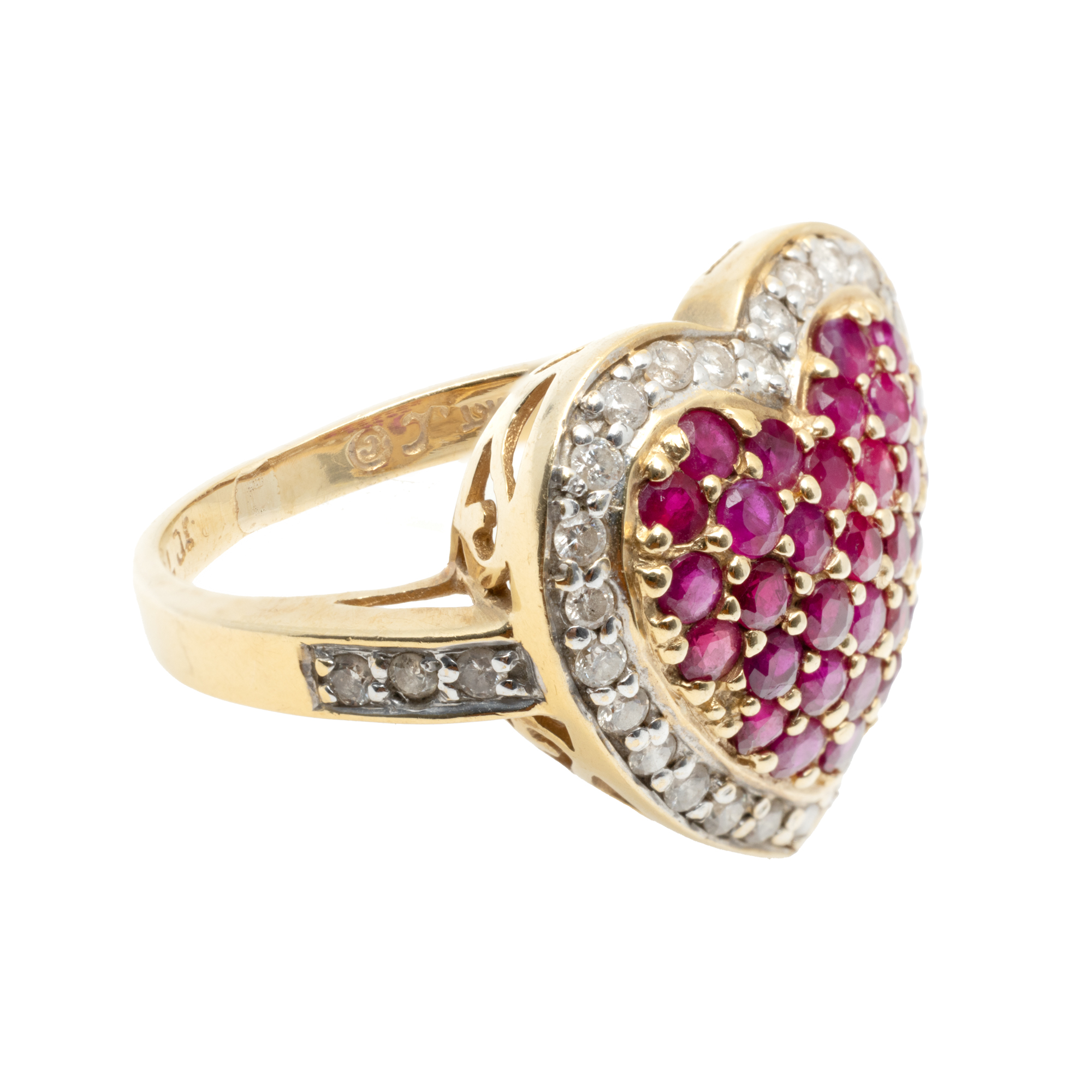 21. Inel din aur, sub formă de inimă, decorat cu rubine și diamante