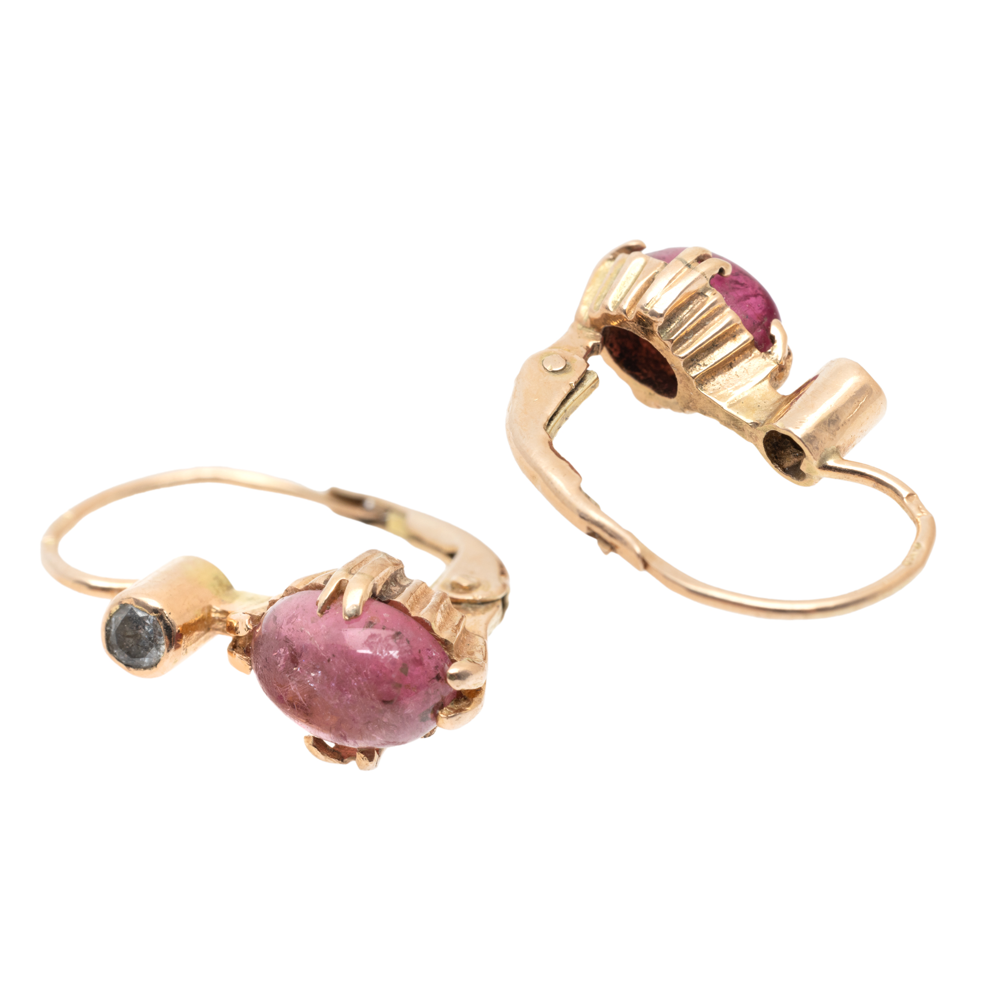 2 turmaline roz, ovale caboșon, culoare roz, claritate SI, cca. 2,4 ct. și 2 diamante rotunde briliant, culoare H-J, claritate I3, cca. 0,06 ct.
