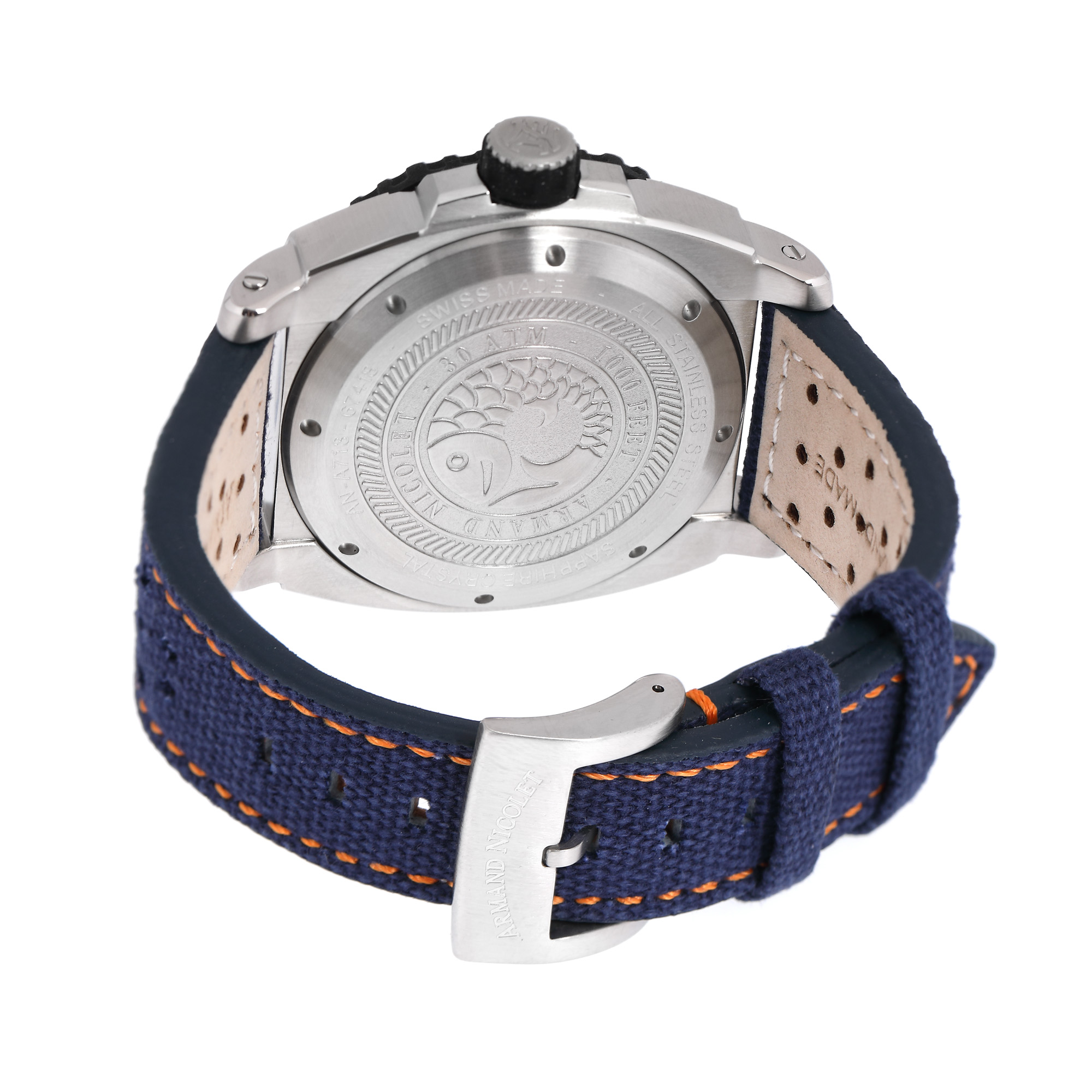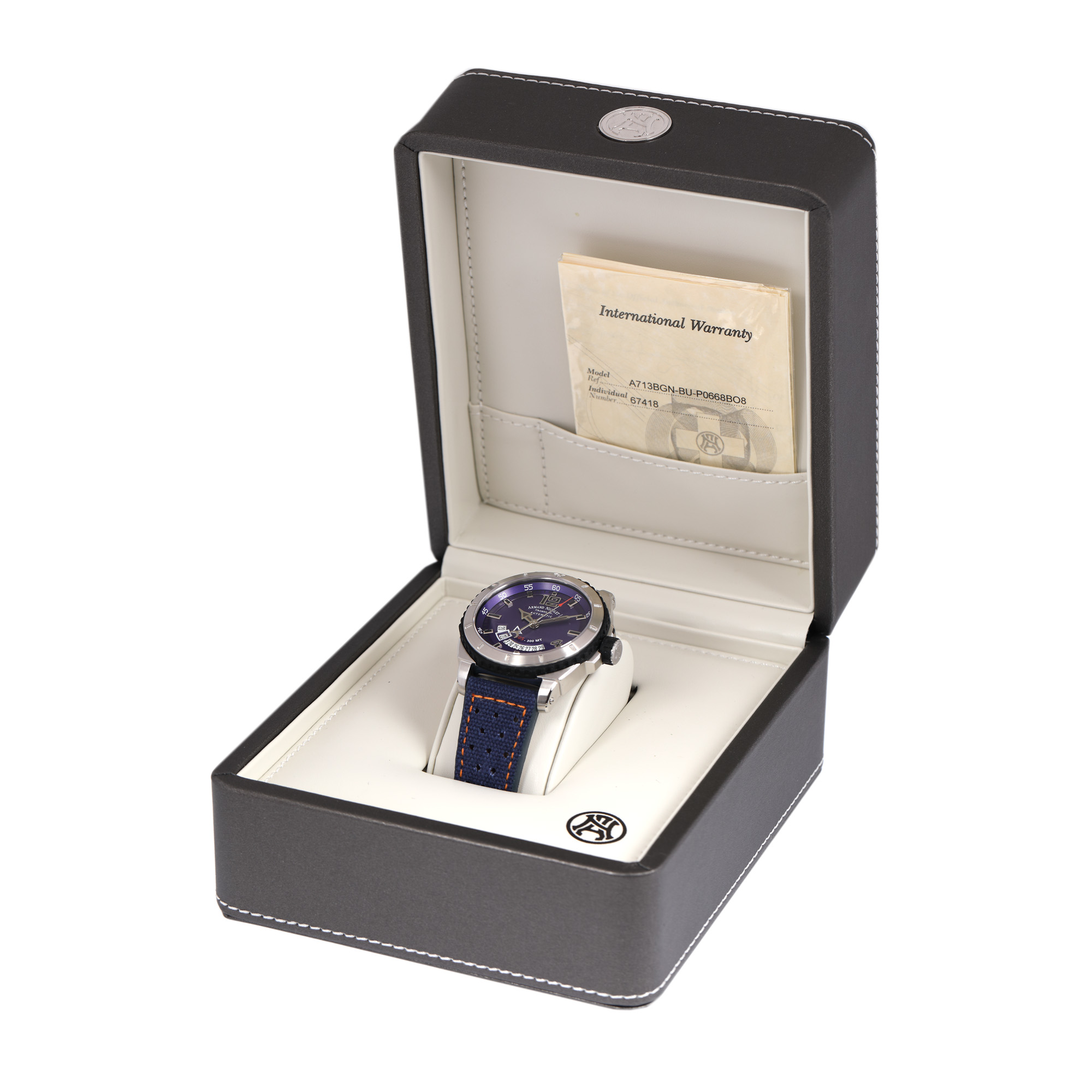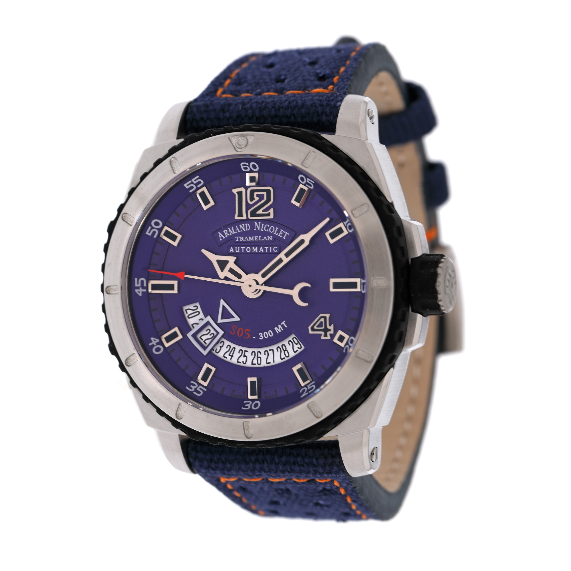 Ceas Armand Nicolet Tramelan, de mână, bărbătesc, nou, referință A713BGN-BU-P066. 8BO8. Mecanism automatic, calibrul AN2846-9. Cadran de culoare violet, indici numerale arabe pentru orele 12 și 4, baghete pentru restul orelor, registru pentru dată desfășurat între orele 4 și 8. Curea din material textil și cauciuc, de culoare albastrá, cu sistem de închidere clasic cu cataramă. Accesorii: cutia originală, certificat de garanție