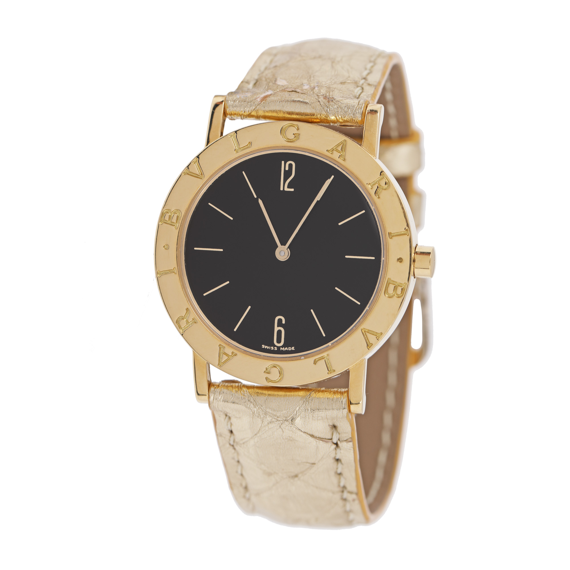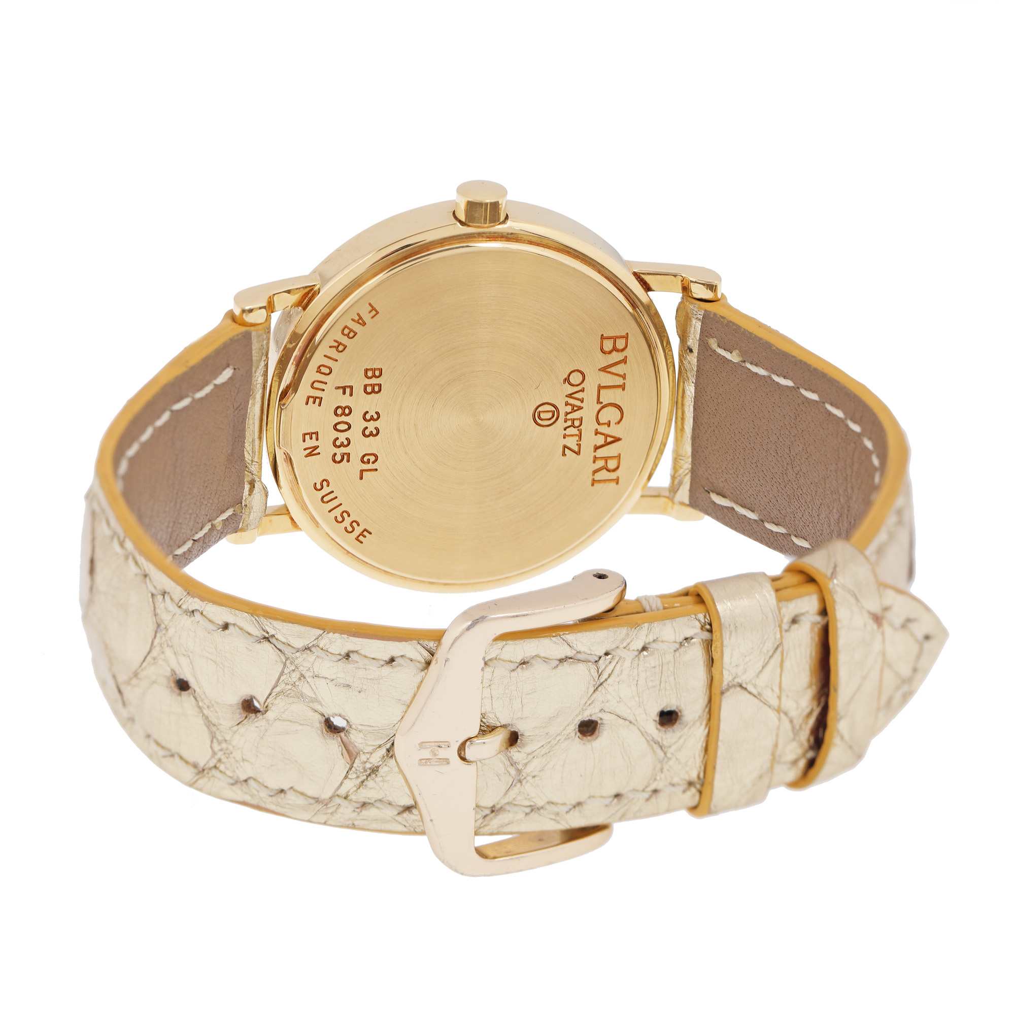 Ceas Bvlgari, din aur, de mână, de damă, referință BB 33 GL. Mecanism quartz, calibrul ETA 956032. Cadran de culoare negru, cu indici orari baghetă și numerale arabe pentru orele 12 și 6. Curea adăugată aftermarket, din piele, de culoare aurie, cu sistem de închidere clasic cu cataramă.