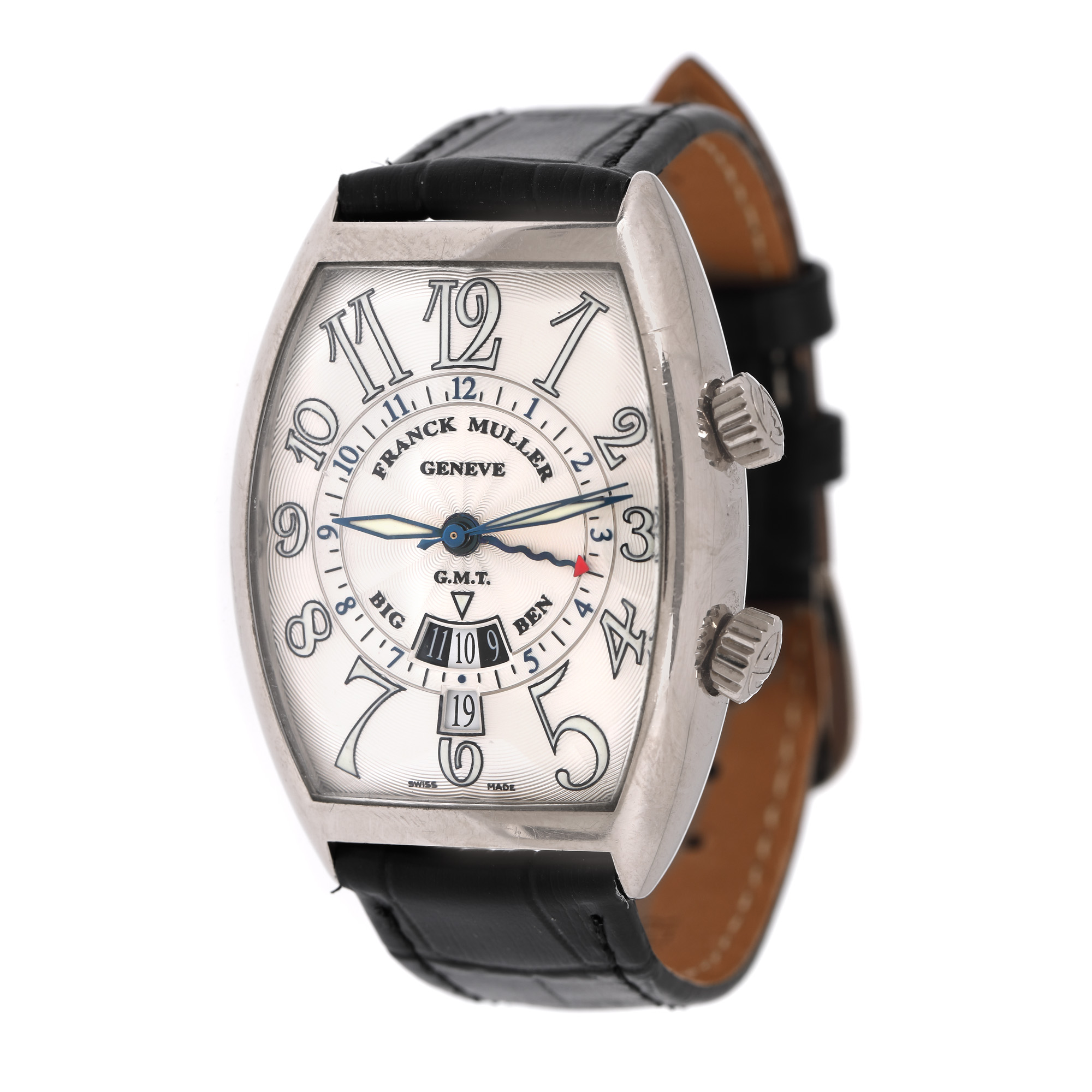 Ceas Frank Muller Big Ben GMT, din aur alb, de mână, bărbătesc, referință 7850. Mecanism automatic, calibrul 7850, cu funcție de GMT și alarmă. Cadran de culoare alb, indici cu numerale arabe, cu registele pentru dată și funcția GMT în dreptul orei 6. Curea adăugată aftermarket, din piele, de culoare neagră, cu sistem de închidere clasic.