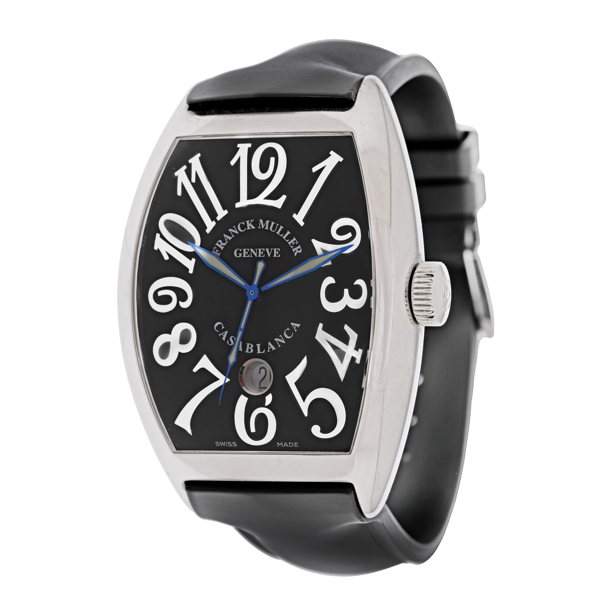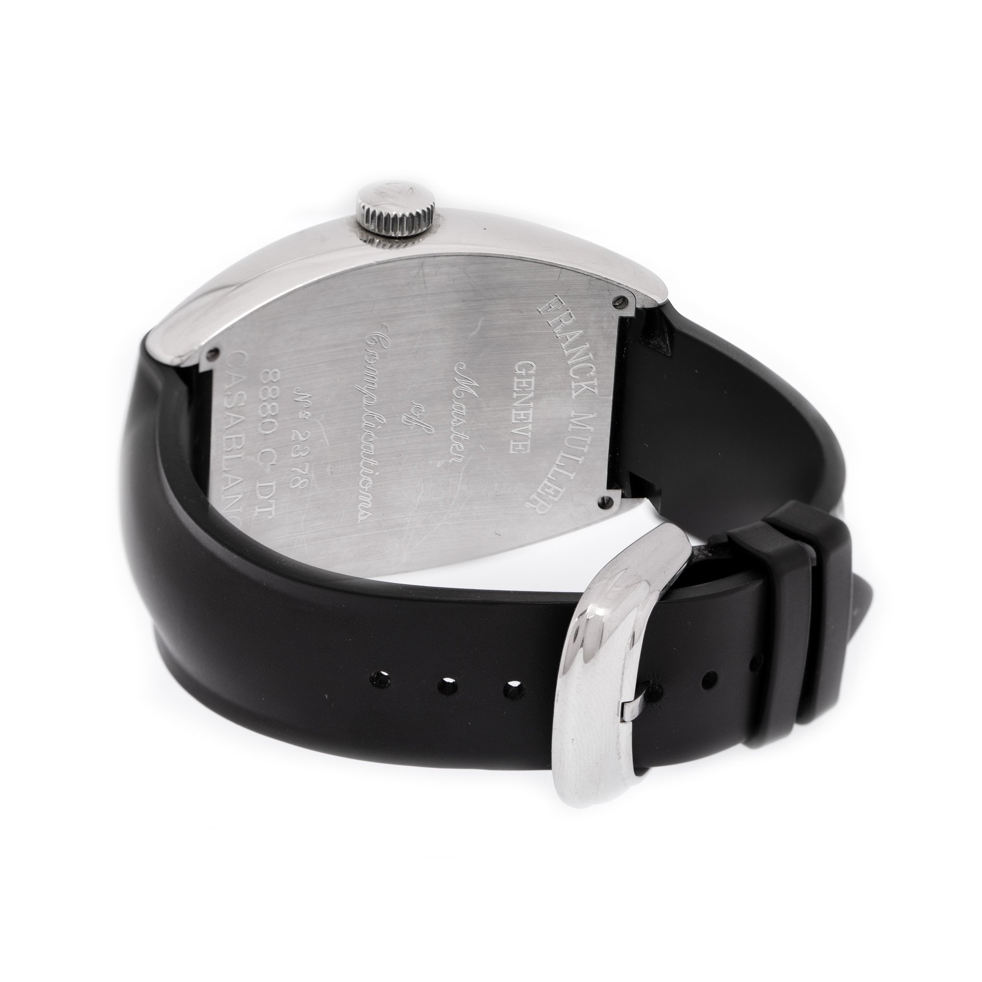 Ceas Franck Muller Casablanca, de mână, bărbătesc, referință 8880 C-DT. Mecanism automatic, calibrul 2852, cu funcție de dată. Cadran de culoare neagră, indici cu numerale arabe, cu registrul de dată în dreptul orei 6. Curea originală, din cauciuc, de culoare neagră, cu sistem de inchidere de tip clasic.