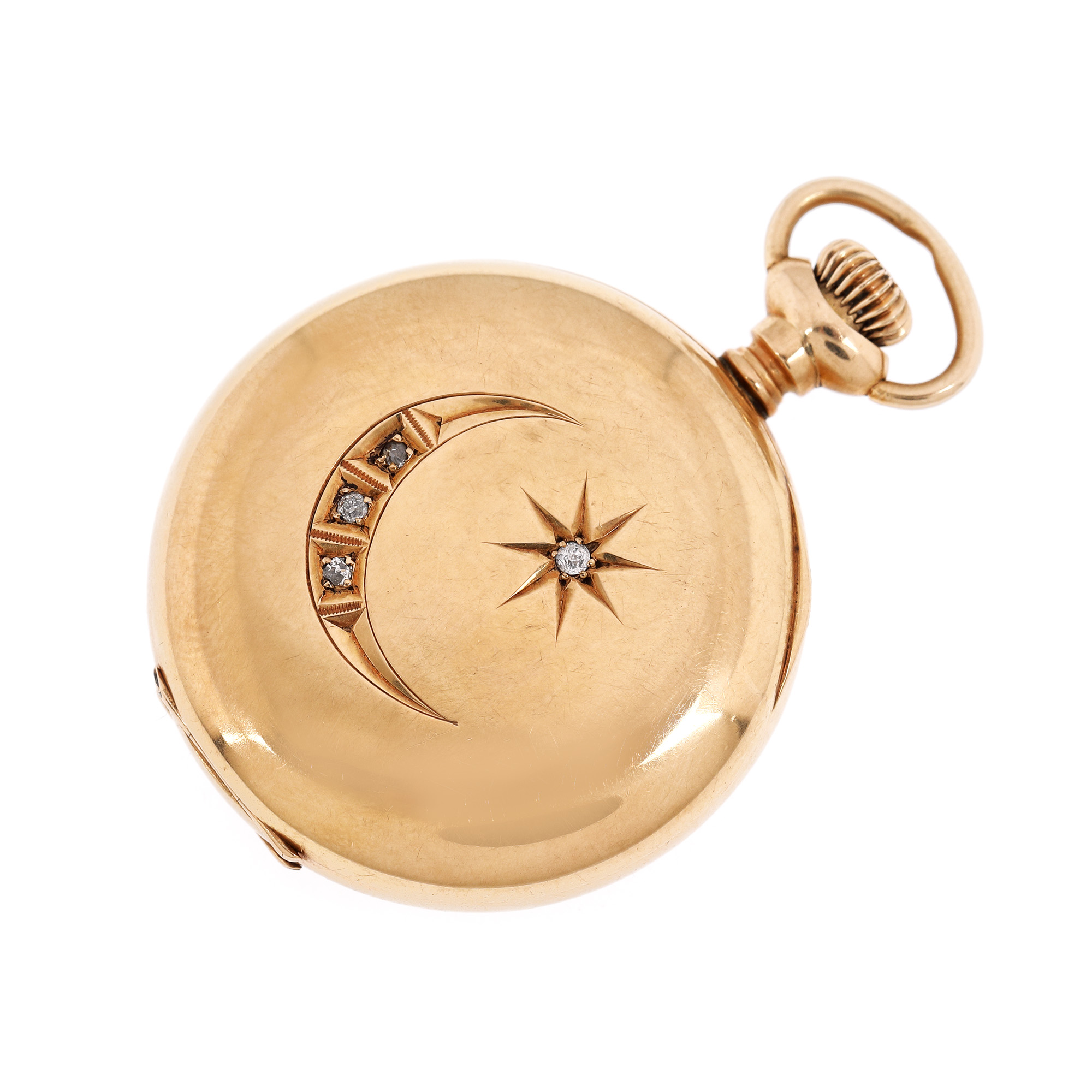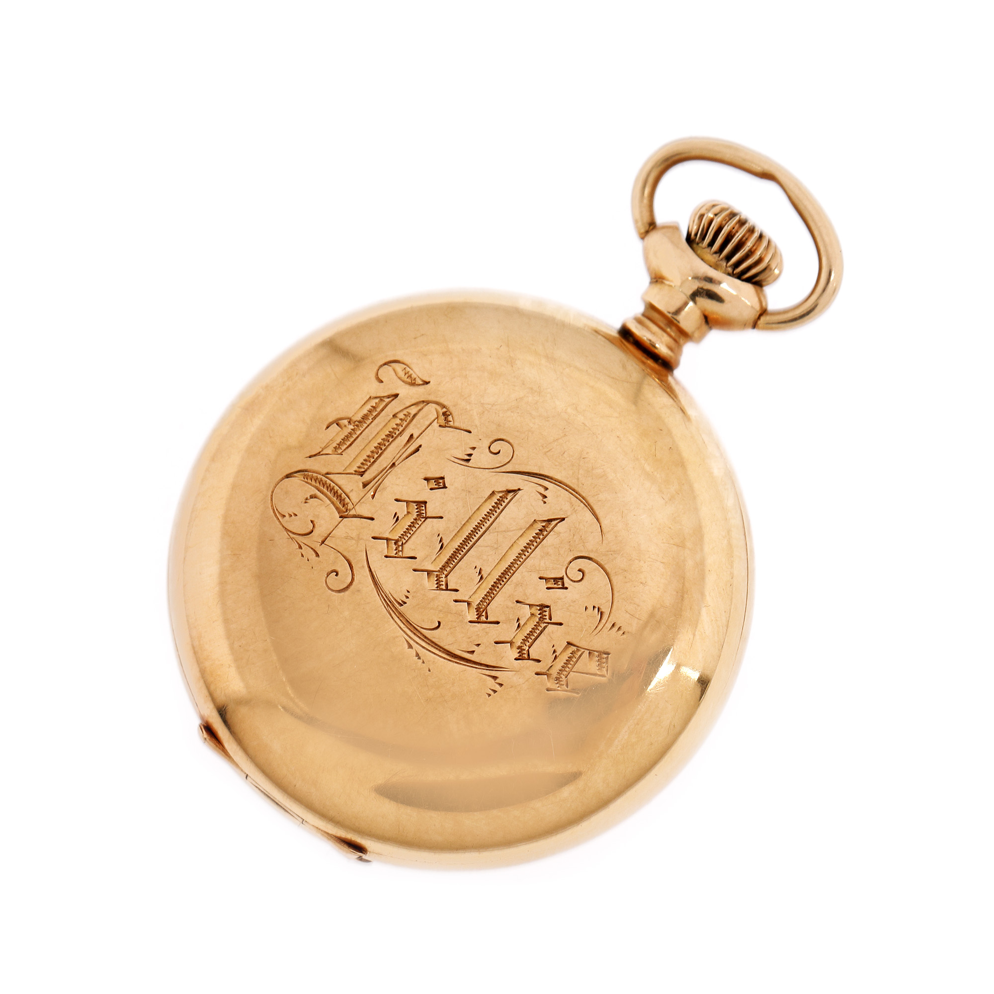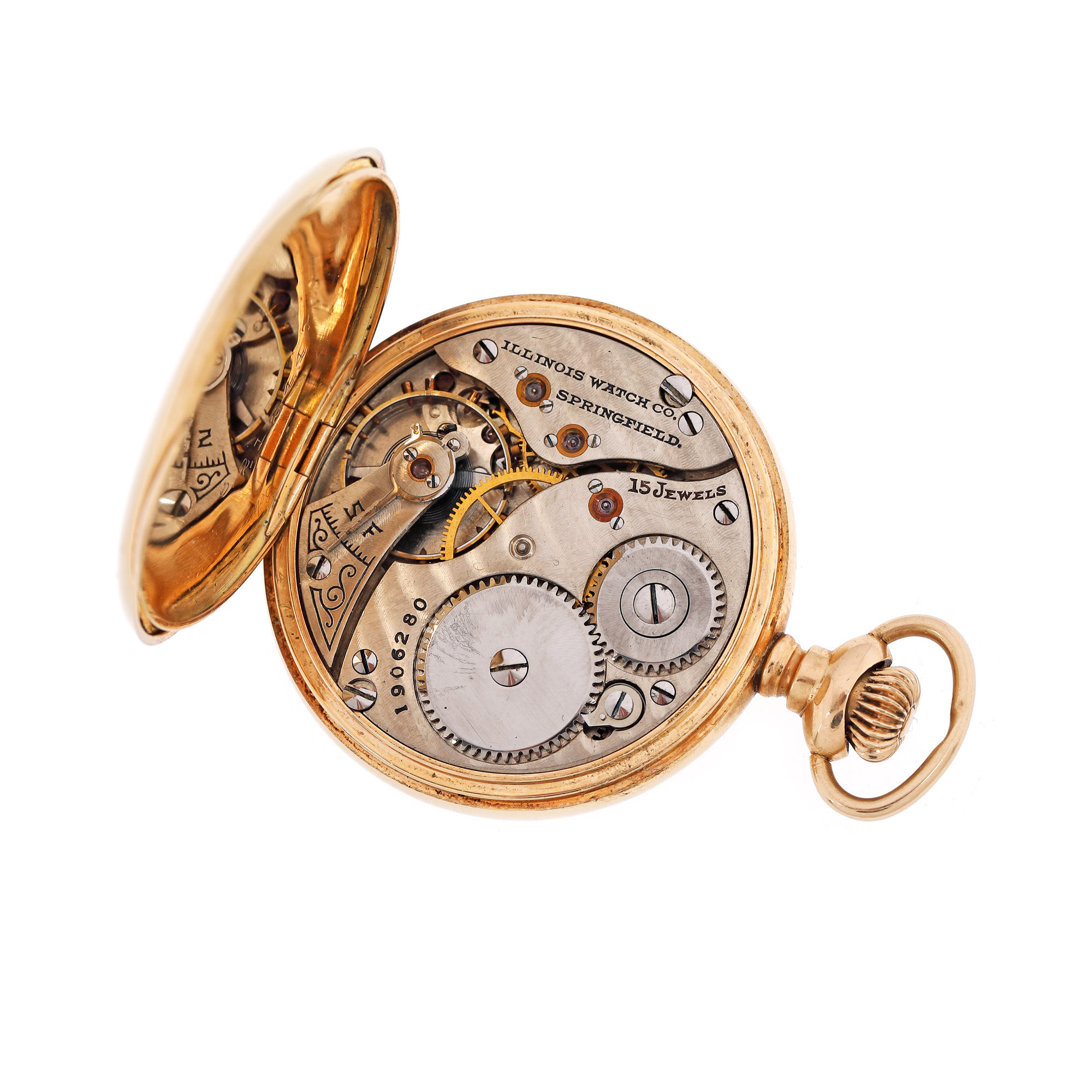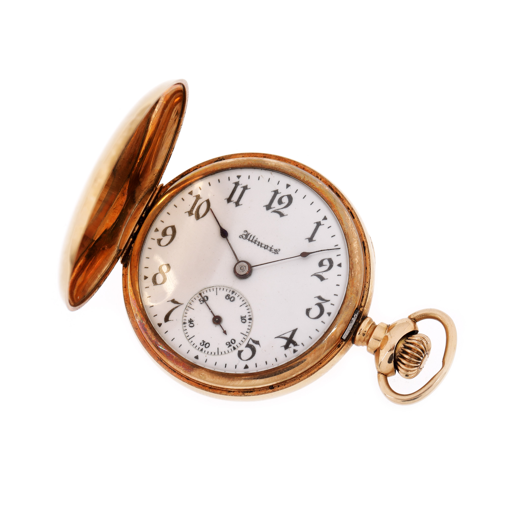 Ceas Illinois, din aur, de buzunar, bărbătesc. Mecanism cu armare manuală. Cadran de culoare alb, indici numerale arabe, cu registru pentru secundar în dreptul orei 6.