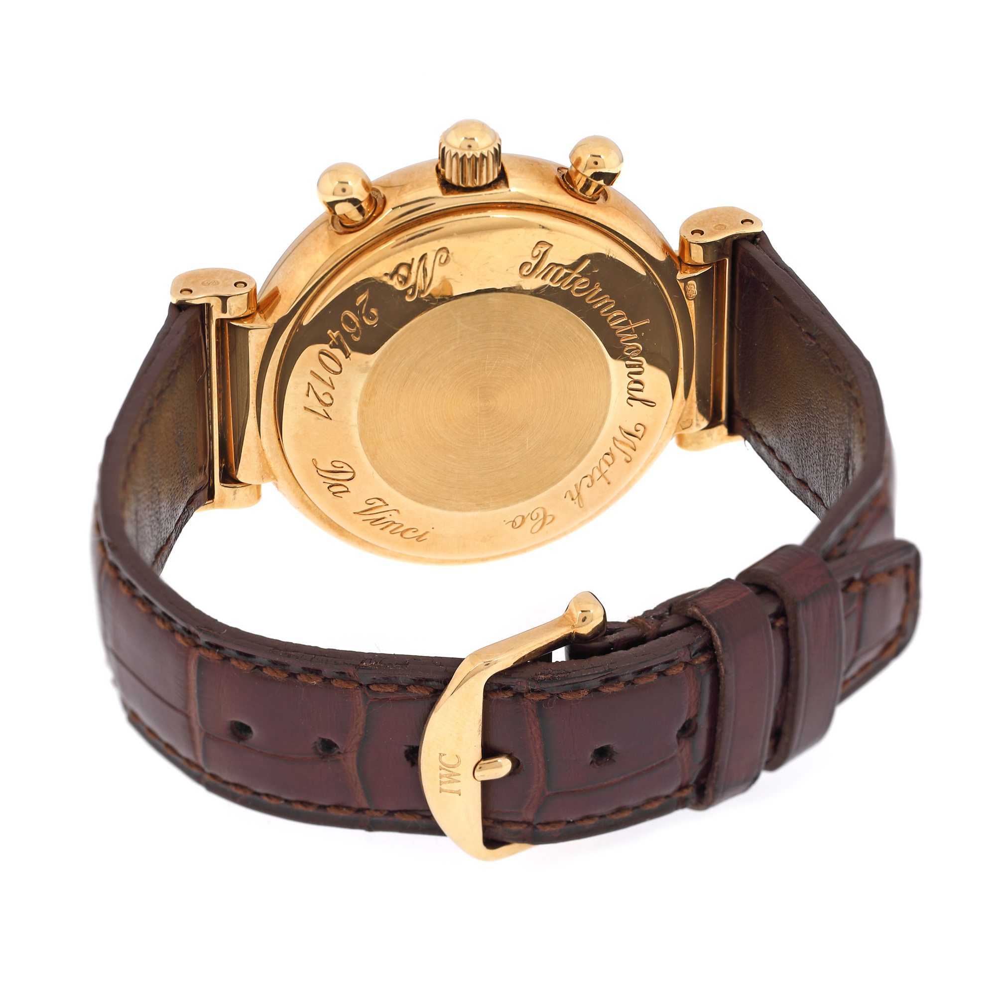 Ceas IWC Da Vinci Perpetual Calendar, din aur, de mână, bărbătesc, referință 3751. Mecanism automatic, calibrul 79061, cu funcție chronograph, cadran de culoare alb, indici baghete, cu registrul pentru an între orele 7 și 8, registrul pentru fazele lunii în dreptul orei doisprezece și trei registre pentru calendarul perpetuu în dreptul orelor 3, 6 și 9. Curea din piele originală, de culoare maro, cu sistem de închidere clasic.