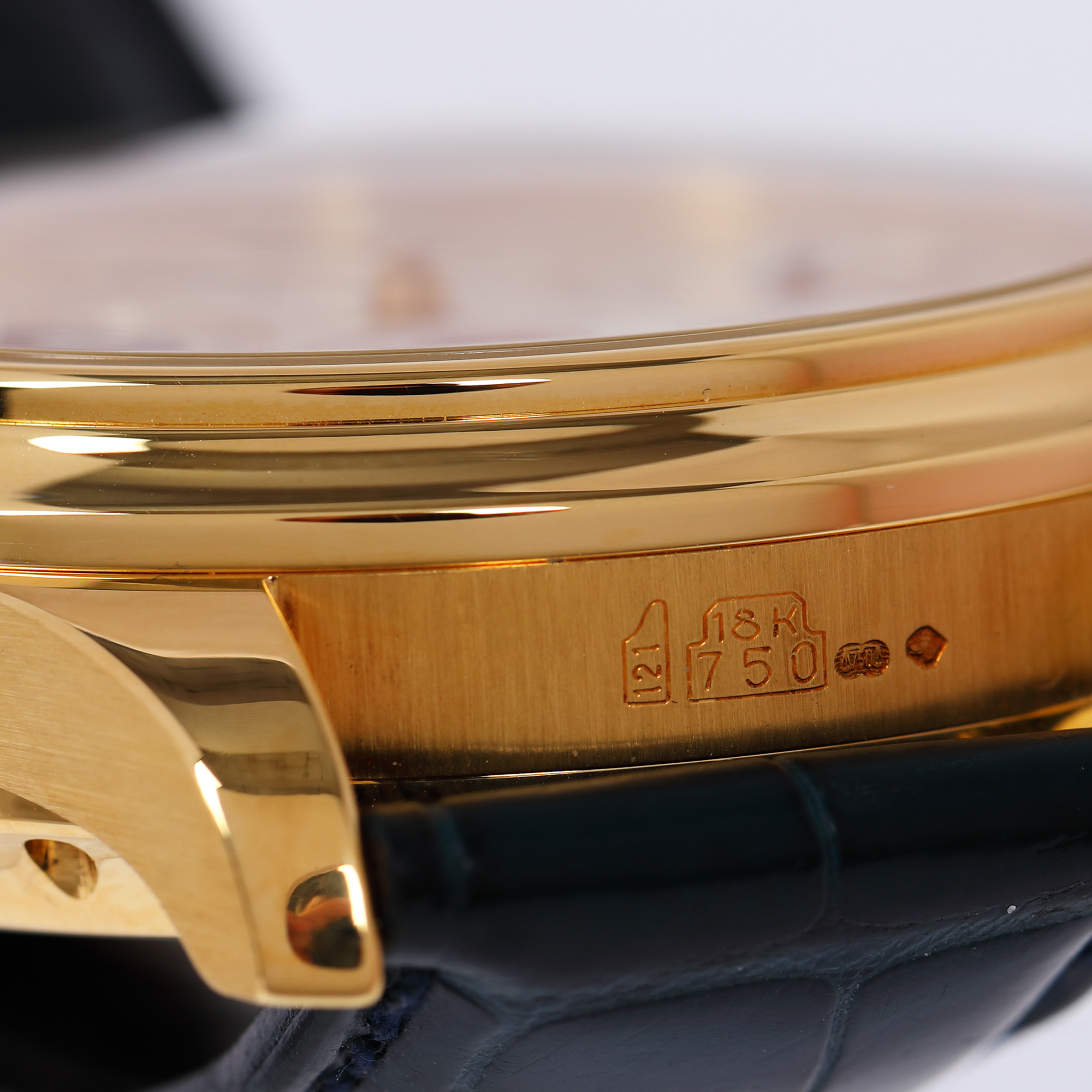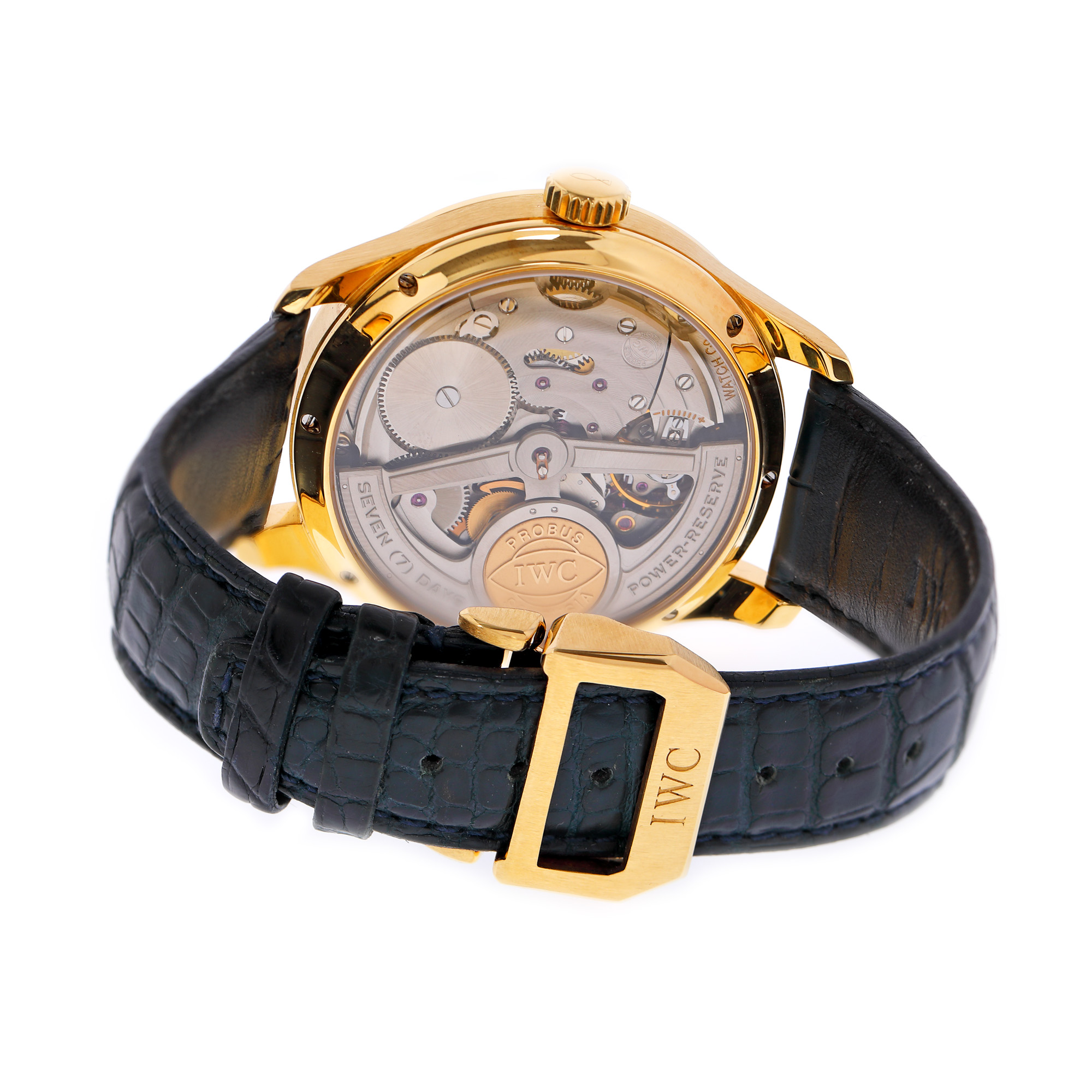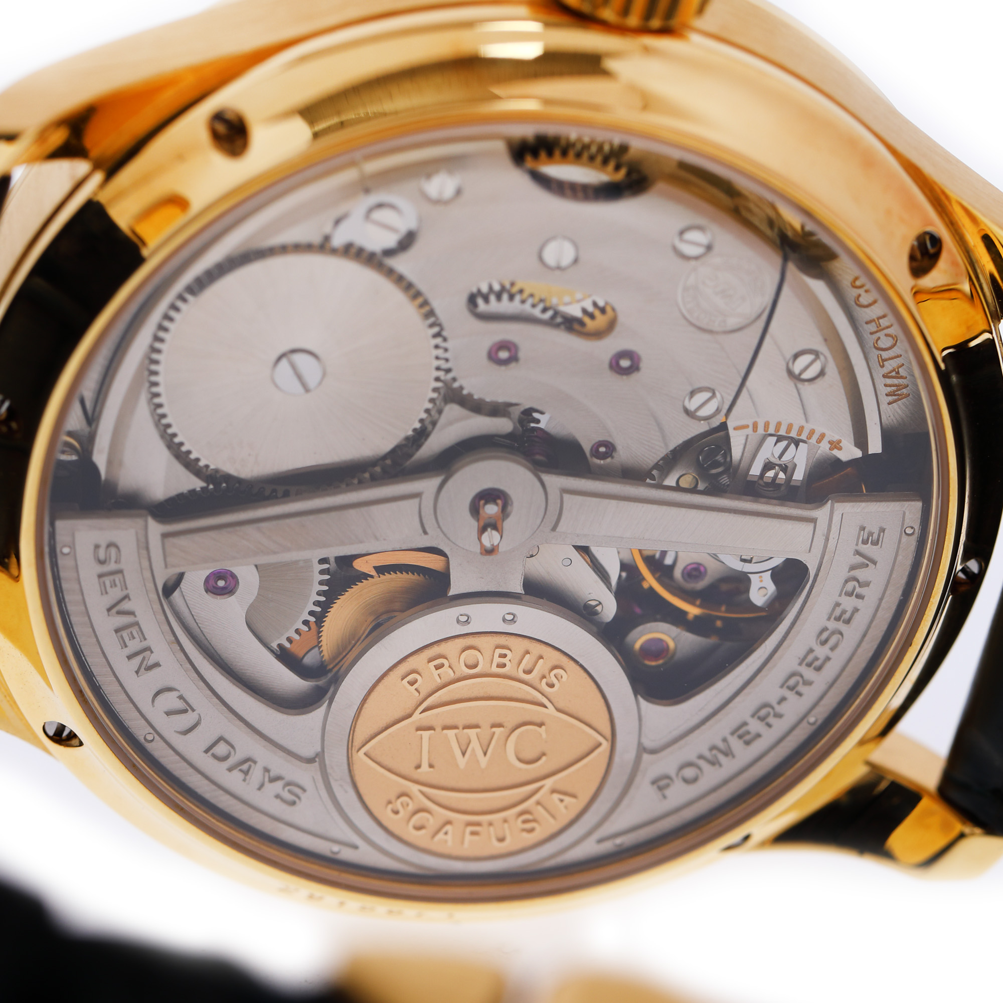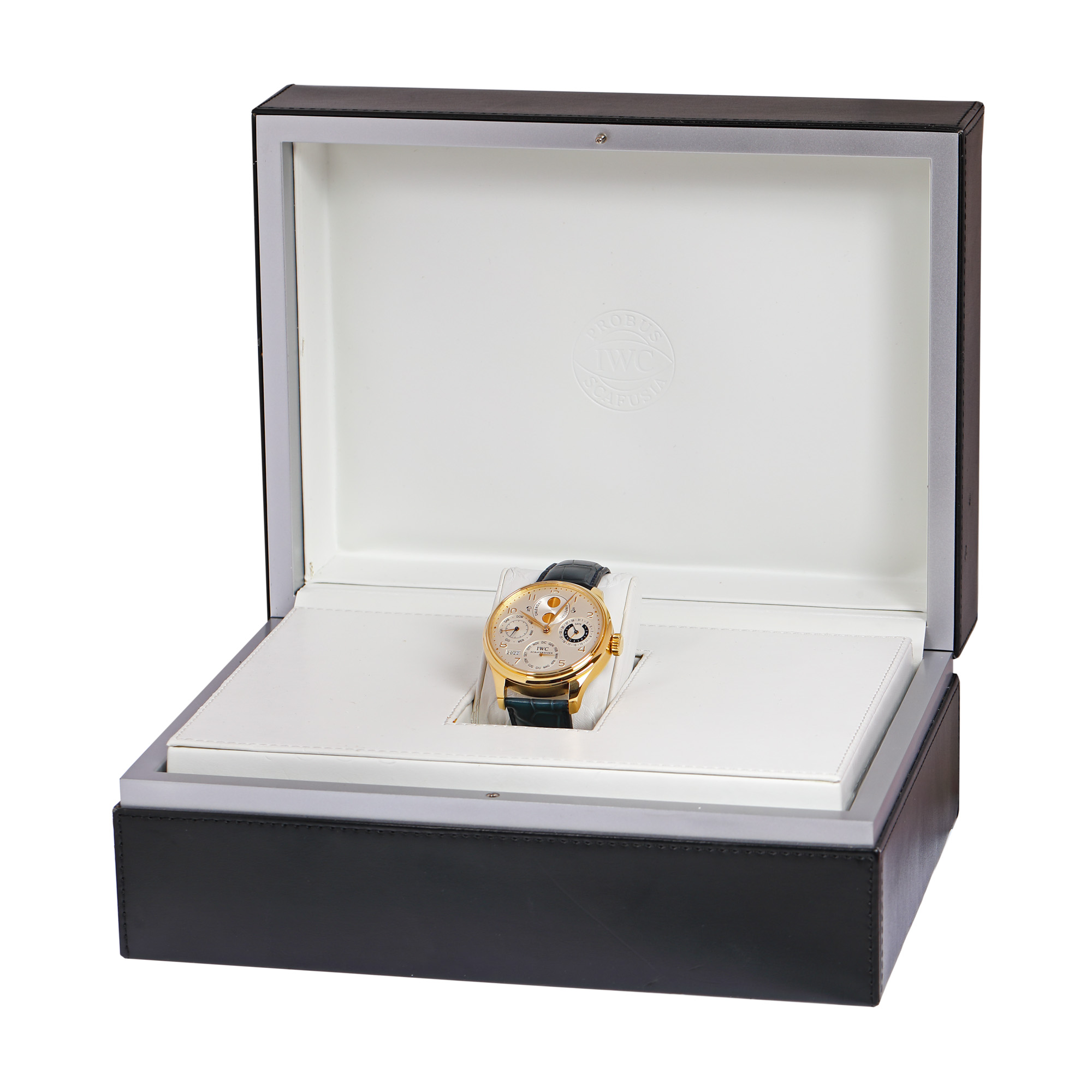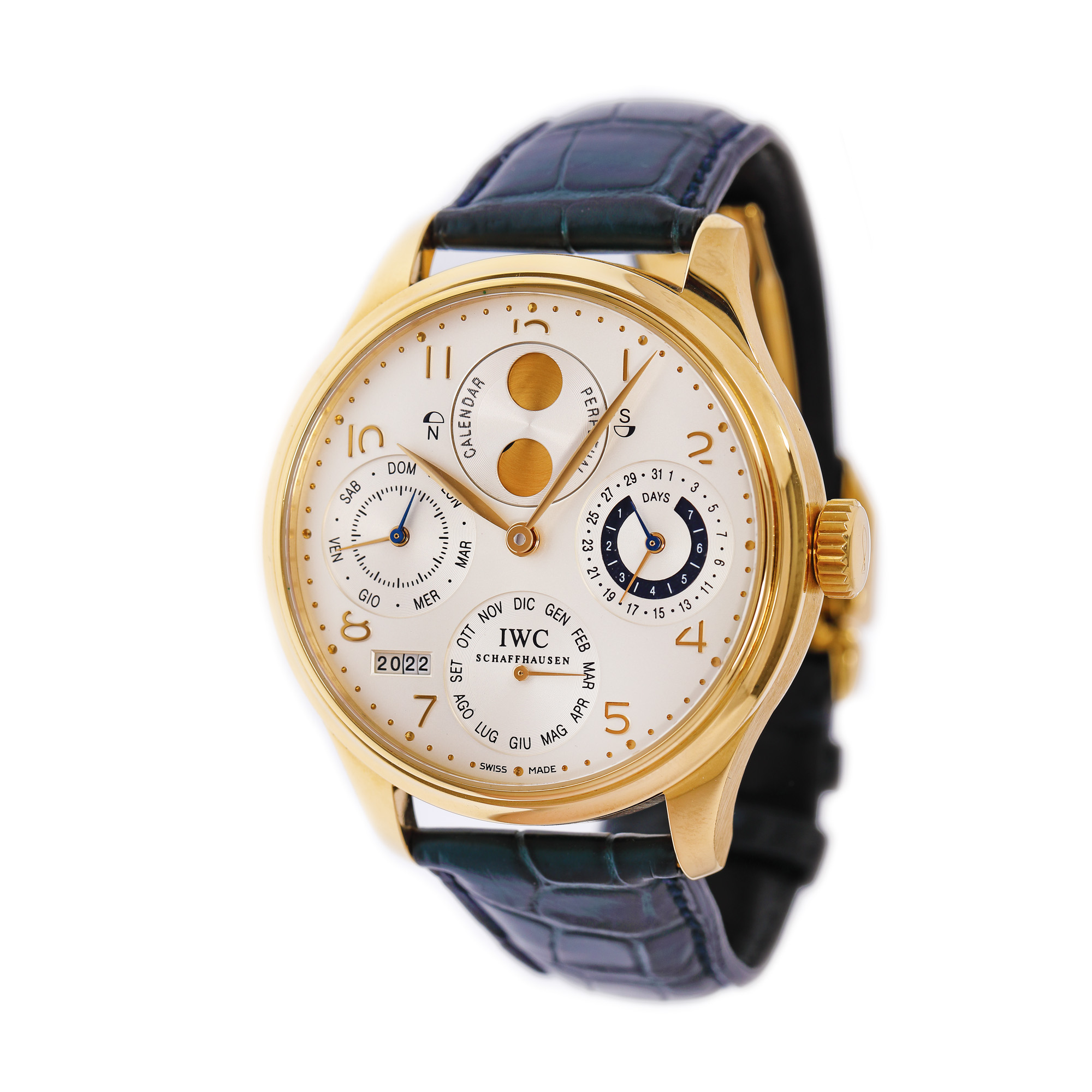 Ceas IWC Portuguese Perpetual Calendar, din aur, de mână, bărbătesc, referință IW502105. Mecanism automatic, calibrul 50611, cu 64 de rubine, anterior vitrat. Cadran de culoare champagne, indici numerale arabe, registru pentru dată în dreptul orei 3, registru pentru lunile anului în dreptul orei 6, registru pentru an între orele 7 și 8, registru pentru secundar și zilele săptămânii în dreptul orei 9, registru pentru fazele lunii în dreptul orei 12. Curea originală, din piele de crocodil, de culoare neagră, cu sistem de închidere de tip deployant. Accesorii: cutia originală, cutie electrică pentru întors ceasuri automatice.
