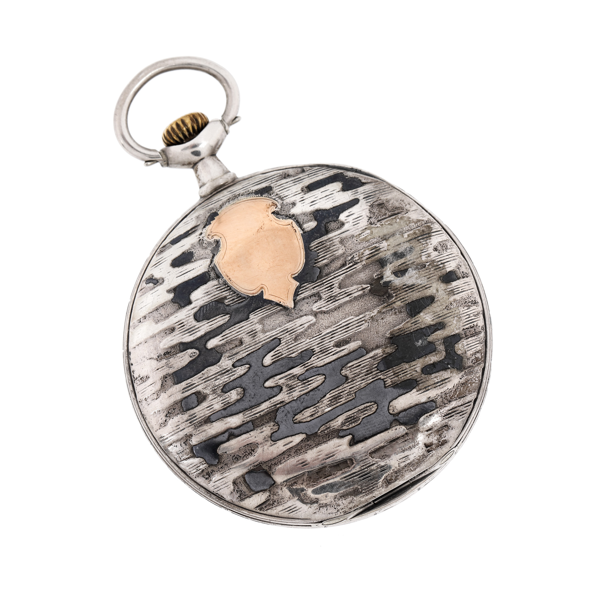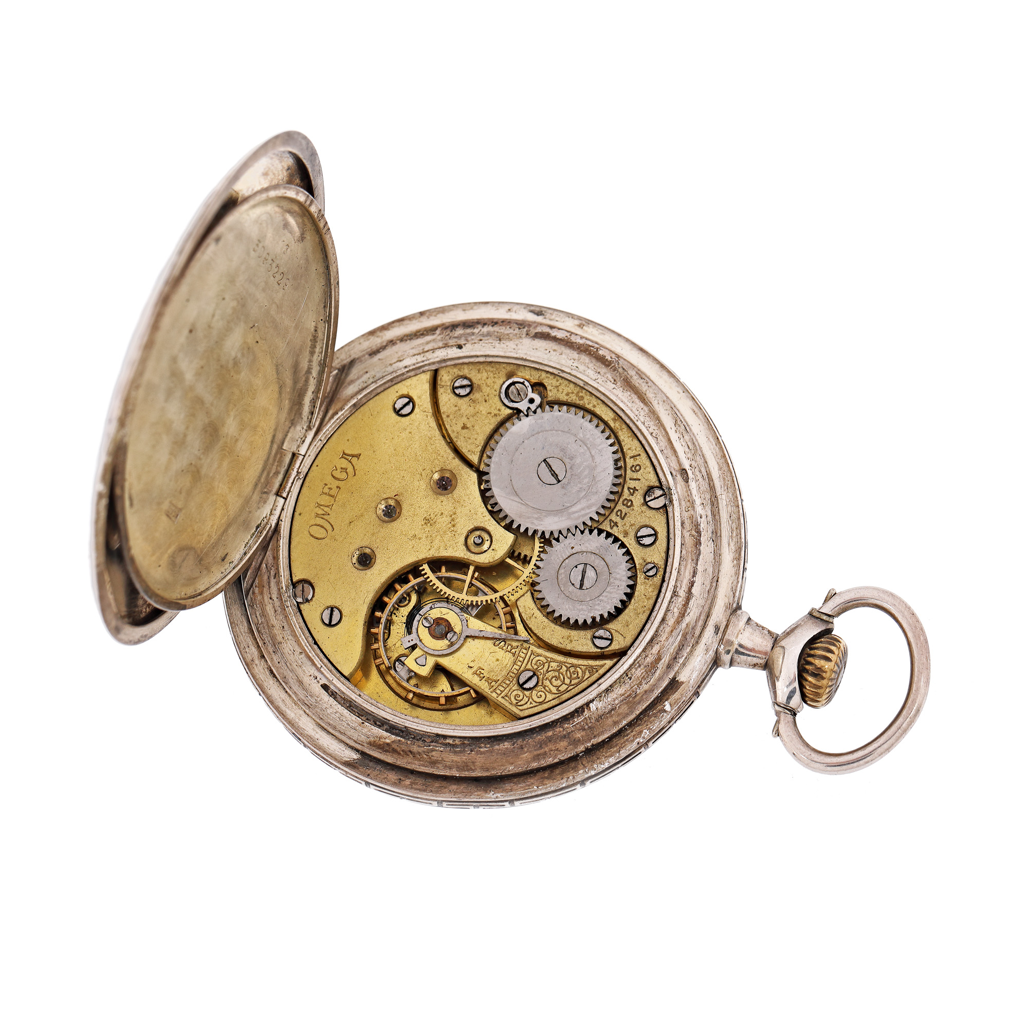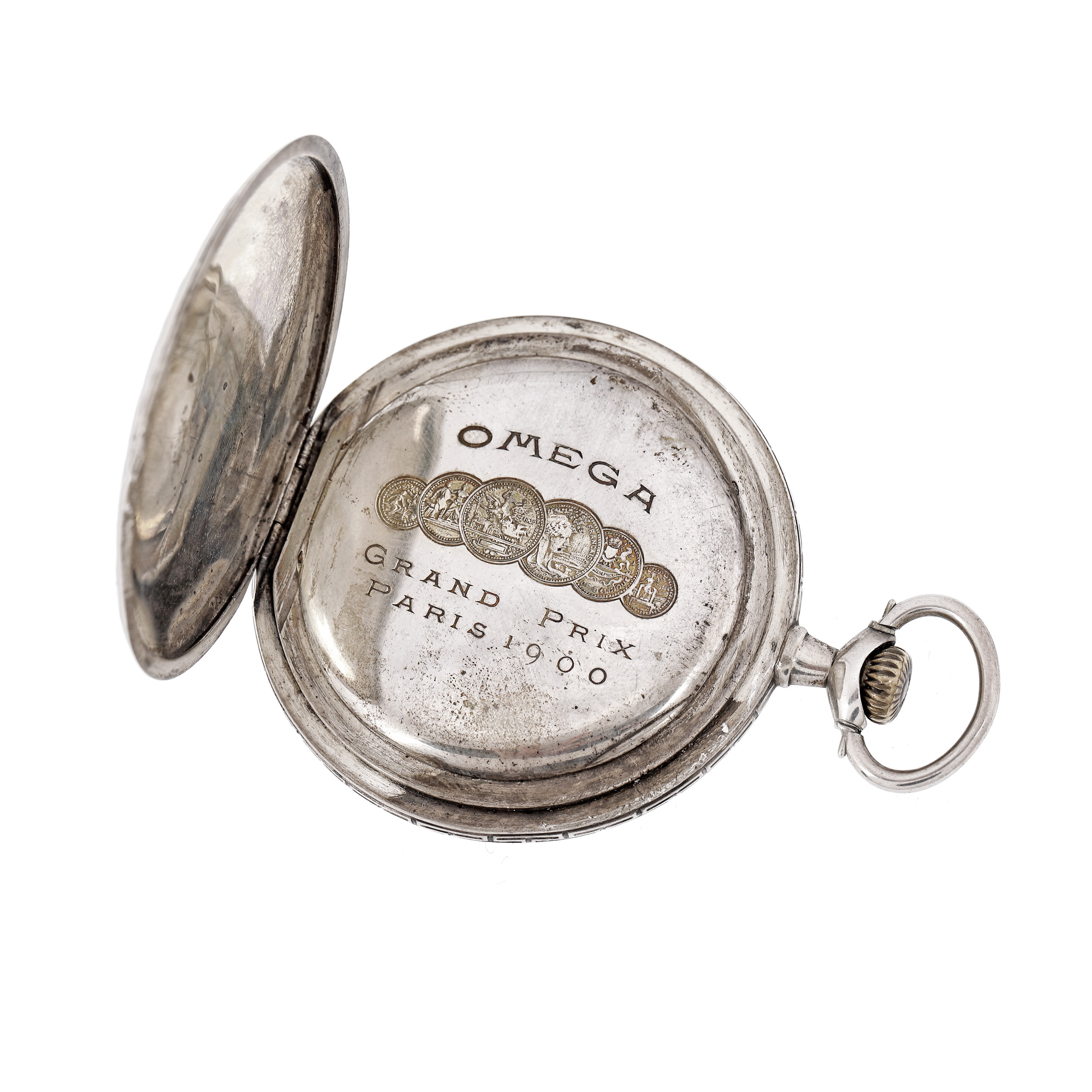 76. Ceas Omega, din argint decorat în tehnică niello, cu cartuș din aur monogramabil, de buzunar, bărbătesc [1920]