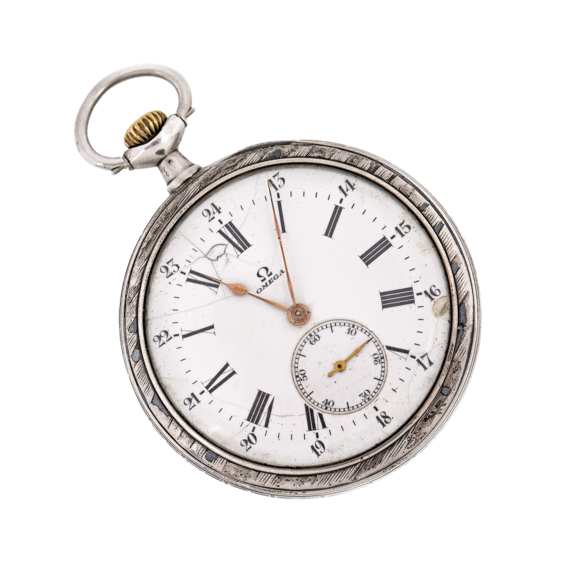 Ceas Omega, din argint niello, de buzunar, bărbătesc. Cadran de culoare alb, indici numerale romane pentru orele 0-12 dublate de numerale arabe pentru orele 12-24, registru pentru secundar în dreptul orei 6.