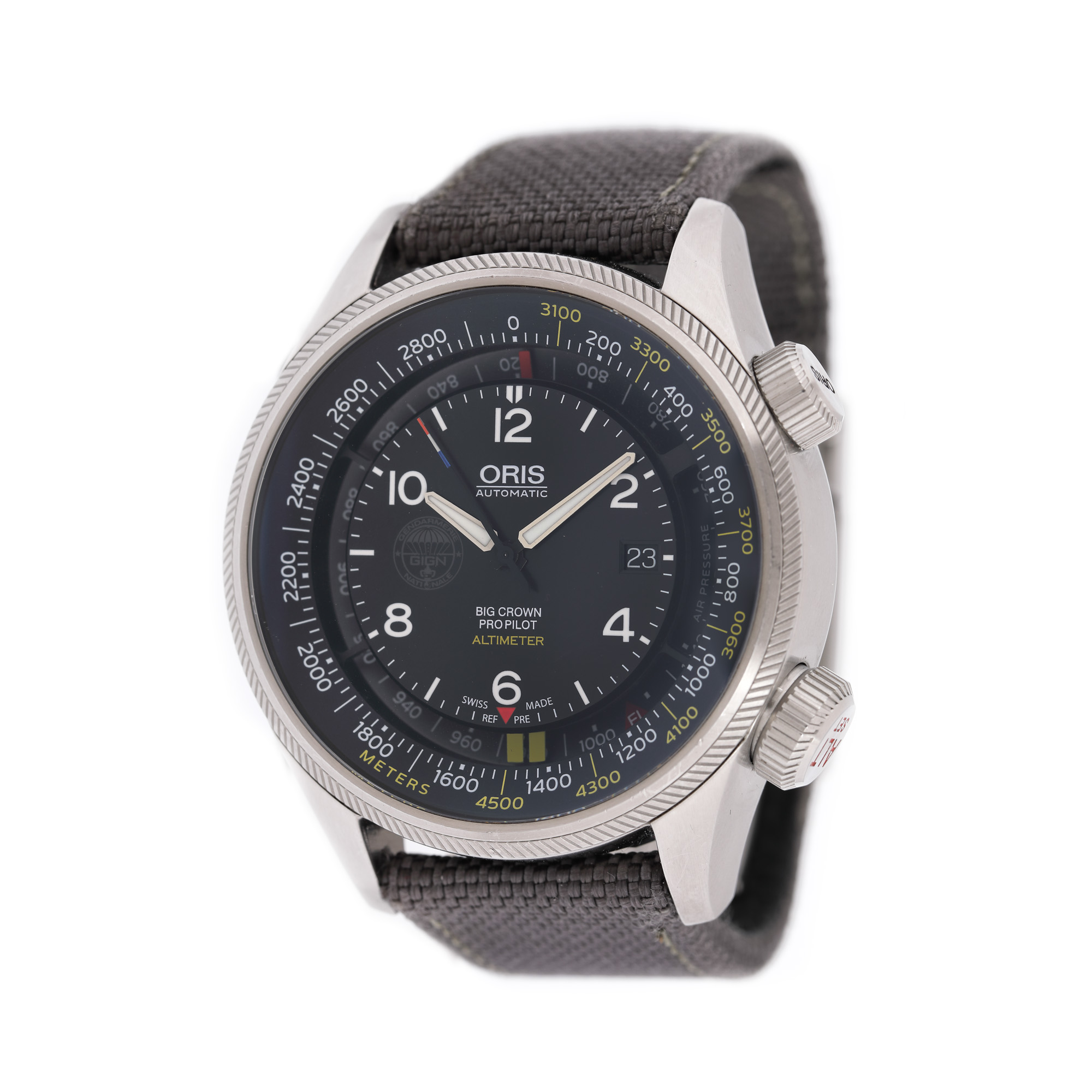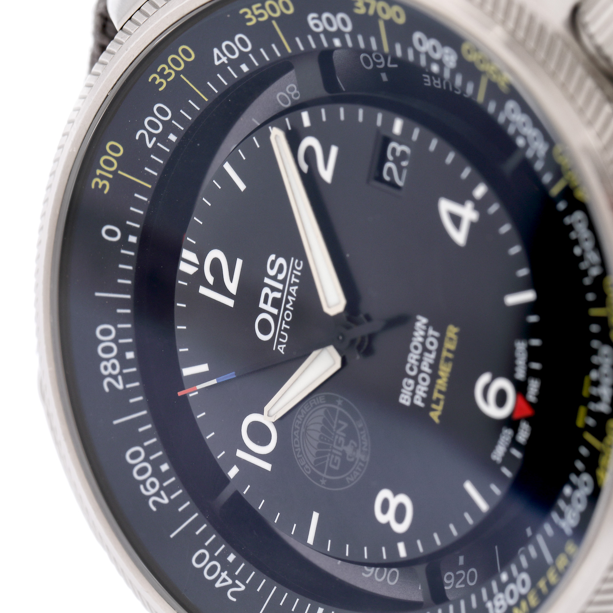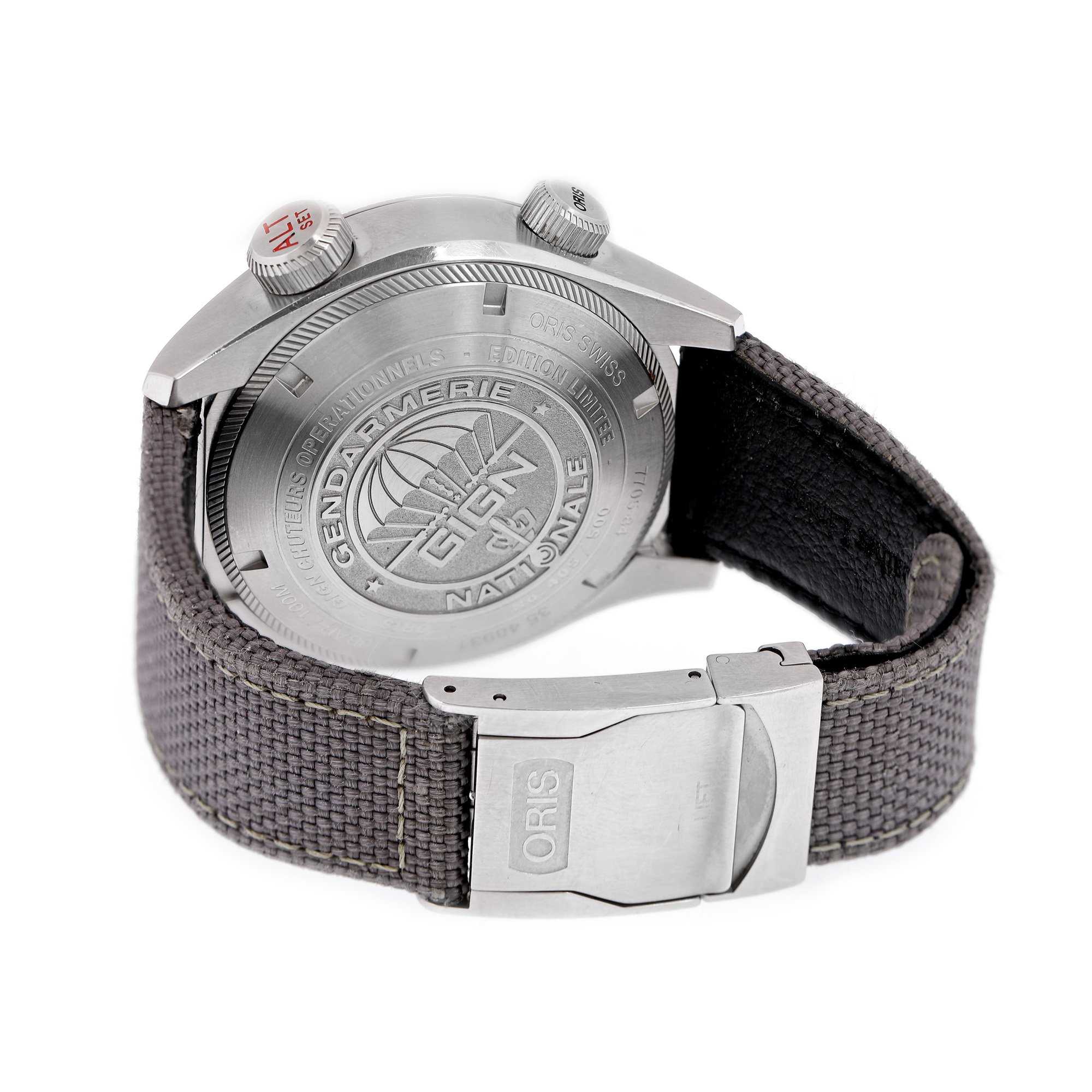 Ceas Oris GIGN Chuteurs Operationnels, ediție limitată no 405/500, de mână, bărbătesc, referință 01 733 7705 4184-Set 5 23 14FC. Mecanism automatic, calibrul Oris 733. Cadran de culoare neagră, indici cu numerale arabe, cu registrul de dată în dreptul orei 3. Curea originală, din material textil, cu sistem de închidere de tip deployant.