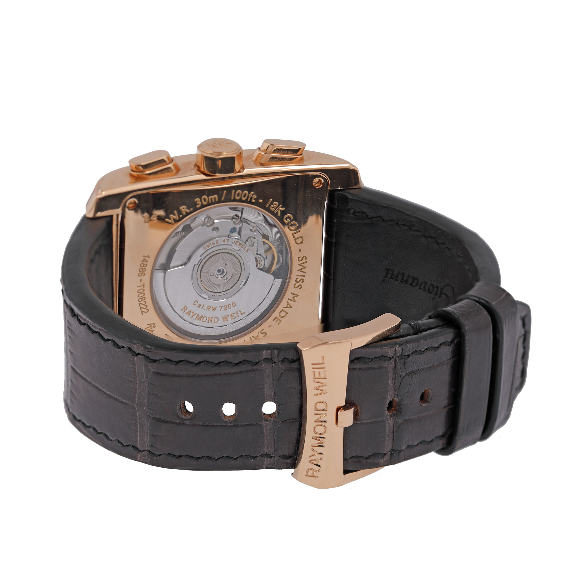 Ceas Raymond Weil Don Giovanni, din aur, de mână, bărbătesc, referință 14886G00908. Mecanism automatic, calibrul RW7200, cu 47 de rubine, cu funcție de chronograph, anterior vitrat. Cadran din sidef, indici numerale romane, registru pentru dată în dreptul orei 12, registru pentru secundar în dreptul orei 3, două registre pentru chronograph în dreptul orelor 6 și 9. Curea originală, din piele, de culoare neagră, cu sistem de închidere clasic, cu catarama originală din aur. Accesorii: cutia originală, card de garanție, manual de instrucțiuni.