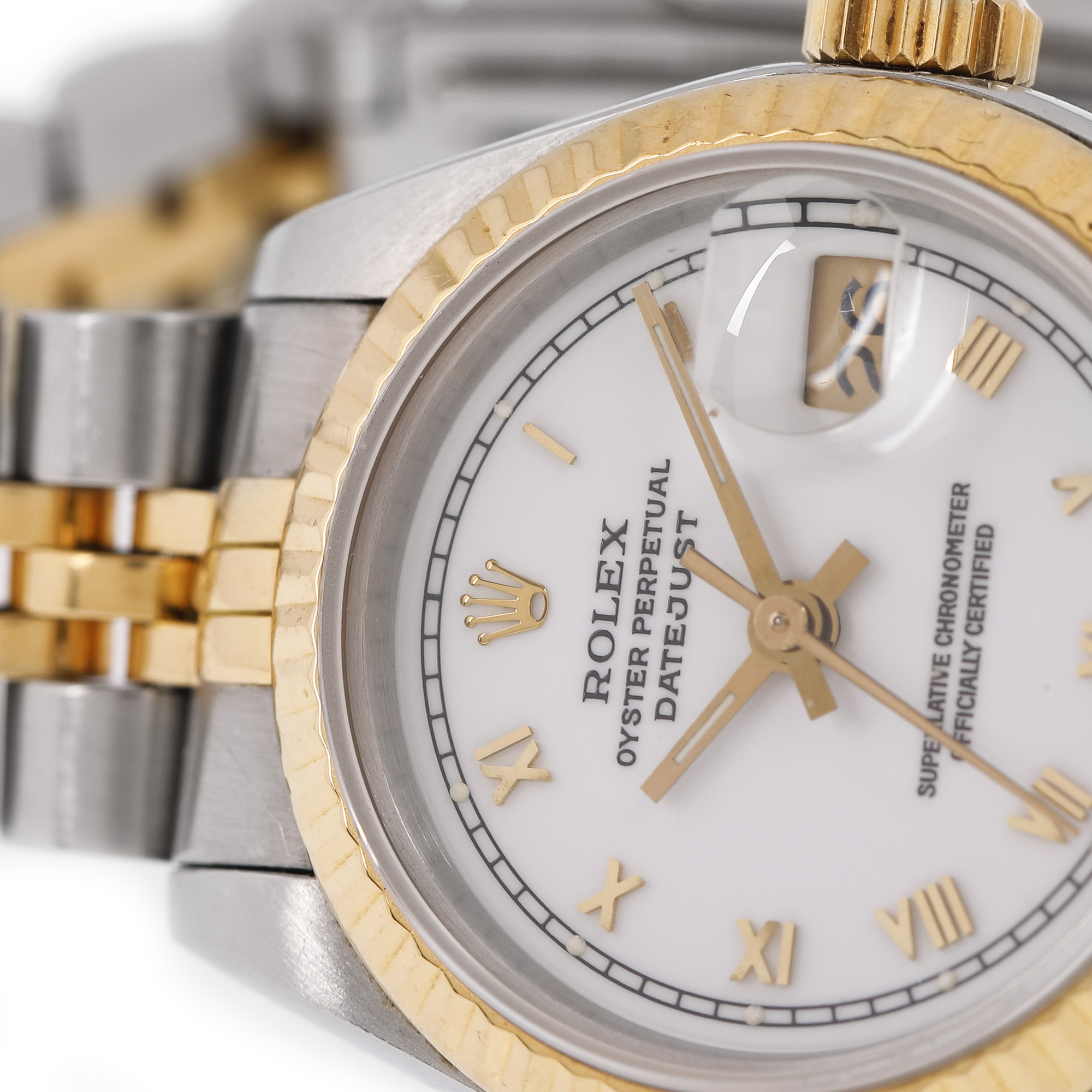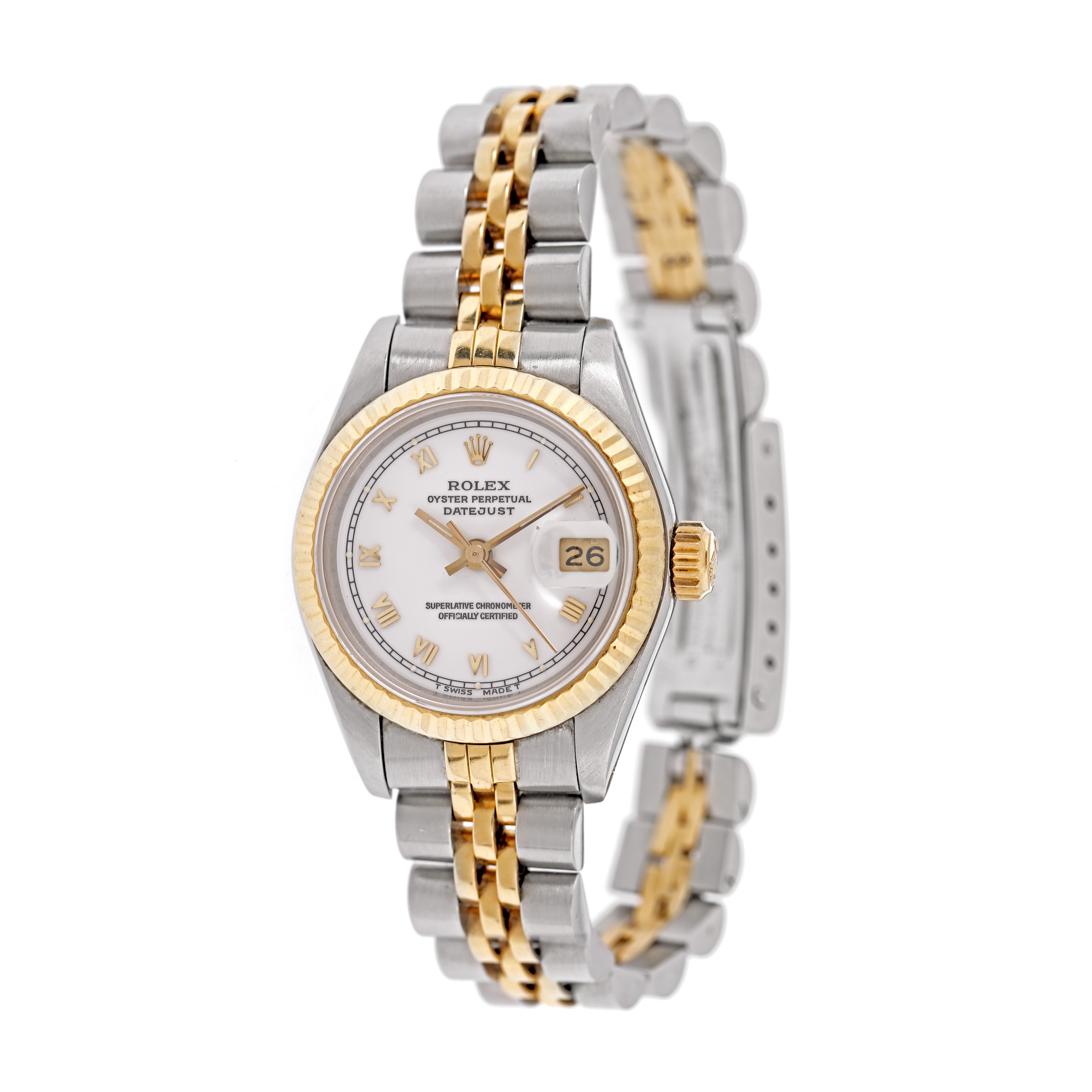 Ceas Rolex Oyster Perpetual Datejust, din aur și oțel, de mână, de damă, referință 179173. Mecanism automatic, calibrul 2235. Cadran de culoare albă, indici cu numerale romane din aur, cu registrul pentru dată în dreptul orei 3. Brățară originală, din aur și oțel, cu sistem de închidere de tip deployant.