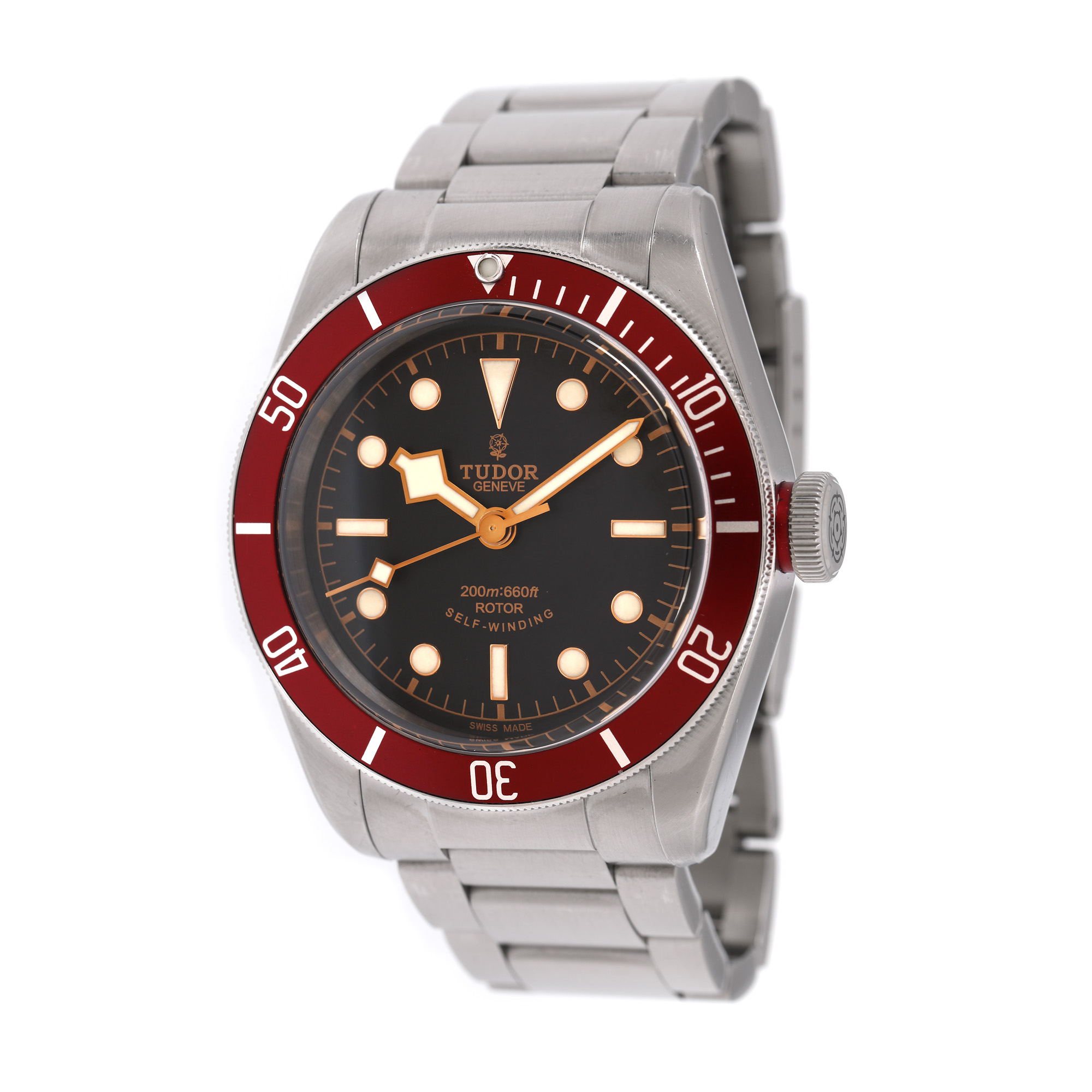 Ceas Tudor Black Bay Heritage, de mână, bărbătesc, referință 79220R. Mecanism automatic, calibrul 2824, bezel rotativ unidirecțional. Cadran de culoare negru, indici puncte. Brățară originală din oțel inoxidabil, cu sistem de închidere de tip deployant.