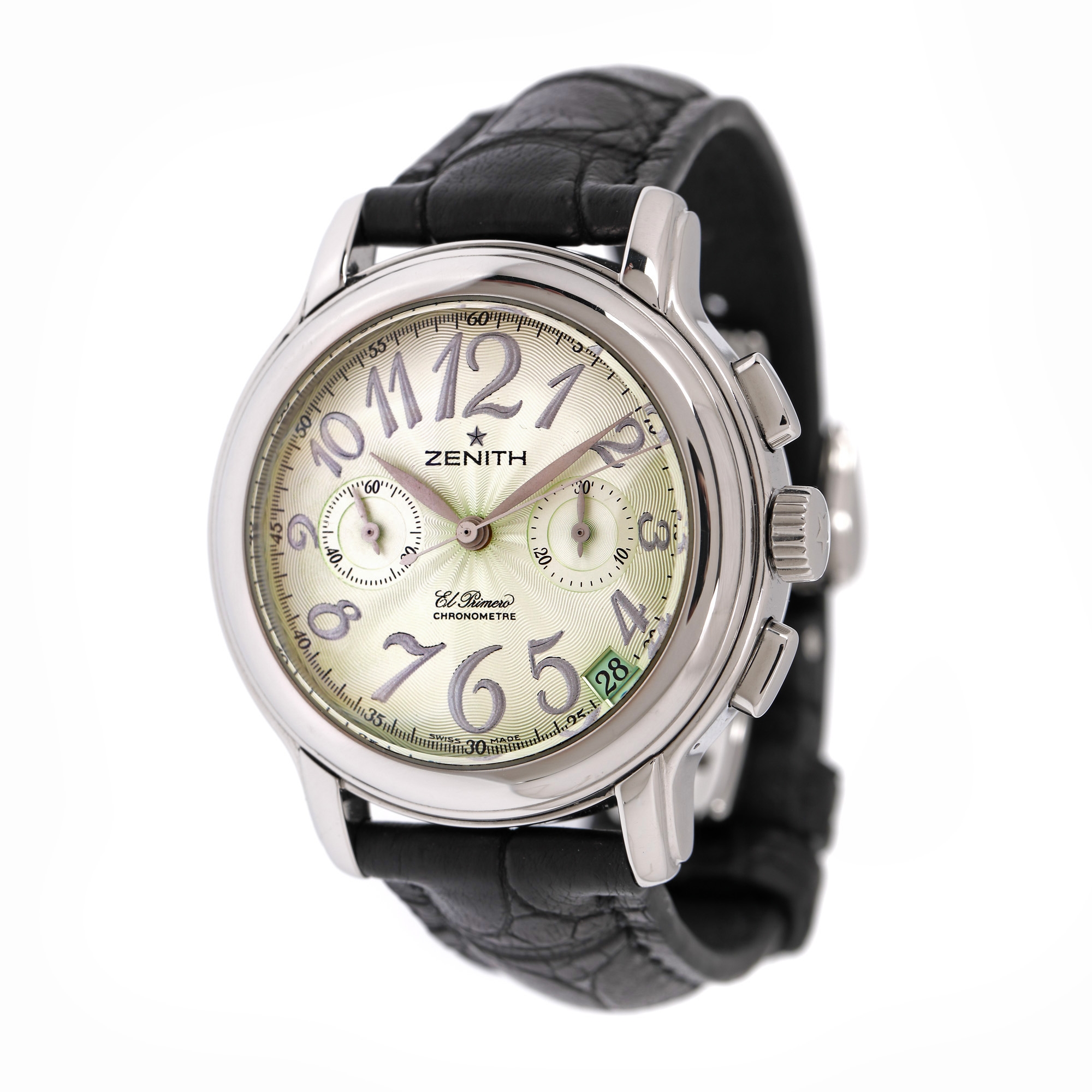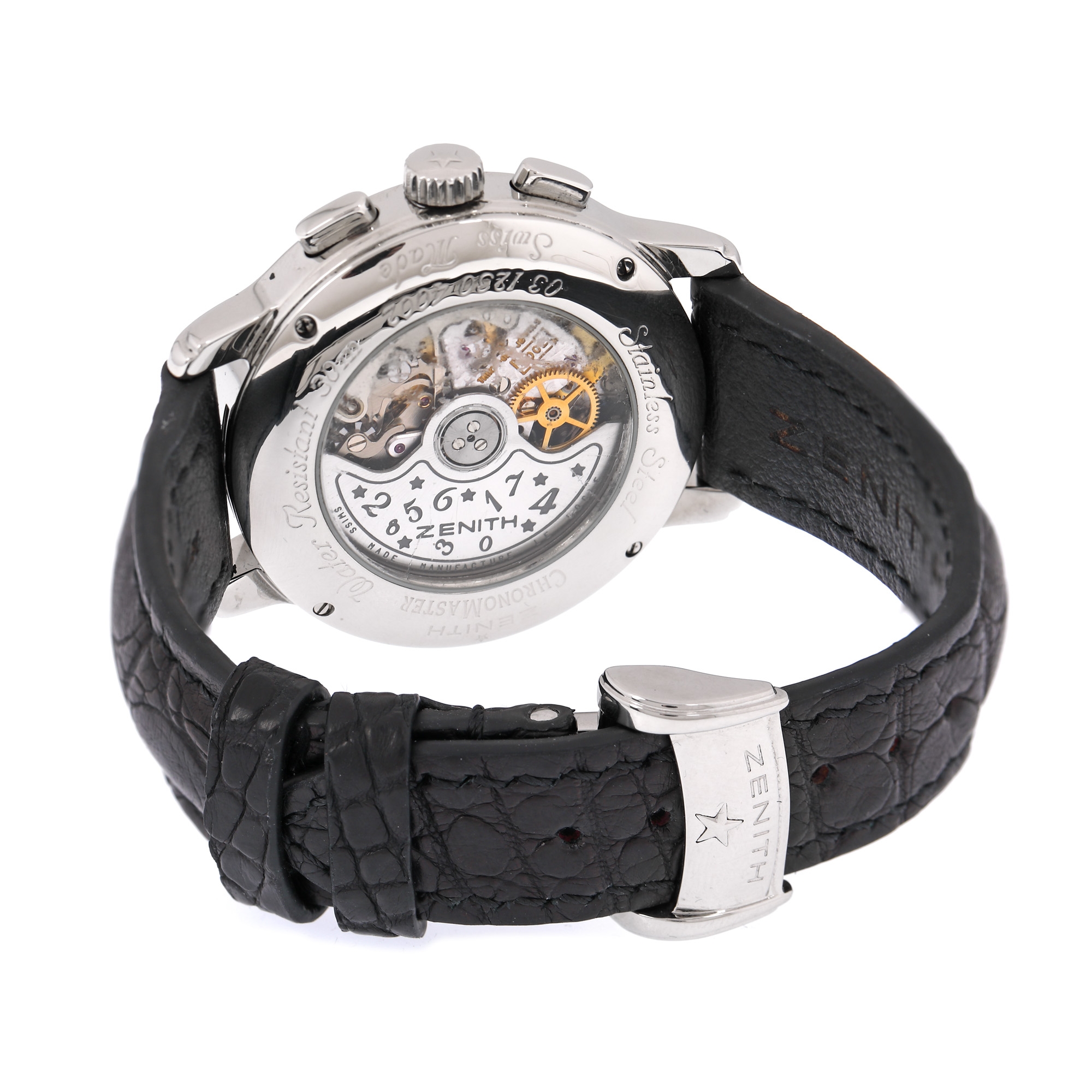 Ceas Zenith El Primero, de mână, unisex, referință 03-1230-4002. Mecanism automatic, calibrul 4002, cu funcție de chronograph, anterior vitrat. Cadran de culoare argintiu, în tehnica guilloche, indici cu numerale arabe, cu registrul pentru dată între orele 4 și 5, un registru pentru funcția de chronograph în dreptul orei 3 și registrul pentru secundar în dreptul orei 9. Curea originală din piele, de culoare neagră, cu sistem de închidere de tip deployant.
