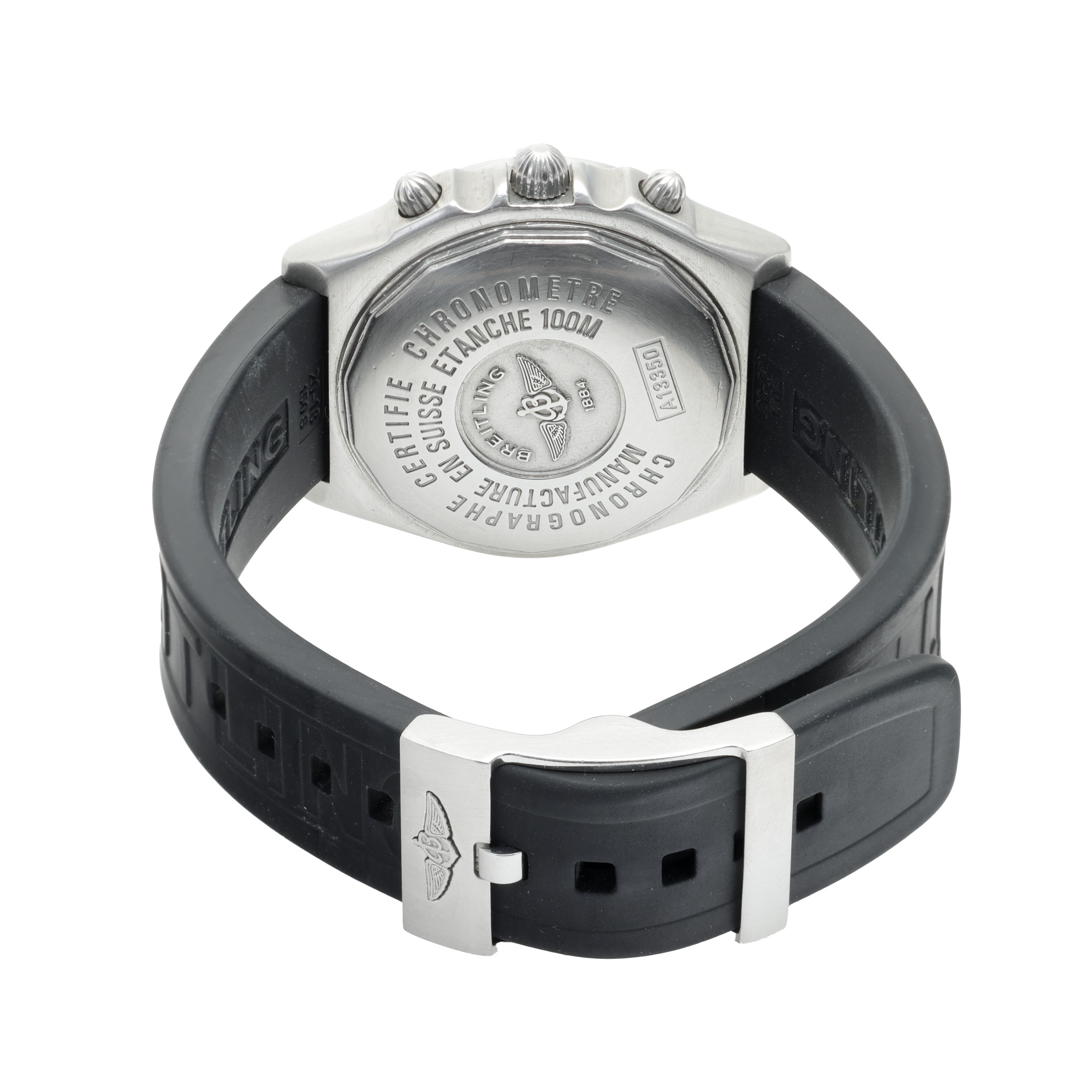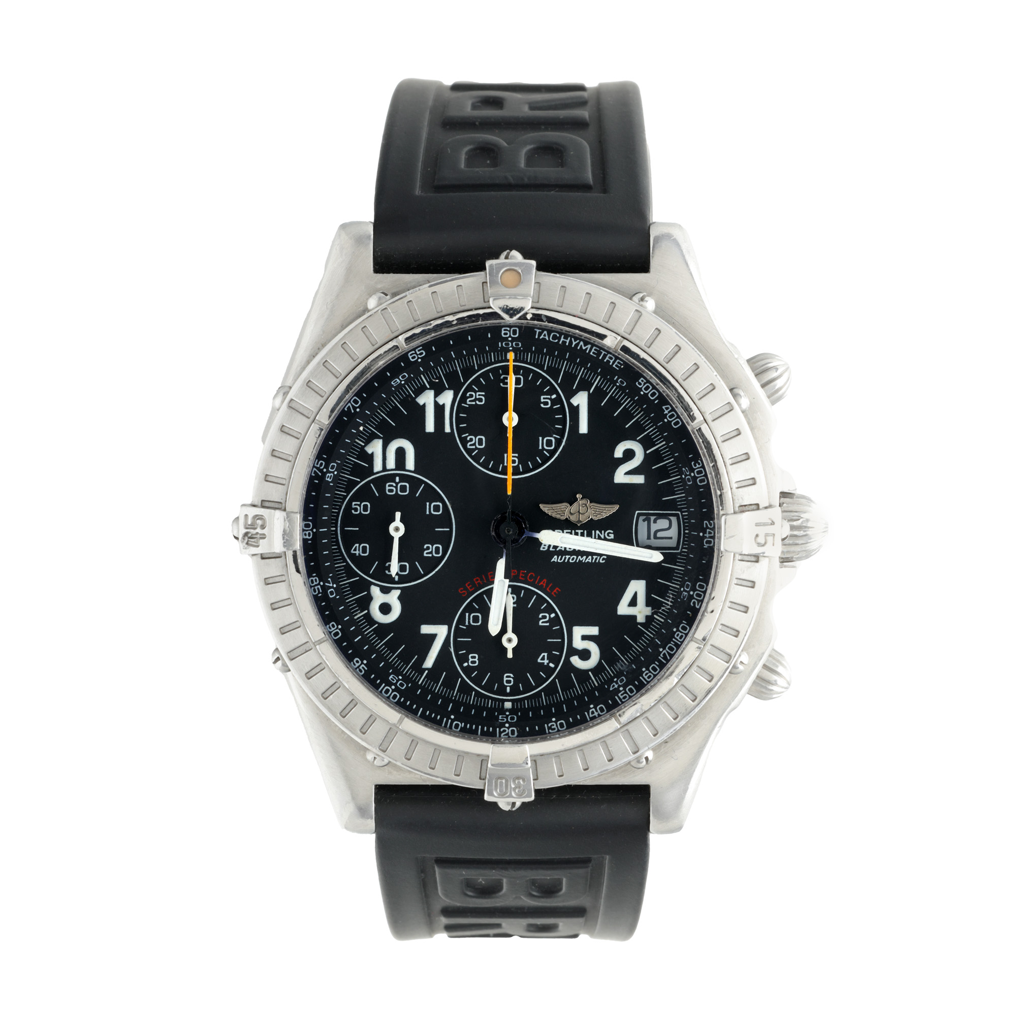 Ceas Breitling Chronomat Blackbird "Serie Speciale", de mână, bărbătesc, referință A13350. Mecanism automatic, calibrul Breitling 13, cu funcție de chronograph. Cadran de culoare negru, indici cu numerale arabe, cu un registru pentru dată în dreptul orei 3, două registre pentru funcția de chronograph în dreptul orelor 12 și 6 și un registru pentru secundar în dreptul orei 9. Curea originală, din cauciuc, de culoare neagră, cu sistem de închidere de tip clasic dublat.