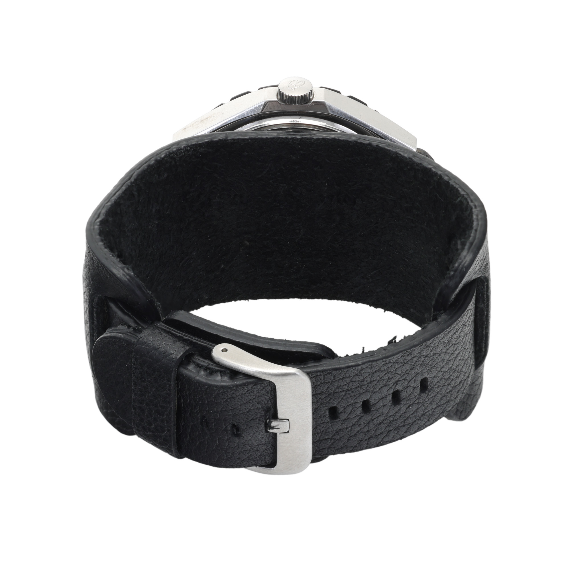 Ceas Breitling Chronomat, de mână, bărbătesc, referință 1808. Mecanism automatic, calibrul 12 (Lemania 1873), cu funcție de chronograph, bezel mobil bidirecțional. Cadran de culoare negru, indici liniari, cu un registru pentru dată în dreptul orei 6 și două registre pentru funcția de chronograph în dreptul orelor 3 și 9. Curea adăugată aftermarket, din piele, de culoare neagră, cu sistem de închidere de tip clasic.