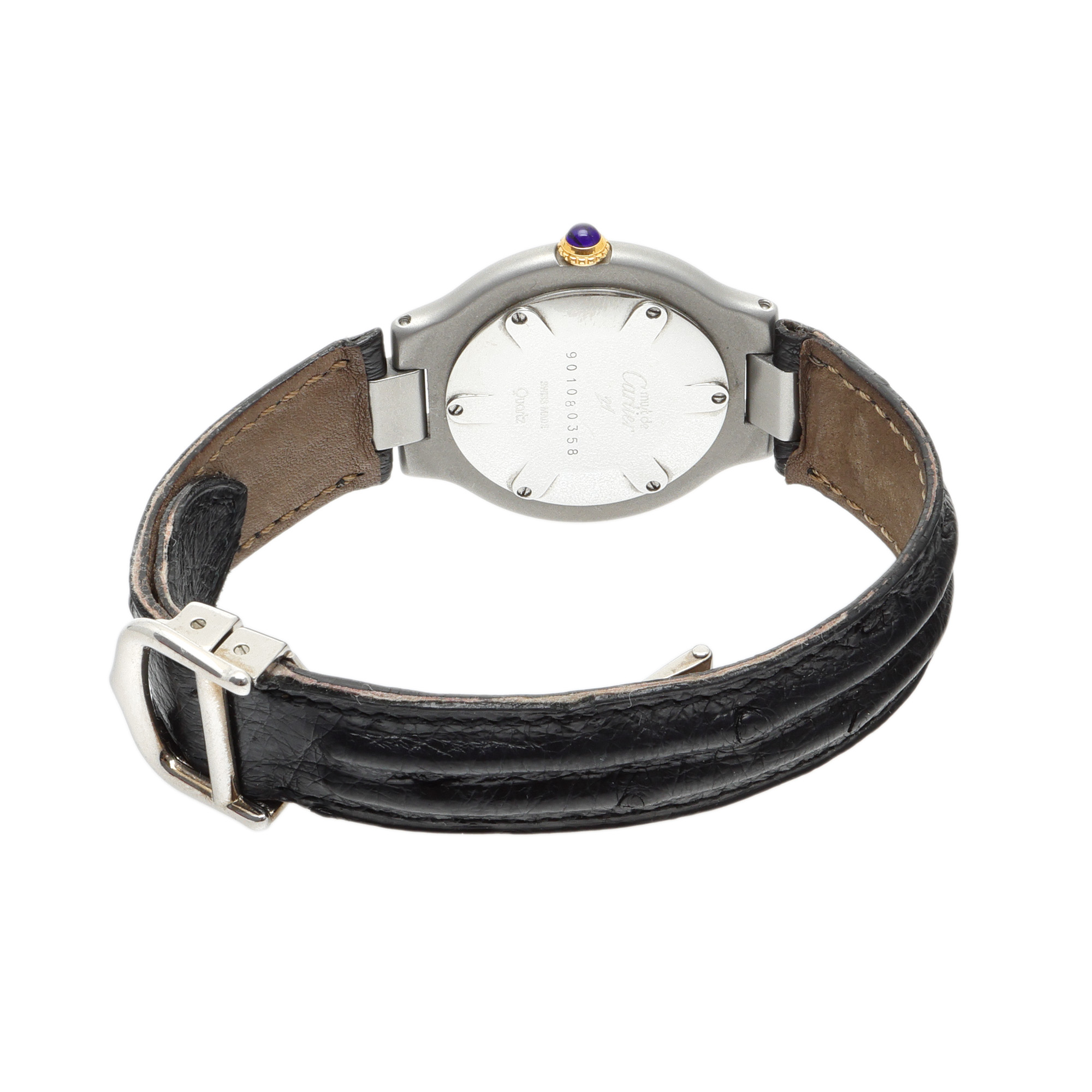 Ceas Cartier Must de Cartier, de mână, de damă. Mecanism quartz. Cadran de culoare alb, indici numerale romane dispuși pe carcasă. Curea originală, din piele, de culoare neagră, cu sistem de închidere de tip deployant. Accesorii: cutie originală.