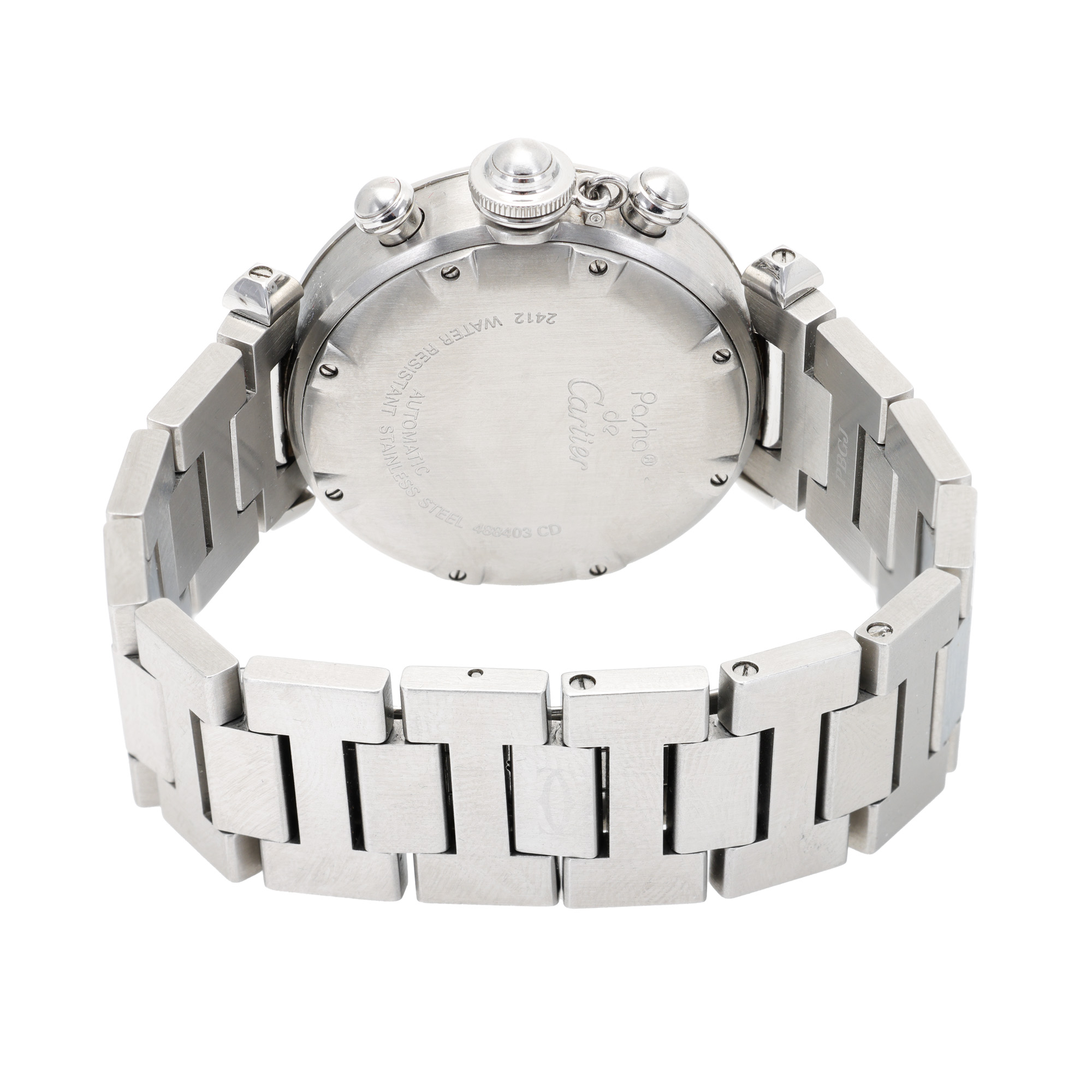 Ceas Cartier Pasha Chronograph, de mână, unisex, referință 2412. Mecanism automatic, calibrul 47, cu funcție de chronograph. Cadran de culoare argintiu, indici liniari, cu un registru pentru secundar în dreptul orei 3, un registru pentru dată între orele 4 și 5 și două registre pentru funcția de chronograph în dreptul orelor 6 și 9. Brățară originală din oțel inoxidabil, cu sistem de închidere de tip deployant.
