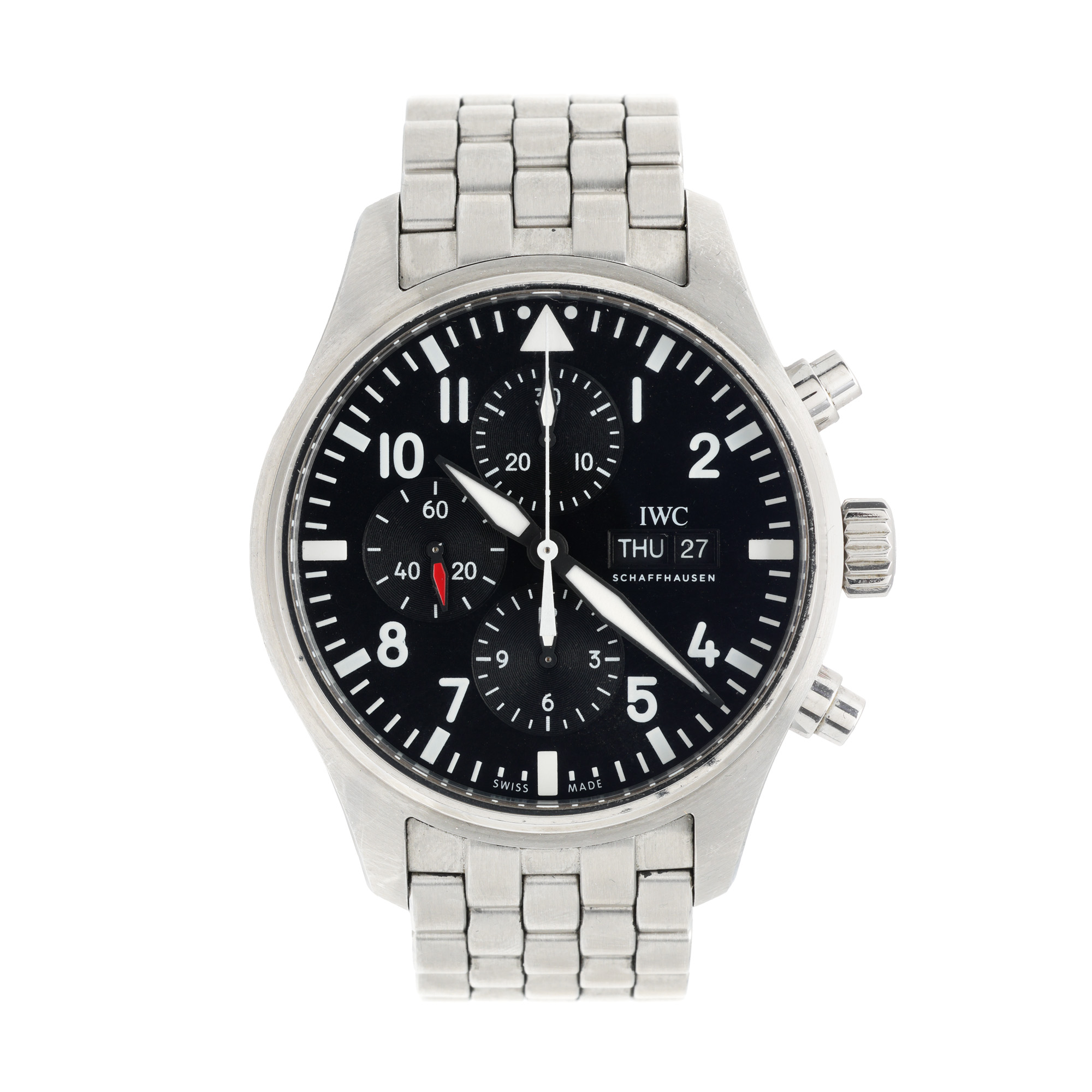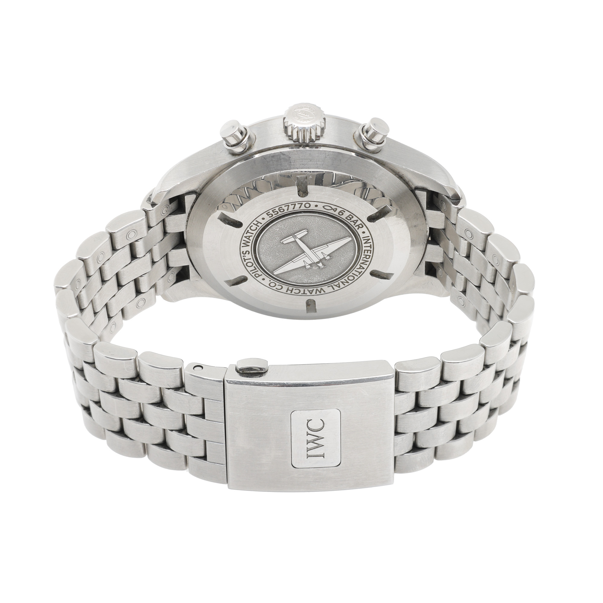 Ceas IWC Pilot Chronograph, de mână, bărbătesc, referință 371704. Mecanism automatic, calibrul 7750, cu funcție de chronograph. Cadran de culoare negru, indici cu numerale arabe, cu un registru pentru dată în dreptul orei 3, două registre pentru funcția de chronograph în dreptul orelor 12 și 6 și un registru pentru secundar în dreptul orei 9. Brățară originală, din oțel inoxidabil, cu sistem de închidere de tip deployant.