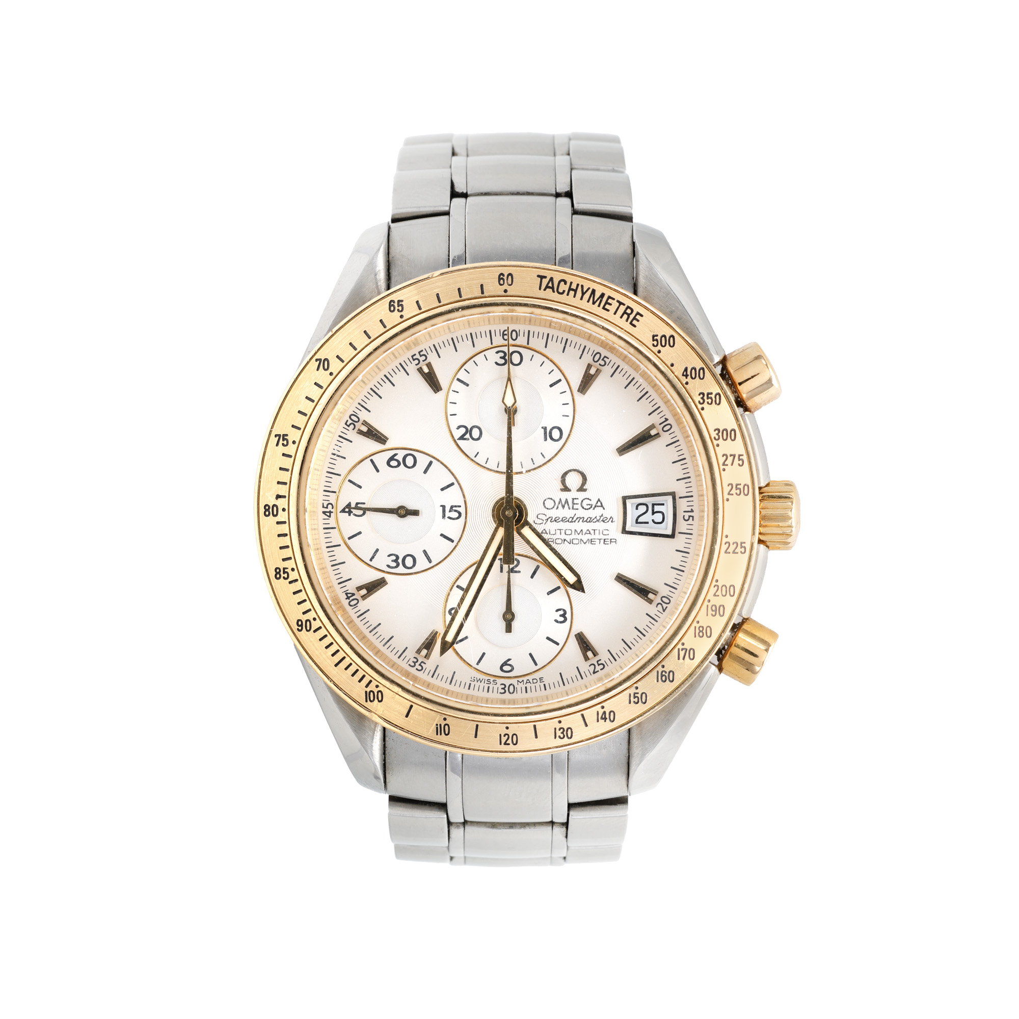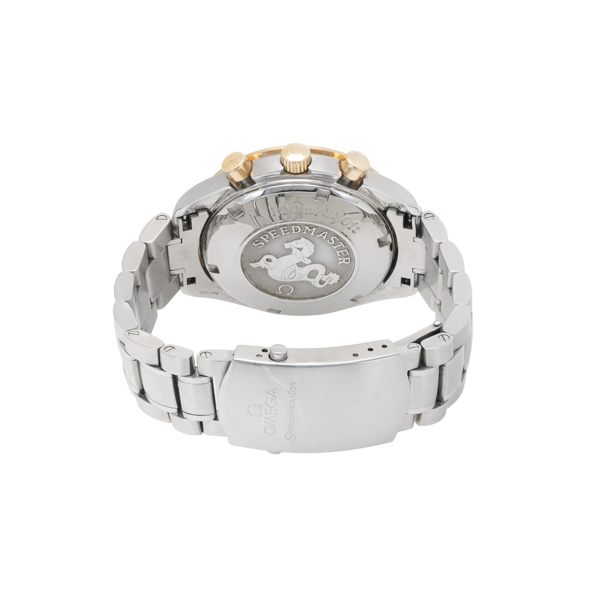 Ceas Omega Speedmaster, din aur și oțel, de mână, bărbătesc, referință 3313.30. Mecanism automatic, calibrul 7750. Cadran de culoare alb, indici liniari, cu un registru pentru dată în dreptul orei 3, două registre pentru chronograph în dreptul orelor 12 și 6 și un registru pentru secundar în dreptul orei 9. Brățară originală, din oțel, cu sistem de închidere de tip deployant.