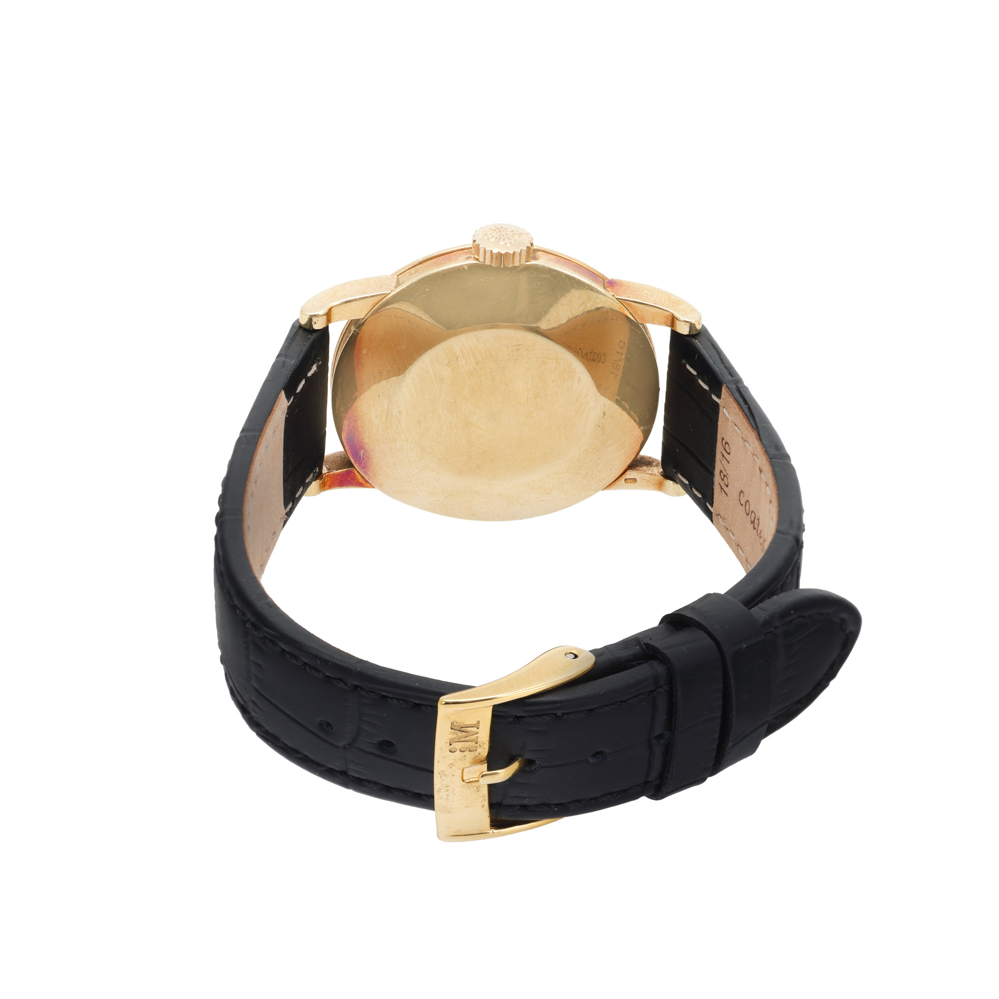 Ceas Patek Philippe Calatrava, din aur, de mână, bărbătesc, referință 2466. Mecanism cu armare manuală. Cadran de culoare champagne, indici numerale arabe pentru orele cardinale și baghete pentru restul orelor. Curea adăugată aftermarket, din piele, de culoare neagră, cu sistem de închidere de tip clasic cu cataramă. Accesorii: borsetă de călătorie originală.