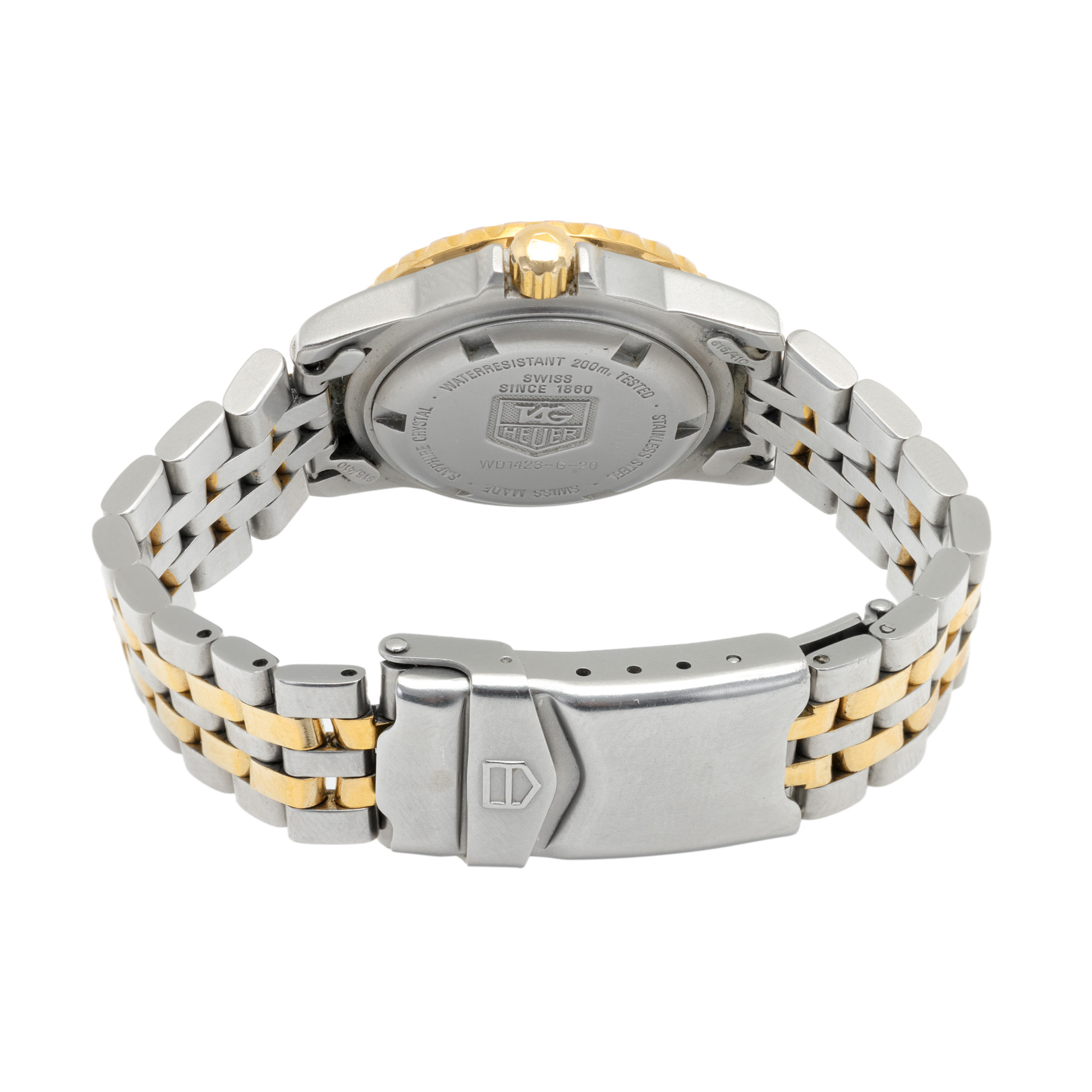 Ceas Tag Heuer Professional, de mână, de damă, referință WD1423 G20. Mecanism quartz. Cadran de culoare albastru, indici baghete și puncte, registru pentru dată în dreptul orei 3. Brățară originală, din oțel, cu sistem de închidere de tip deployant. Accesorii: zale suplimentare.