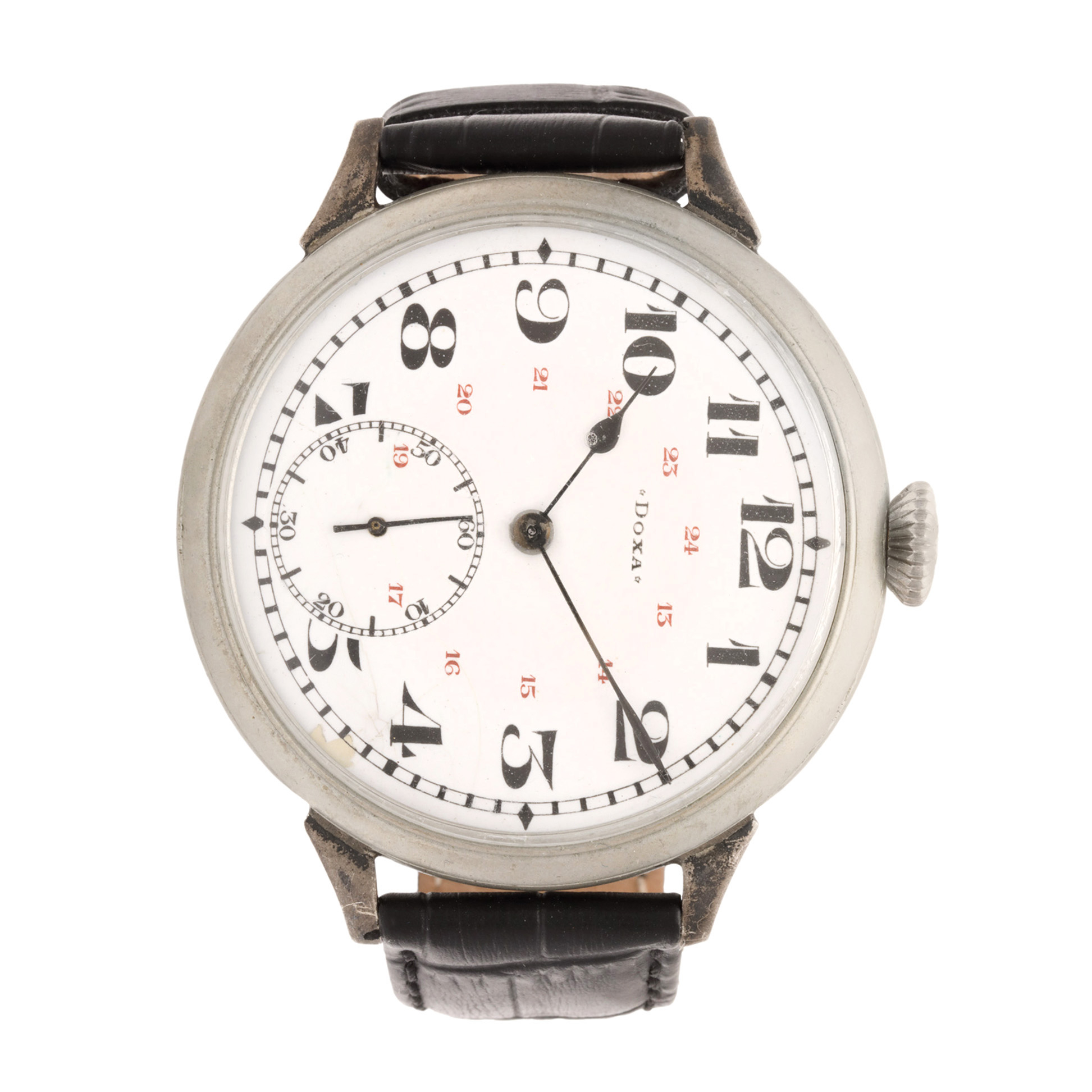 Ceas Doxa, de tip mariage (ceas de buzunar transformat în ceas de mână), bărbătesc. Mecanism cu armare manuală. Cadran de culoare alb, indici numerale arabe, registru pentru secundar în dreptul orei 6. Curea din piele, de culoare maro, adăugată aftermarket.