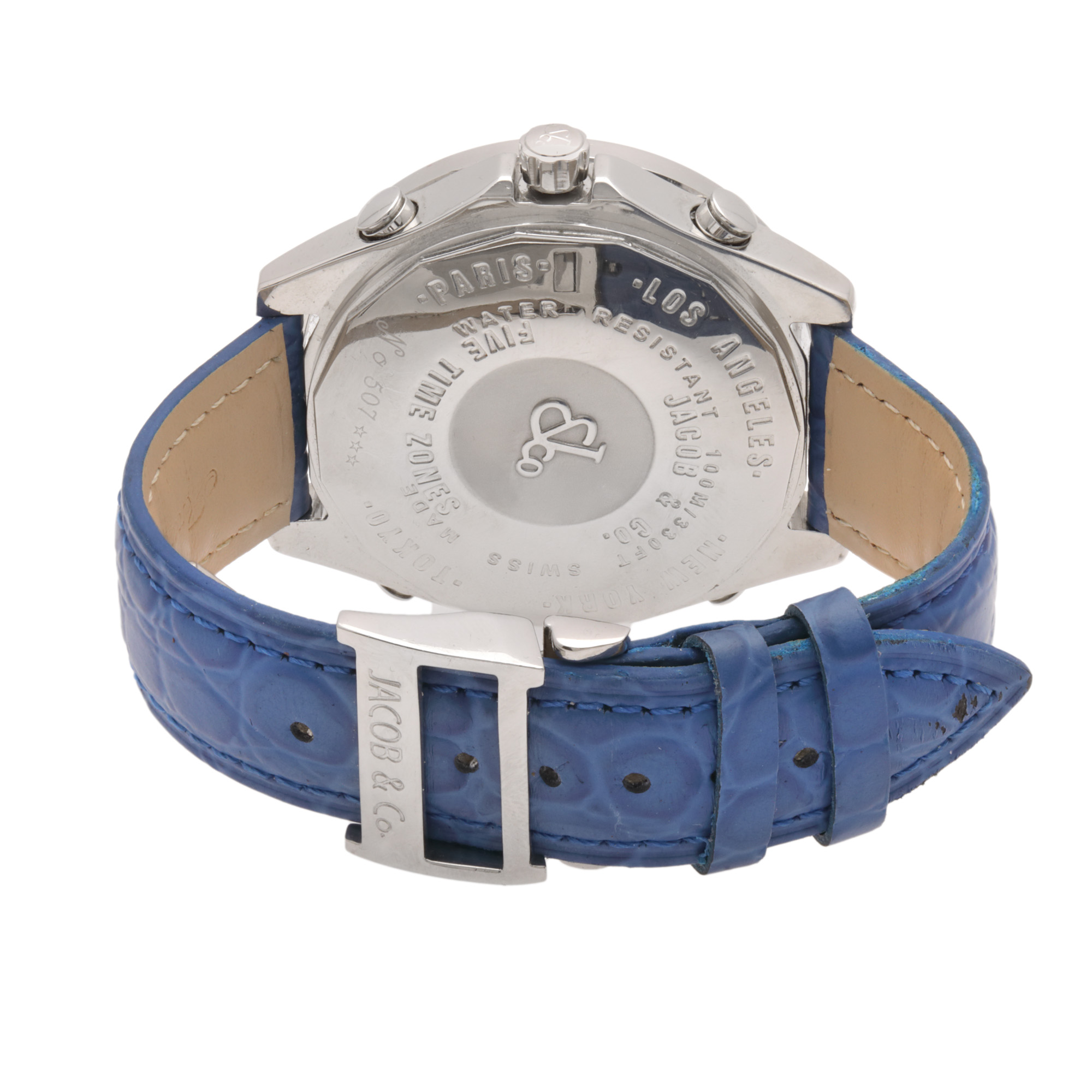 Ceas Jacob & co, Five Time Zones, din oțel, cu diamante, de mână, bărbătesc. Cinci mecanisme quartz, câte unul pentru fiecare fus orar, bezel fix, decorat integral cu diamante. Cadran de culoare gri, indici numerale arabe, cu patru registre pentru ora pe glob, pentru Los Angeles în dreptul orei 2, pentru Tokio în dreptul orei 4, pentru Paris în dreptul orei 8 și pentru New York în dreptul orei 10, cu registru pentru dată în dreptul orei 6. Curea originală, din piele, de culoare albastră, cu sistem de închidere de tip deployant.