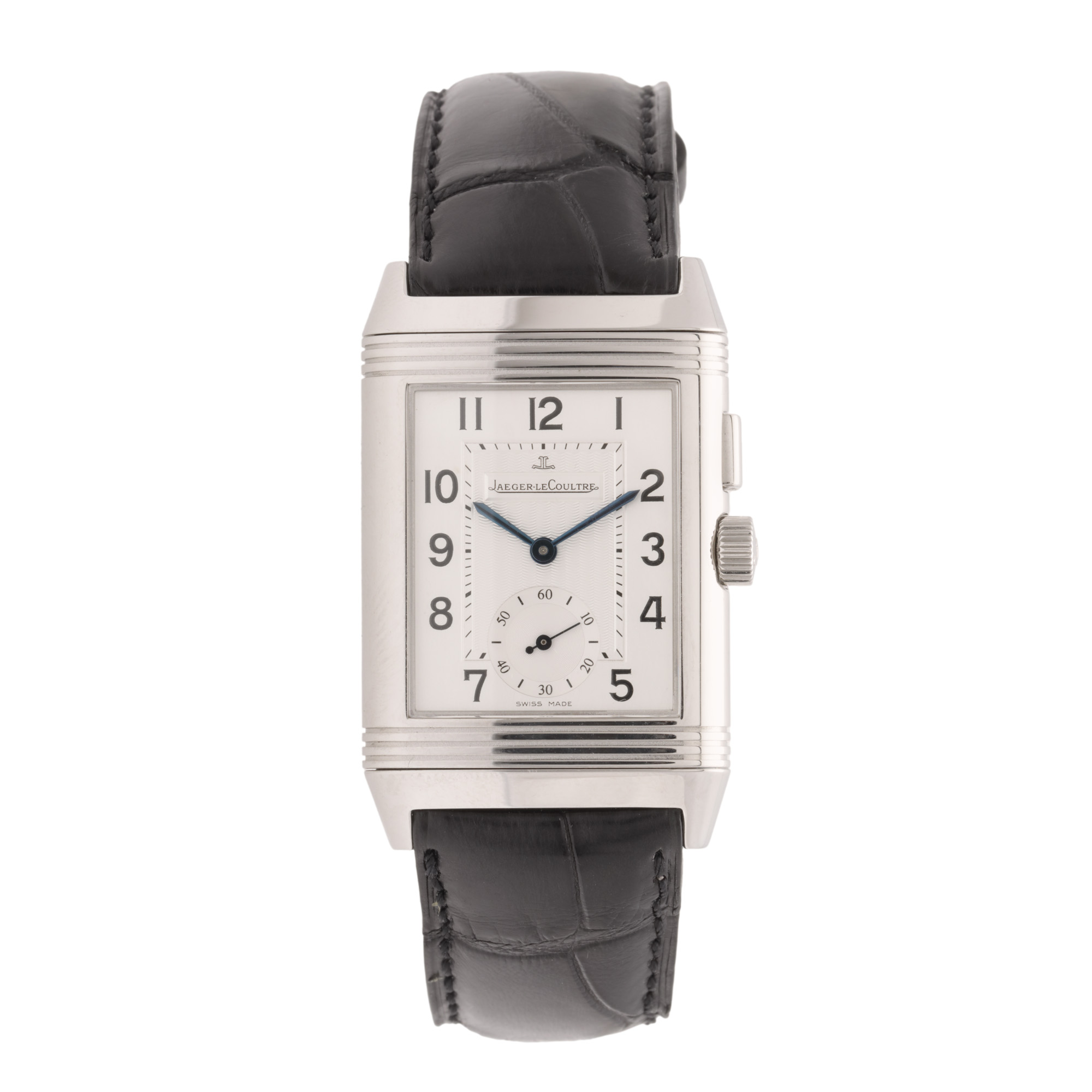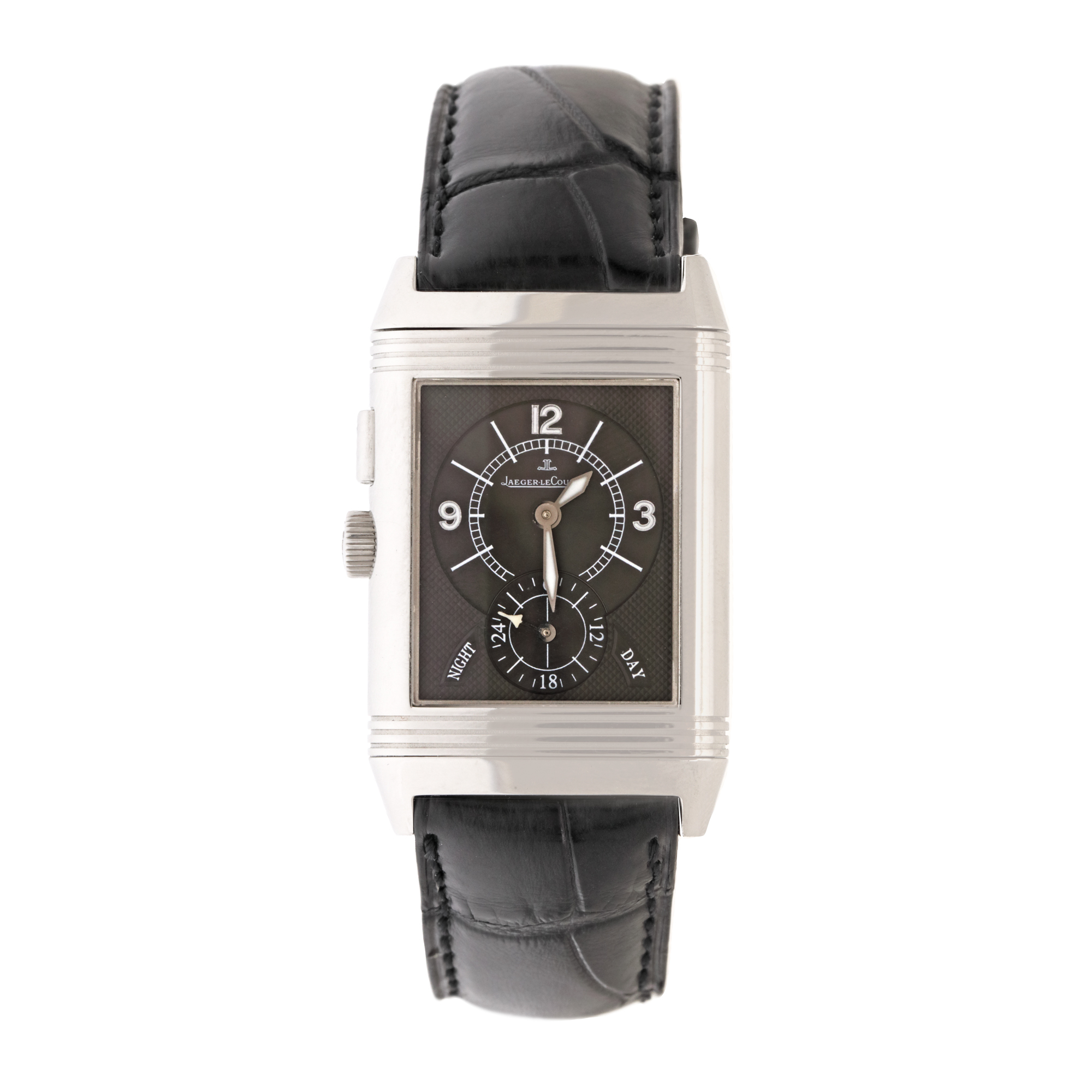 Ceas Jaeger LeCoultre Reverso Duoface, de mână, bărbătesc, referință 272.8.54. Mecanism cu armare manuală, calibrul JLC Cal. 854, cu două fețe. Cadran cu două fețe: cadran 1: de culoare alb, decorat în relief, indici cu numerale arabe, cu un registru pentru secundar în dreptul orei 6; cadran 2: de culoare negru, decorat în relief, indici cu numerale arabe pentru orele 12, 3 și 9, indici baghetă pentru restul orelor, cu un registru triplu pentru funcția de GMT și AM/PM în dreptul orei 6. Curea originală, din piele, de culoare neagră, cu sistem de închidere de tip deployant. AccesoriiL cutia originală, certificat de garanție, manual de instrucțiuni.