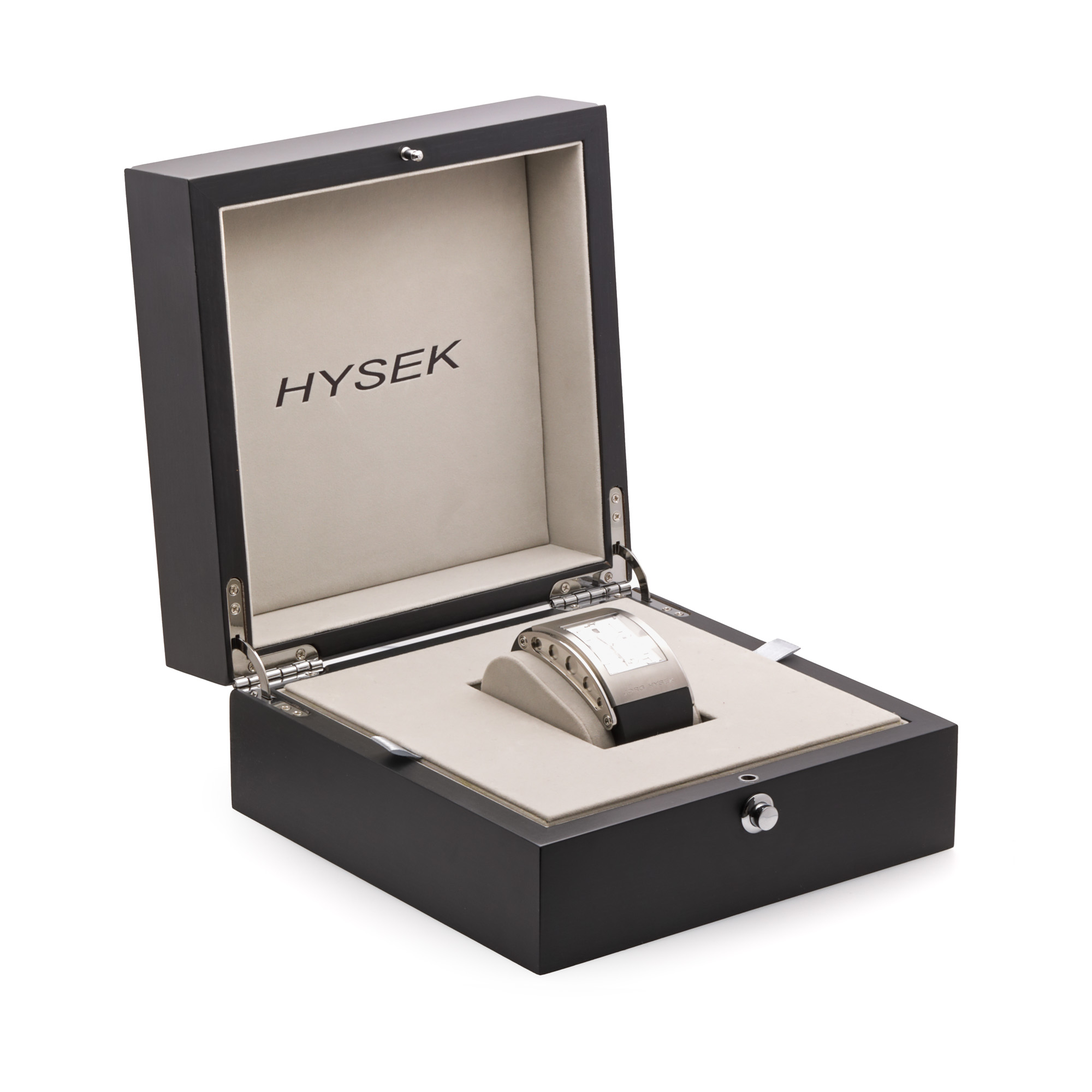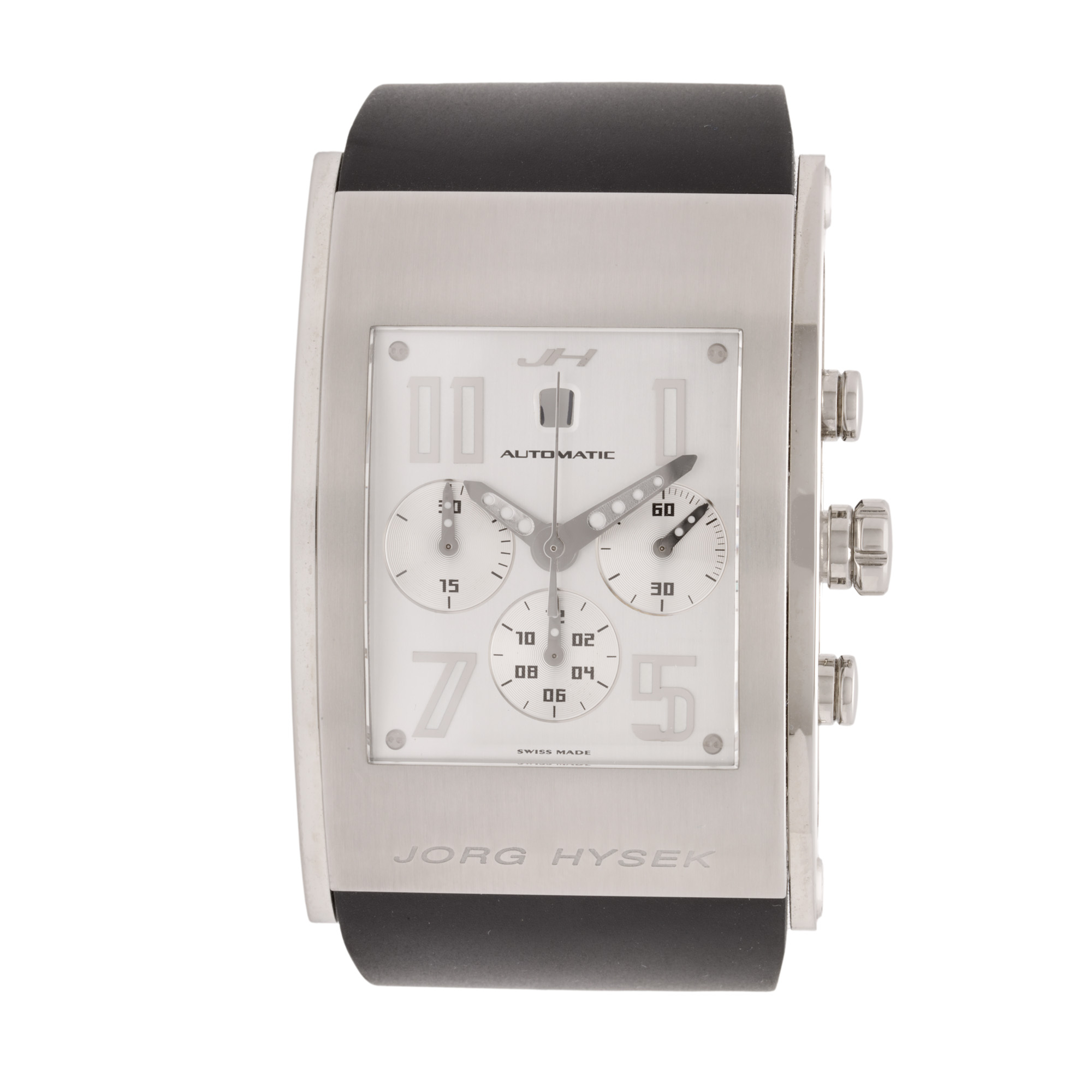 Ceas Jorg Hysek, de mână, bărbătesc, referință KI04. Mecanism automatic, calibrul 7750, cu funcție de chronograph. Cadran de culoare alb, carcasă curbată, indici cu numerale arabe pentru orele 1, 5, 7, 11, lipsit de indici pentru restul orelor, cu un registru pentru dată în dreptul orei 12, două registre pentru funcția de chronograph în dreptul orelor 3 și 6 și un registru pentru secundar în dreptul orei 9. Curea originală, din cauciuc, de culoare neagră, cu sistem de închidere de tip deployant. Accesorii: cutia originală.