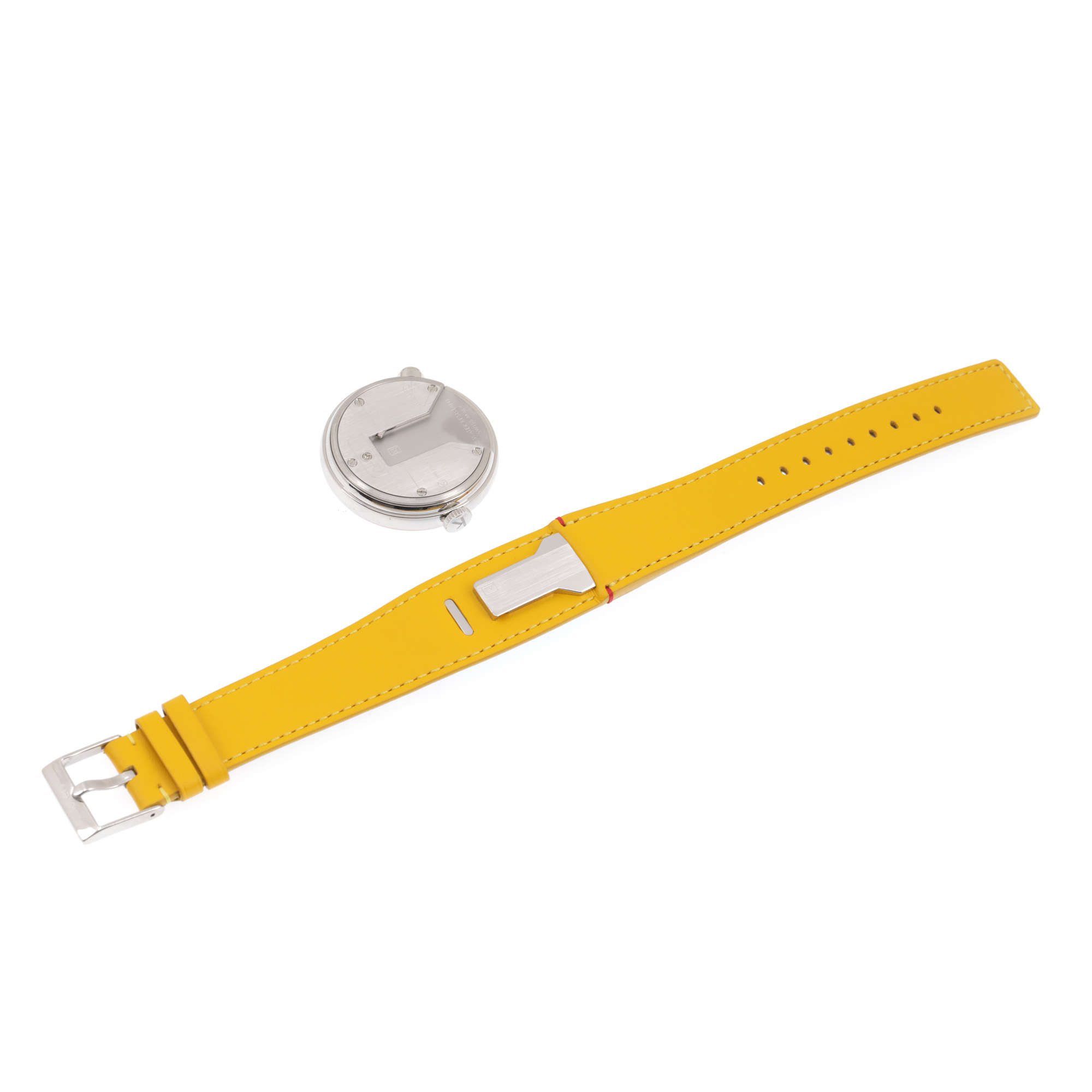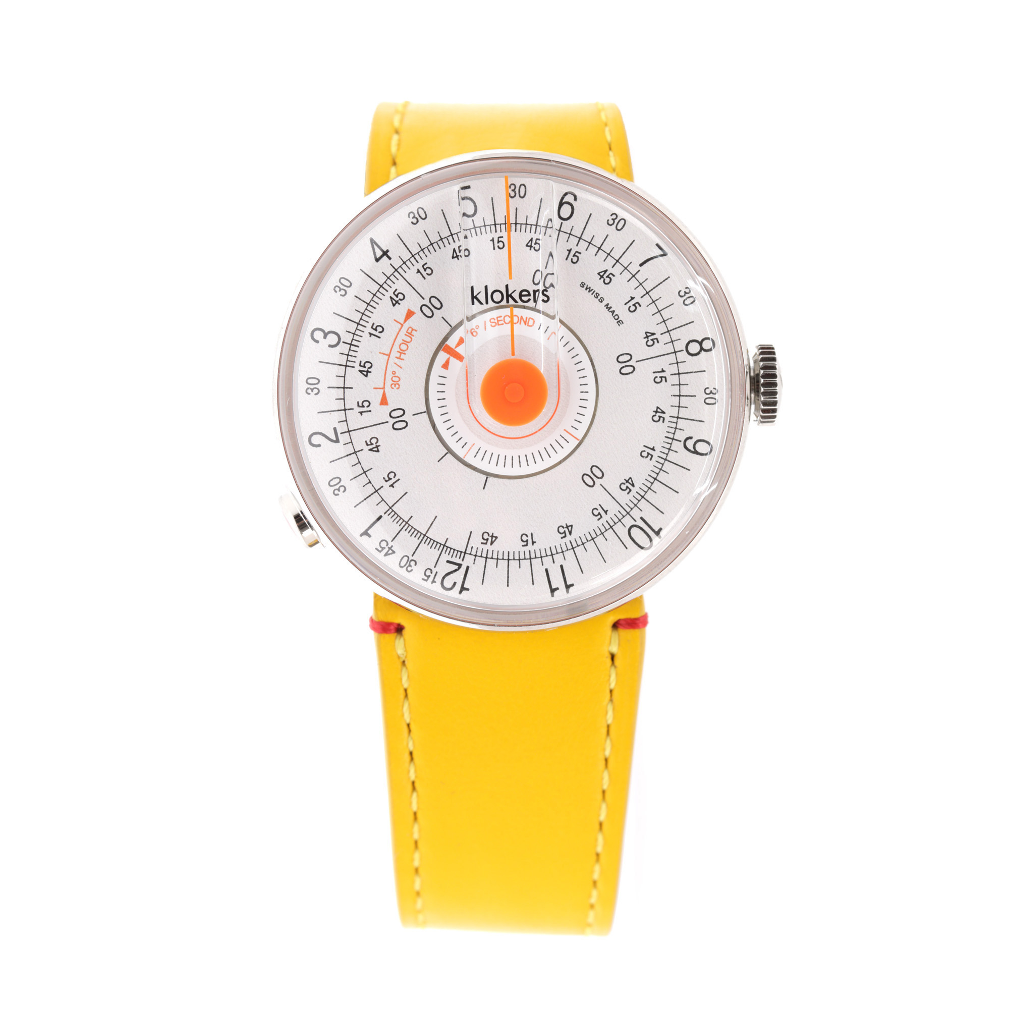 Ceas Klokers Klok 08 D2, nou, de mână, unisex, însoțit de cutia originală și certificat de garanție. Mecanism quartz. Cadran de culoare alb cu discuri rotative, indici numerale arabe. Curea originală, din piele, de culoare galbenă, cu sistem de închidere clasic cu cataramă.
