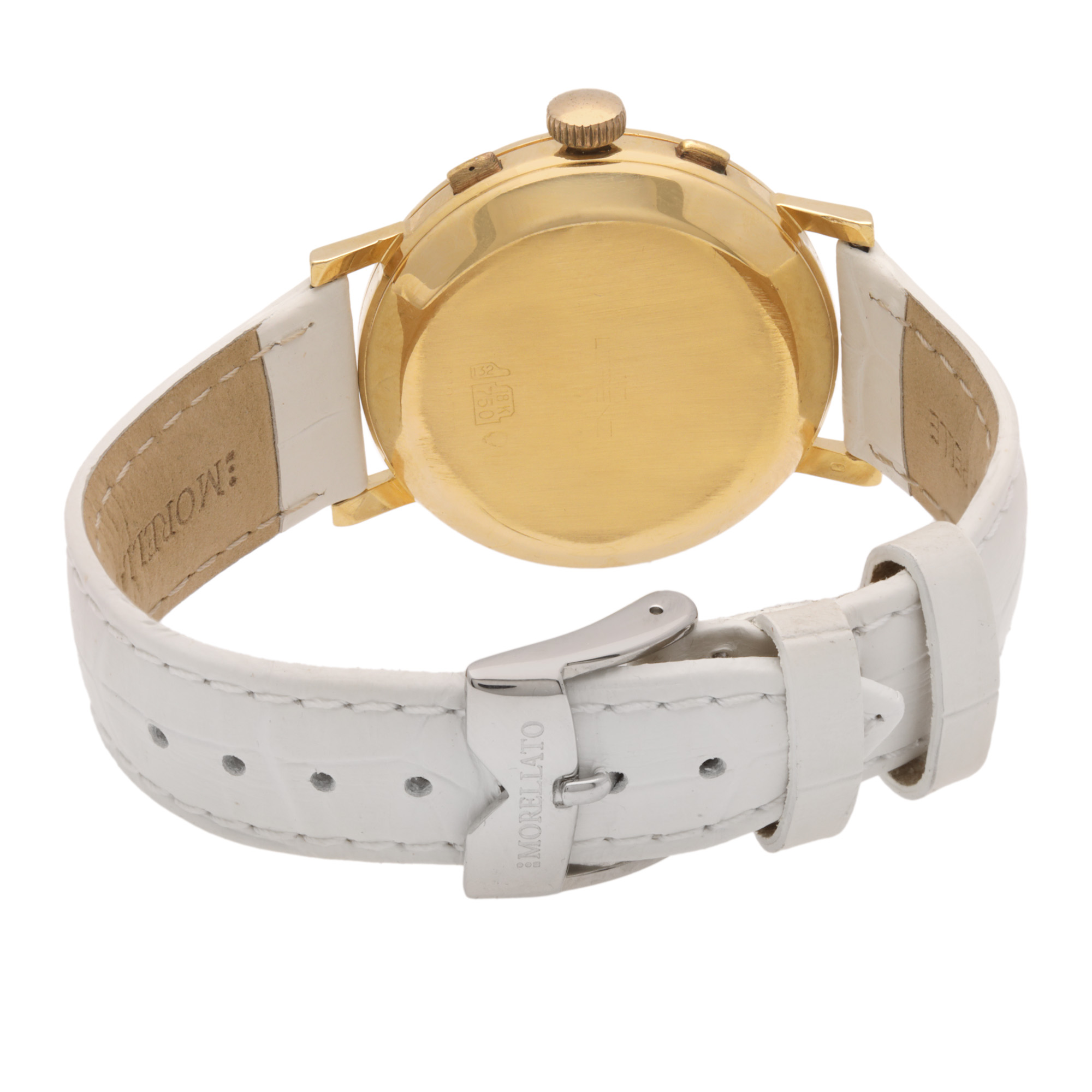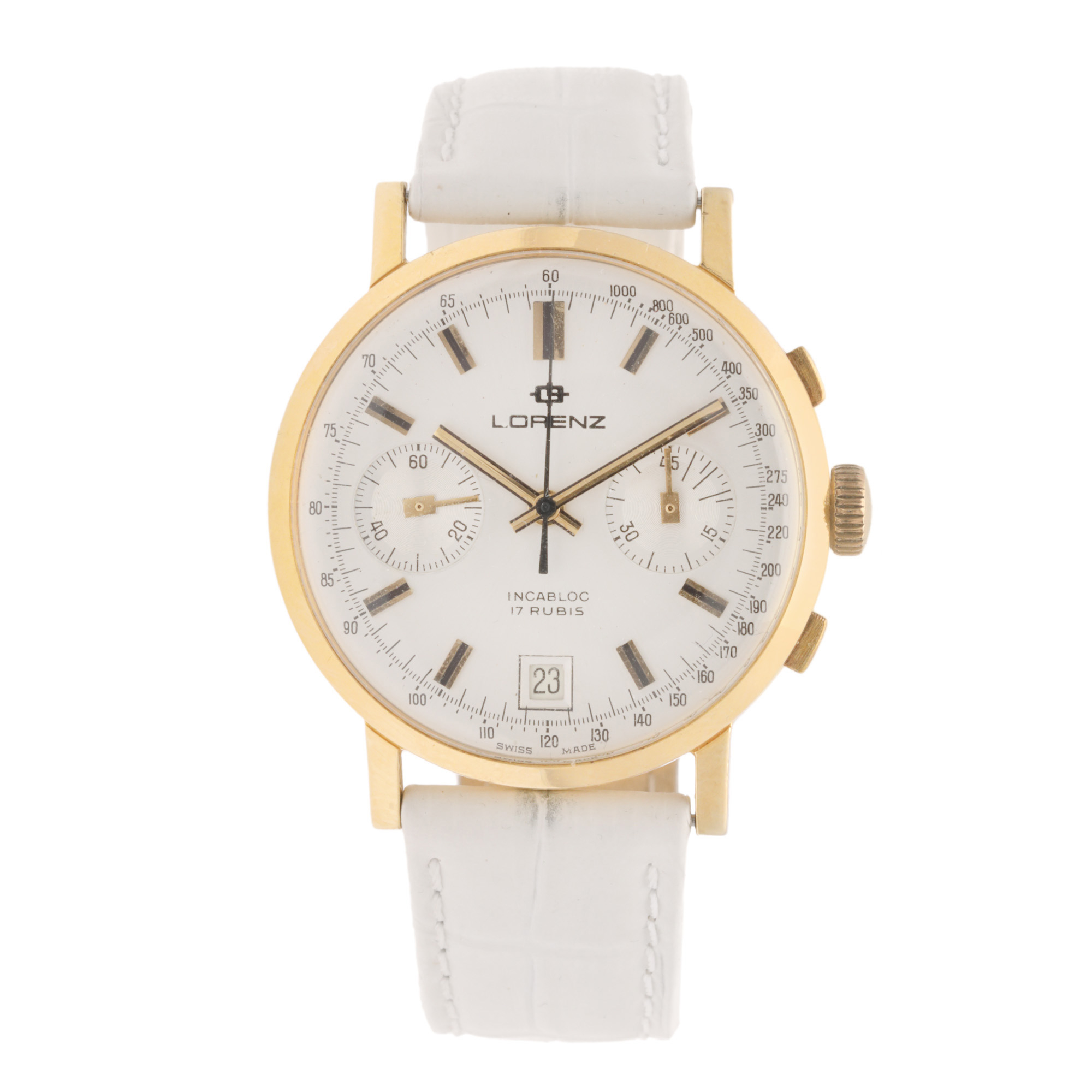 Ceas Lorenz, din aur, de mână, bărbătesc. Mecanism cu armare manuală, calibrul Landeron 189, cu funcție de chronograph. Cadran de culoare alb irizat, indici baghetă, cu un registru pentru funcția de chronograph în dreptul orei 3, un registru pentru dată în dreptul orei 6 și un registru pentru secundar in dreptul orei 9. Curea adăugată aftermarket, din piele, de culoare albă, cu sistem de închidere de tip clasic.