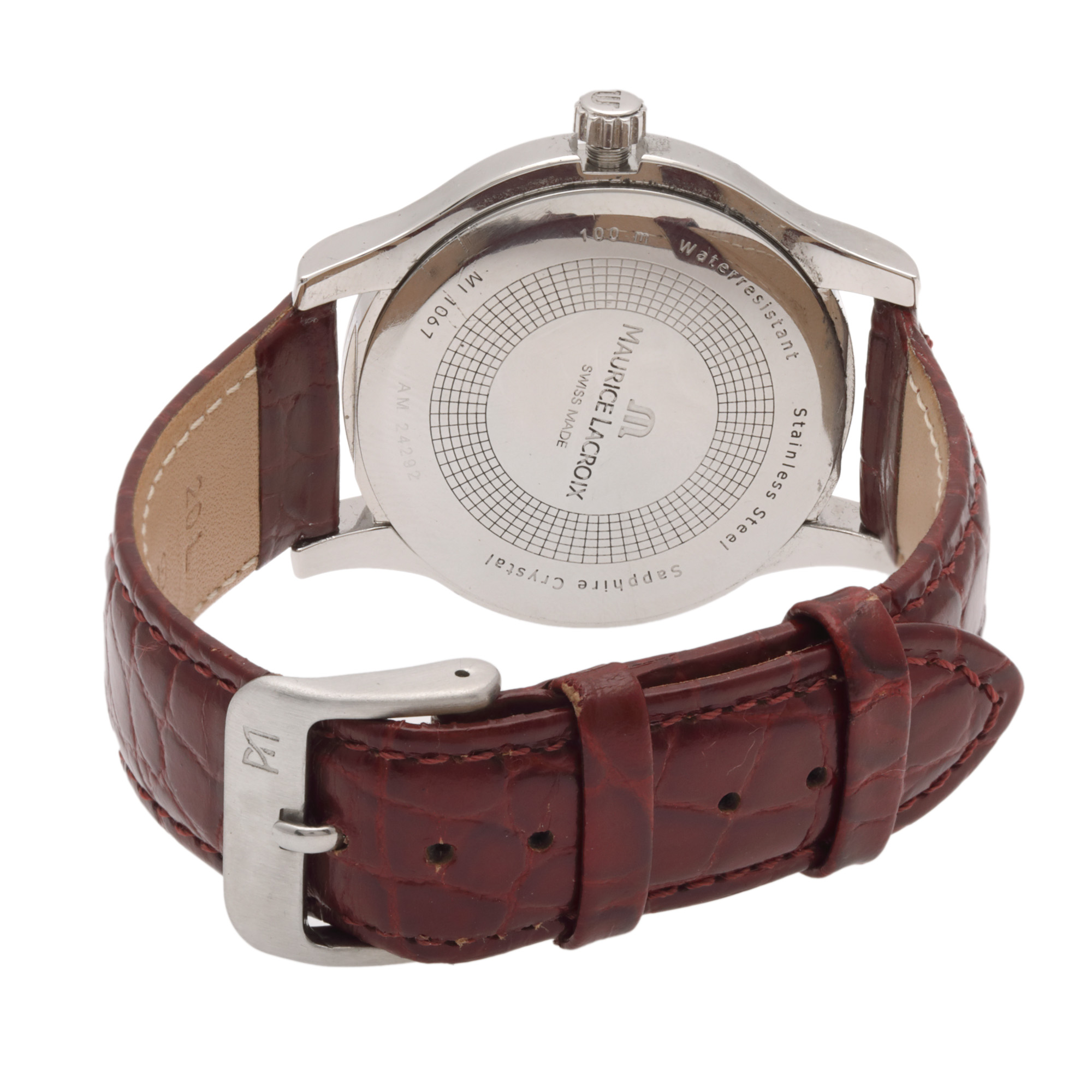 Ceas Maurice Lacroix Miros, de mână, bărbătesc. Mecanism cu armare manuală. Cadran de culoare alb cu indici numerale arabe pentru orele pare și baghete pentru cele impare. Curea adăugată aftermarket, din piele de culoare maronie, cu sistem de închidere clasic cu cataramă.