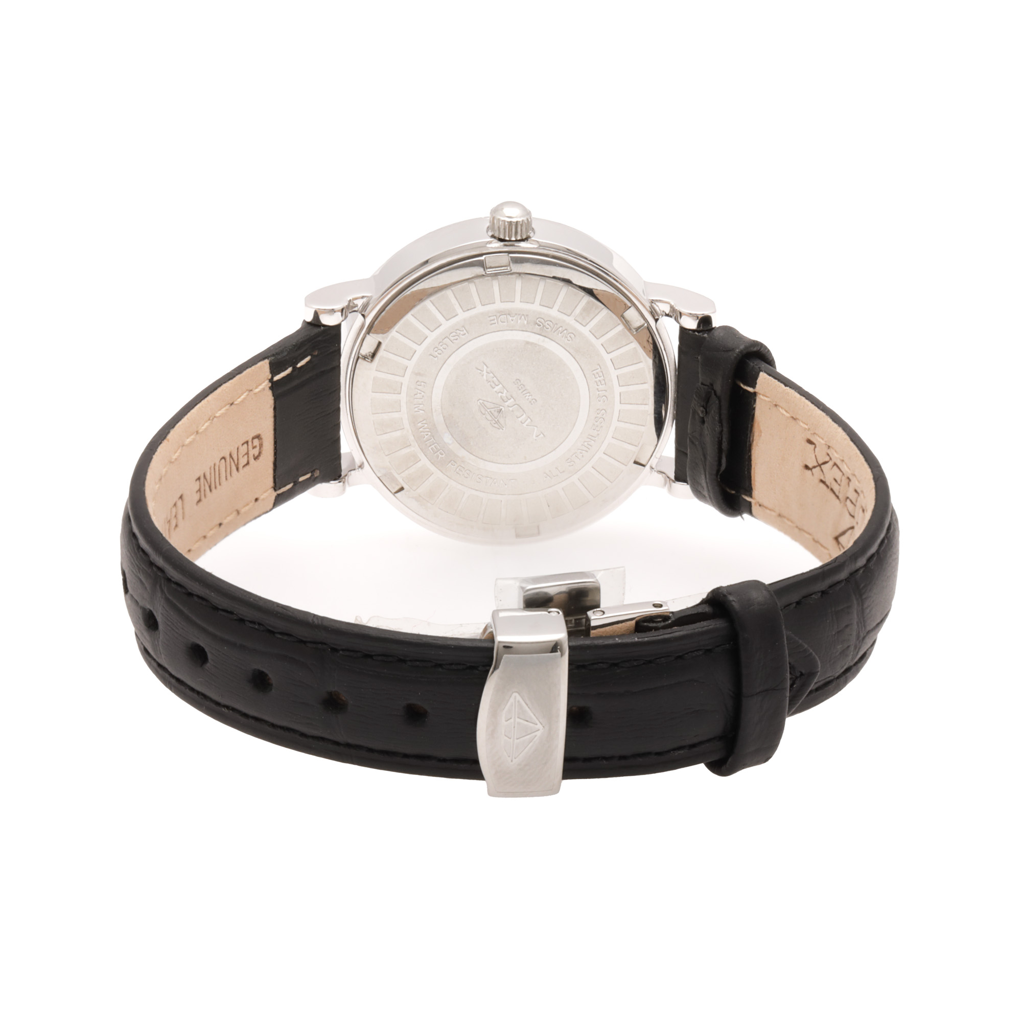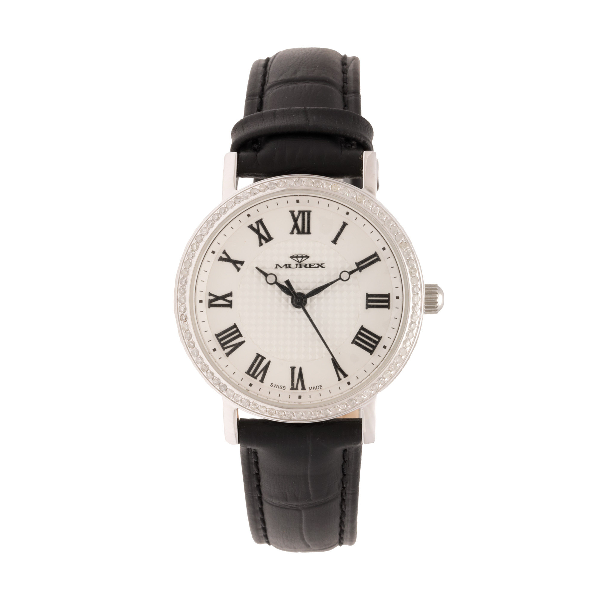 Ceas Murex D1, nou, cu diamante, de mână, de damă. Mecanism quartz, calibrul Ronda. Bezel fix decorat integral cu diamante. Cadran de culoare alb și argintiu, executat în tehnică guilloche, indici numerale romane. Curea originală, din piele, de culoare neagră, cu sistem de închidere de tip deployant. Accesorii: cutia originală, certificat de garanție și certificat de autenticitate pentru diamante.
