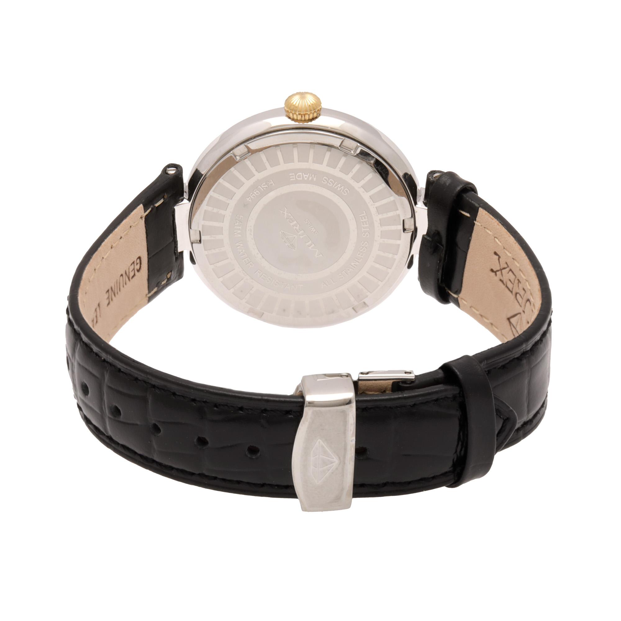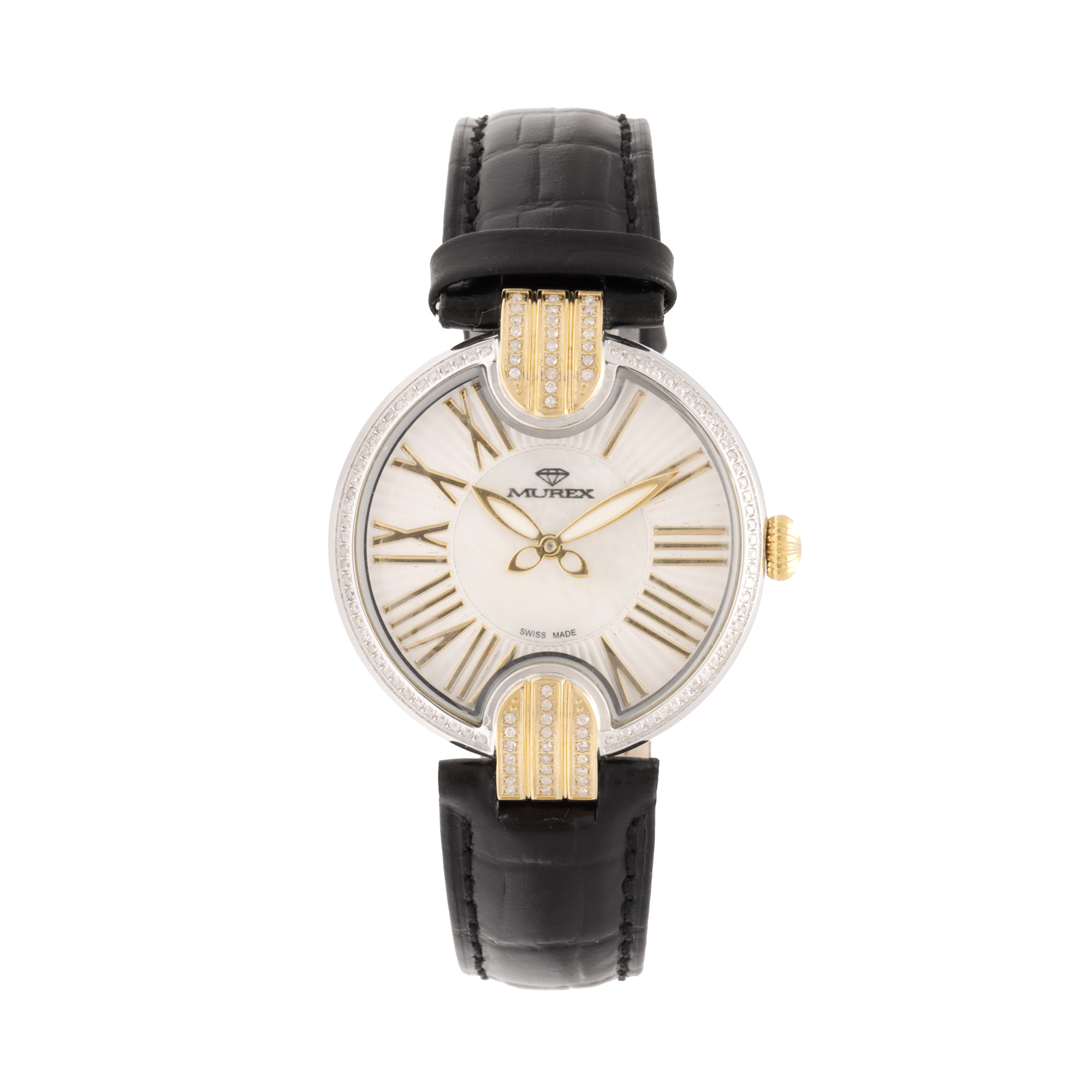 Ceas Murex Diamond, nou, cu diamante, de mână, de damă. Mecanism quartz, calibrul Ronda. Cadran din sidef de culoare alb, indici numerale romane, bezel și anse decorate cu 118 diamante. Curea originală, din piele, de culoare neagră, cu sistem de închidere de tip deployant. Accesorii: cutie originală, certificat de garanție și certificat de autenticitate pentru diamante