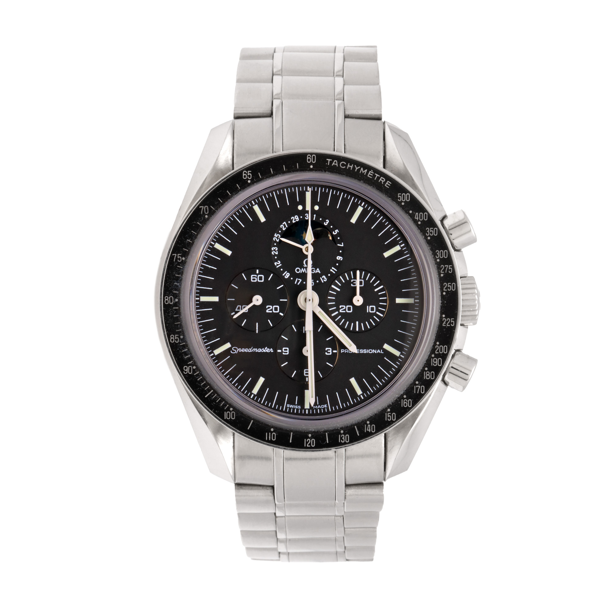 Ceas Omega Speedmaster Moonphase, de mână, bărbătesc, referință 3576.50.00. Mecanism cu armare manuală, calibrul 1866, cu 48 de ore de rezervă de mers, anterior vitrat. Cadran de culoare negru, cu un registru pentru calendar cu fazele lunii în dreptul orei 12, două registre pentru funcția de chronograph în dreptul orelor 3 și 6 și un registru pentru secundar în dreptul orei 9. Brățară originală, din oțel inoxidabil, cu sistem de închidere de tip deployant.